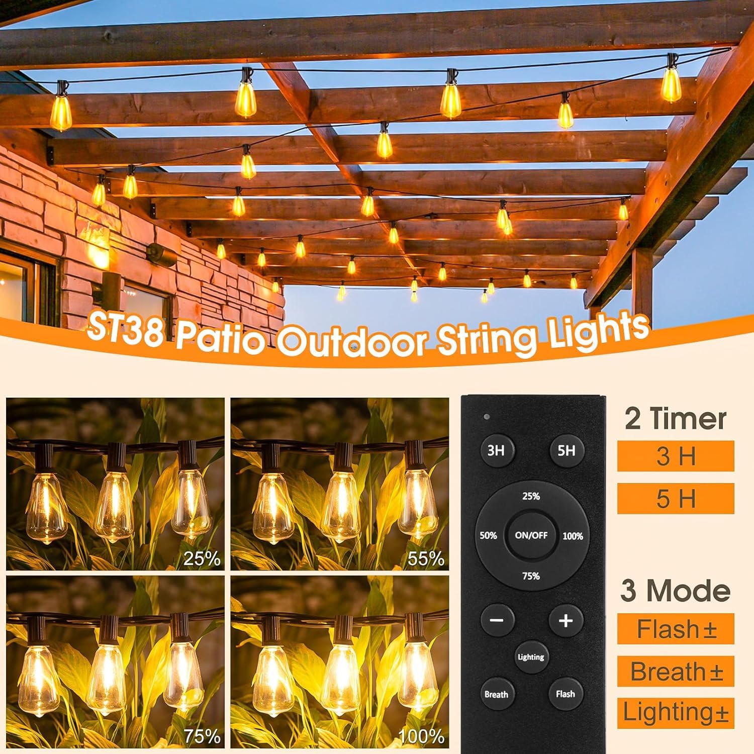 • Remote with Dimmable & Timer : You can DIY to create a warm and romantic atmosphere, bring you relaxation and happiness. Outdoor patio lights with remote have 4 levels of dimming (25%/50% /75% /100%)+Stepless dimming(0%-100%), no need to buy an extra dimmer. 3H/5H timer function, dutifully turn on/off daily after your set. 3 preset light modes (breath, flash, regular lighting)suitable for a variety of scenarios use, create a vintage effect or antique ambiance and romantic atmosphere