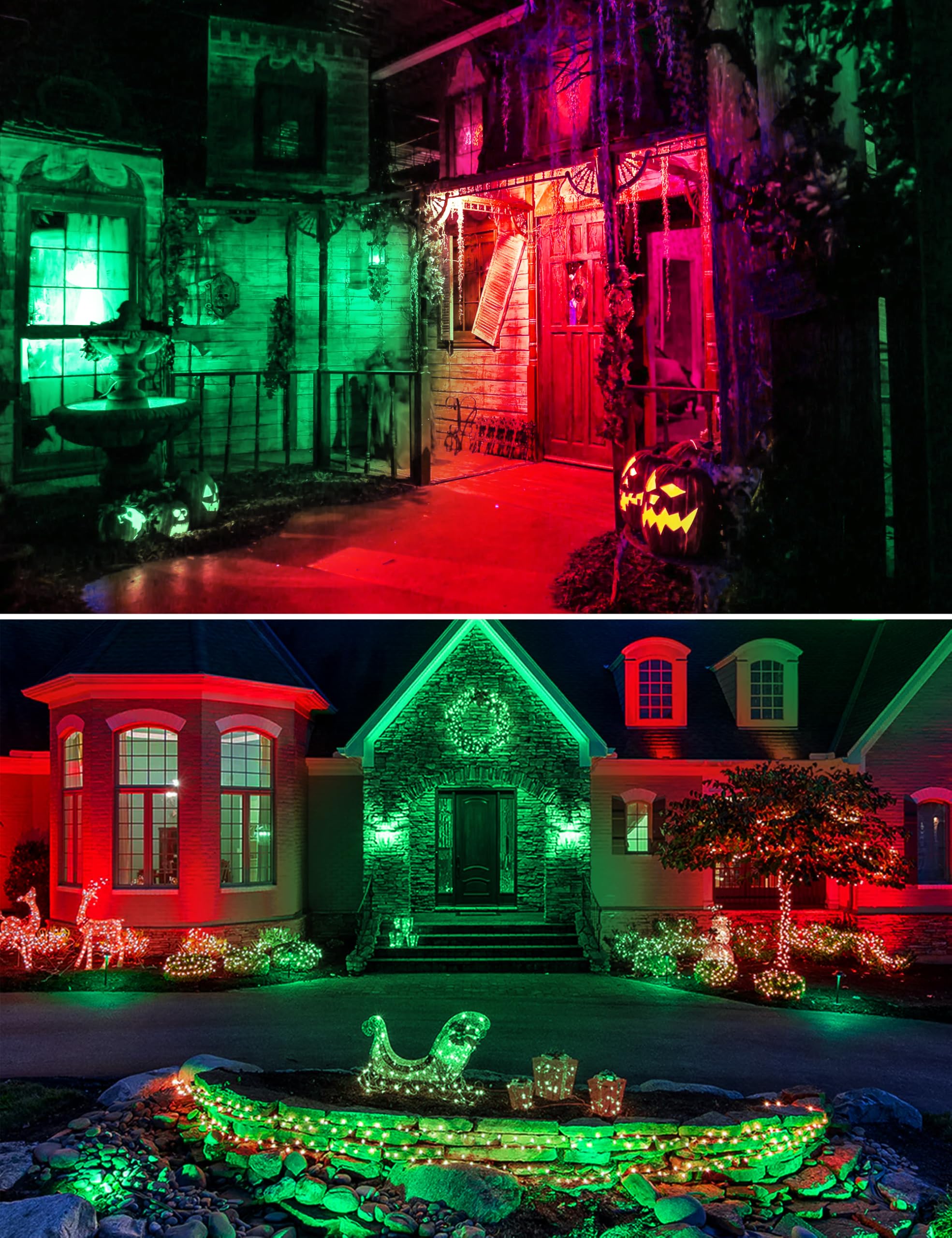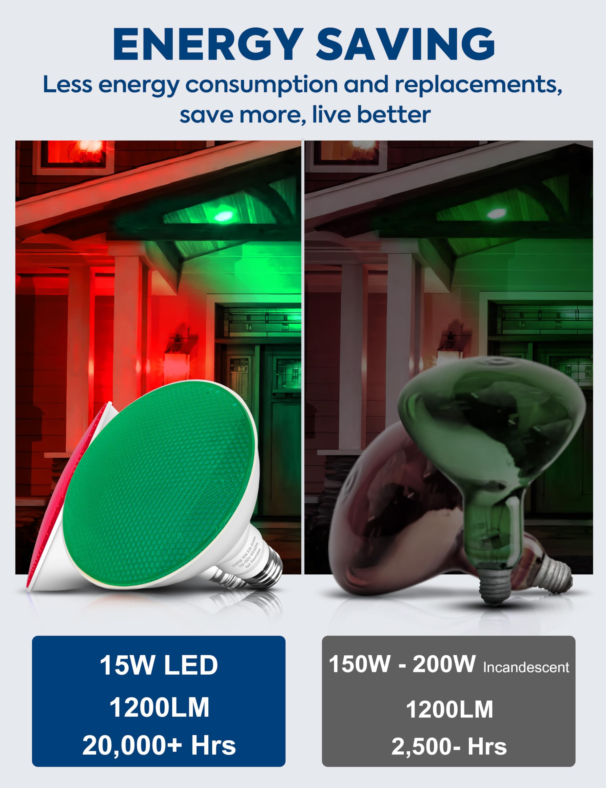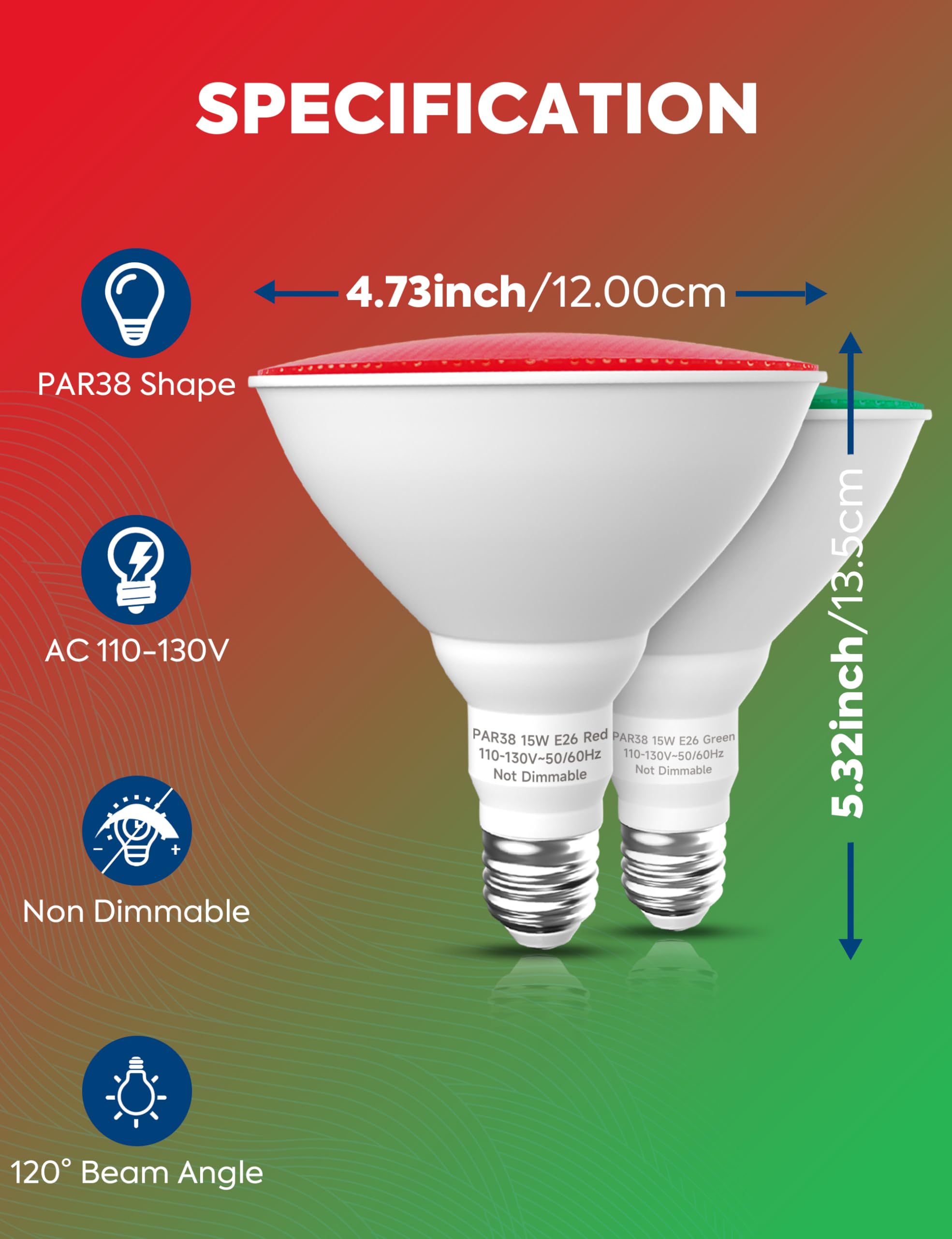 PAR38 Red Green LED Lights for Outside [Christmas Combo], 150W Flood Light Bulbs Equivalent, 15W 1200LM, Colored Outdoor Flood Light Bulb, E26 Base Not-dim for Christmas, Halloween, 2 Pack