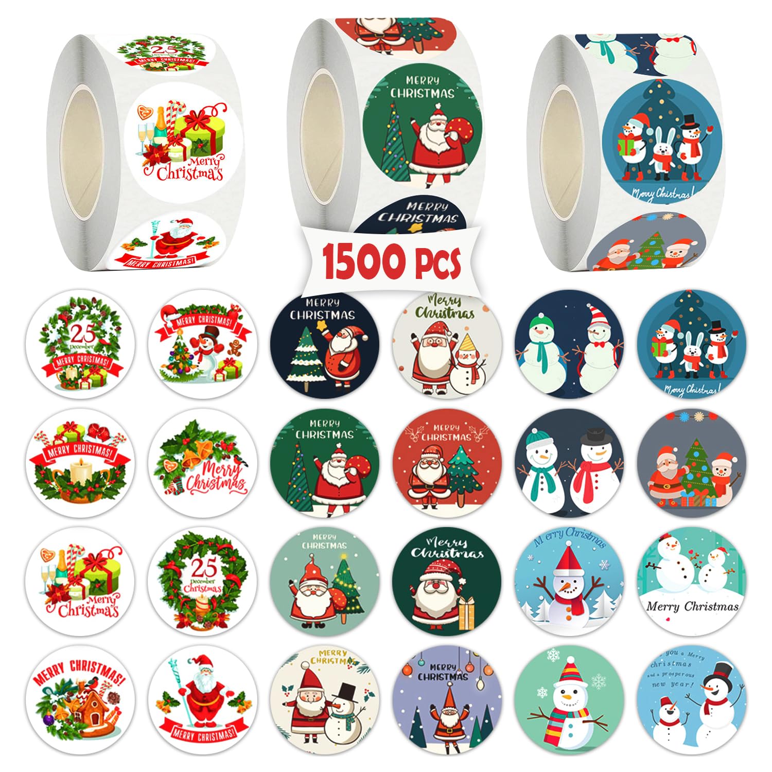 Partywind 1500 PCS Christmas Stickers for Kids, Self-Adhesive Holiday Decorative Stickers Labels for Christmas Decorations, Santa Snowman Stickers for Cards/Scrapbooking Decor (3 Rolls)