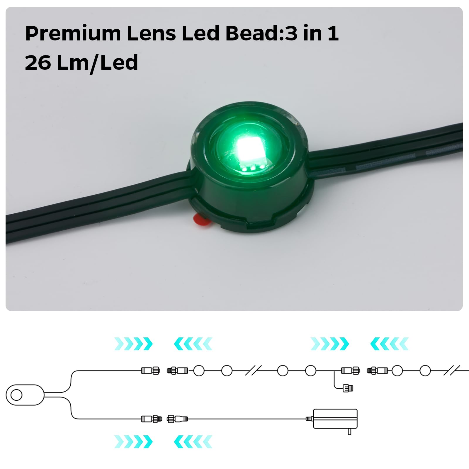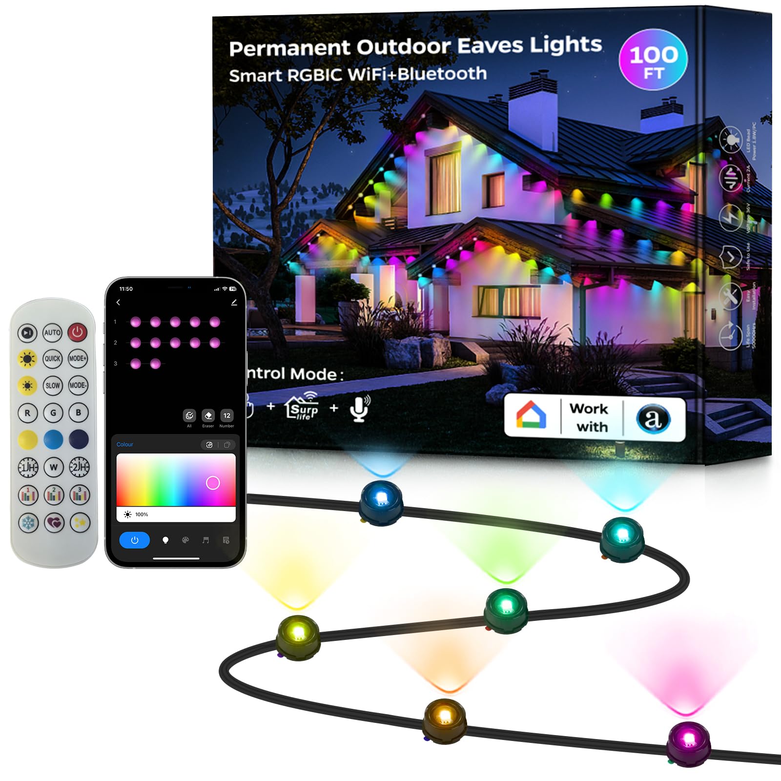 đăRGBIC Festive Lightingă: The permanent holiday outdoor lights provide 16 million colors and 54 scene modes, multiple music modes, DIY and timer function, suitable for every holiday theme choice. 30 lumens per light is bright enough to bring wonderful lighting effects to your home. (Warm Tip: Multiple sets of products will not work together in a connection, extension cords cannot be placed between the controller and the lights). đăCustomized Lighting lyă: You can individually control the color of each light through the coloring function with the app, turn off parts of the light string as needed through the delete function, and fill the entire light string with one color through the painting function. These permanent outdoor lights are the best choice for party, holiday, Halloween, Christmas, garden, backyard, wedding and play areas. The lens design reveals a elegant Fan-shaped lighting.