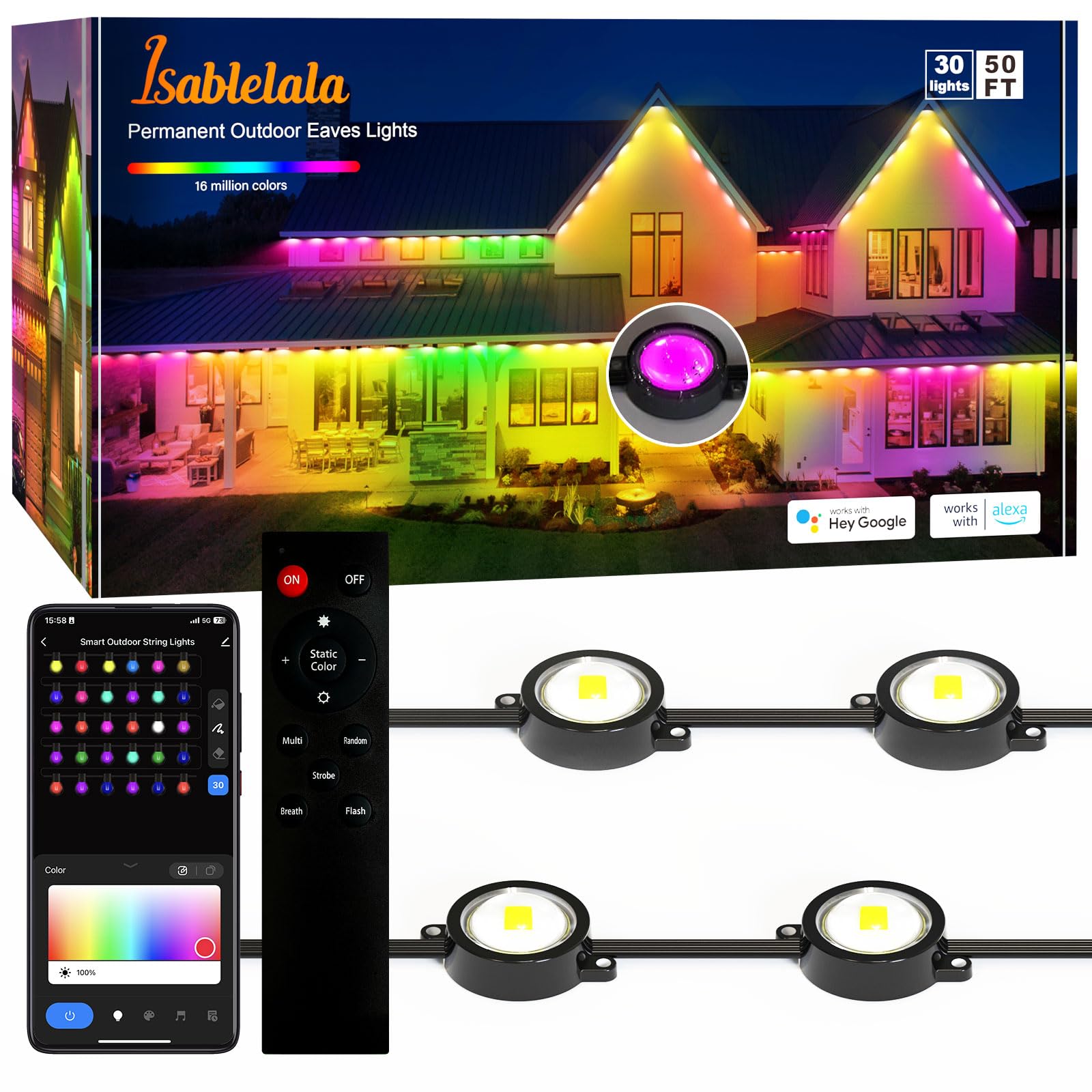 Permanent Outdoor Lights 50.5ft, RGB Smart Eaves Lights with 30 LED Lights, IP65 Waterproof Lighting House Lights Outdoor for Halloween, Christmas, Work with Alexa, Black