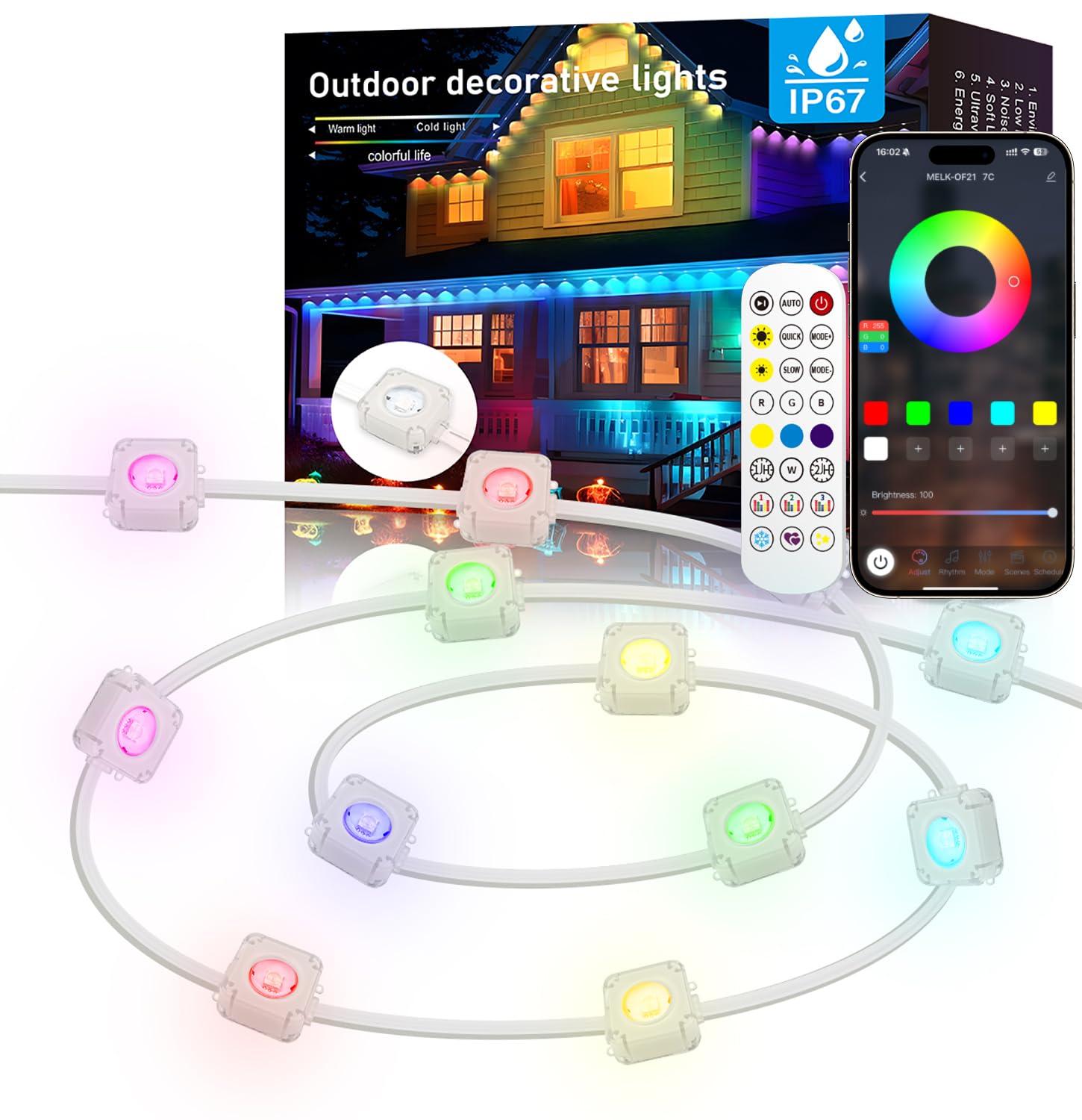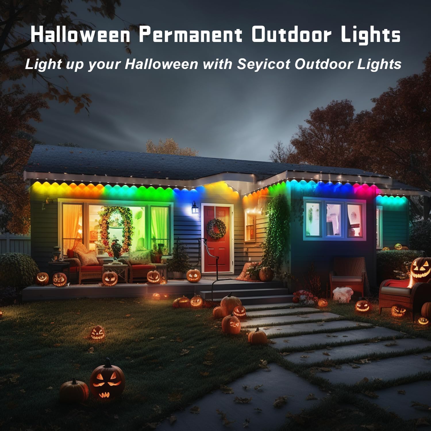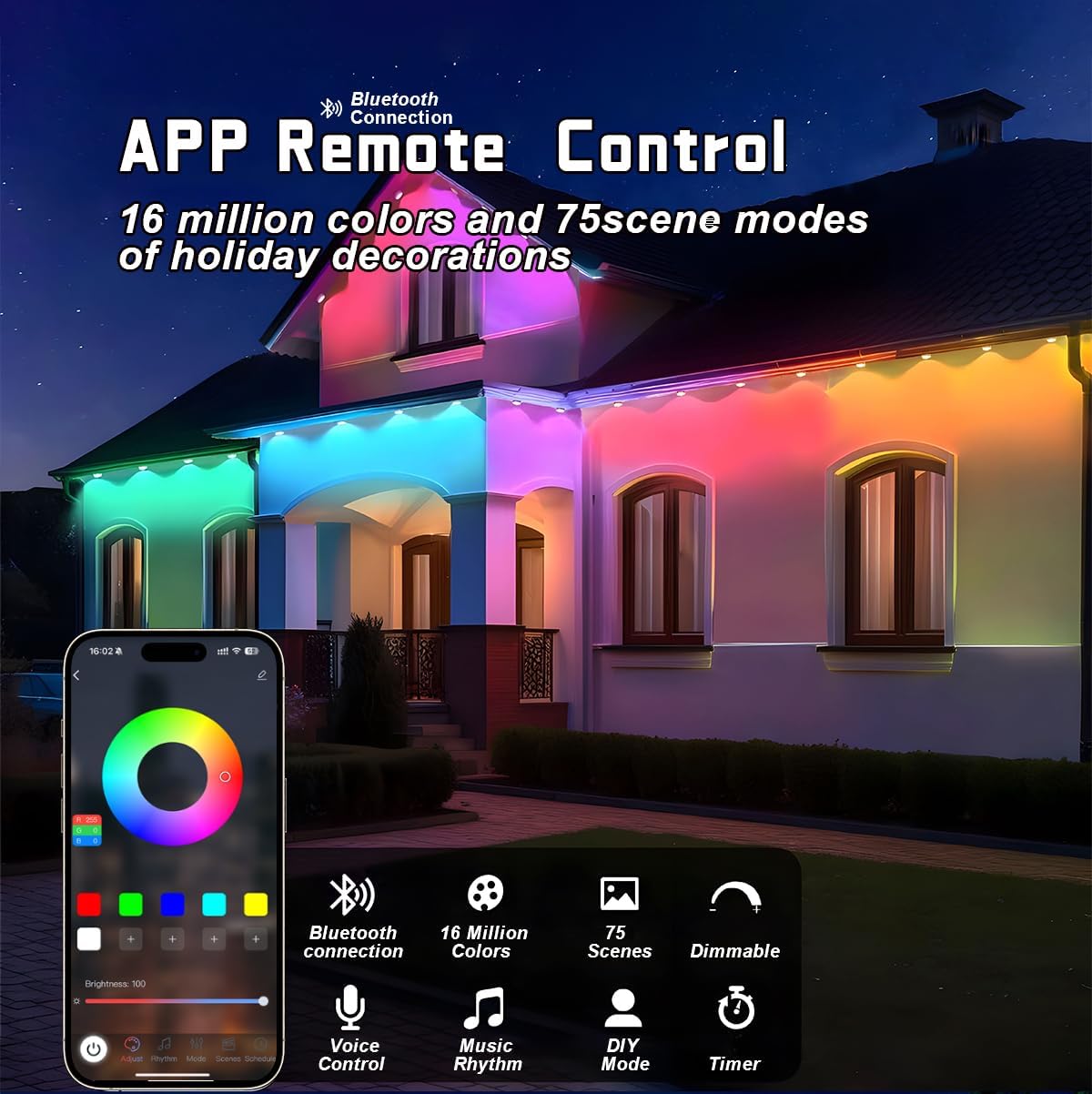 【Eye-Catching Lighting Effects】Use Seyicot permanent outdoor lights to perfectly match your home's exterior lighting and full spectrum of real, rich color scenes. The lens design presents a unique triangular lighting effect, presenting up to 75 scene modes, which is very suitable for Halloween lighting decorations, Christmas lighting decorations, parties, dances or daily lighting 【Smart Permanent Outdoor Lights】Smart APP and infrared remote control: 100ft LED outdoor light supports the application "Mocmo Home" and 2.4G remote control signal transmission infrared remote control for control. You can choose different modes, such as flashing, fast, strobe, gradient, etc. You can ly choose to control up to 16 million colors. It also supports timer switch, DIY your favorite light show mode, etc. All surprises are waiting for your exploration