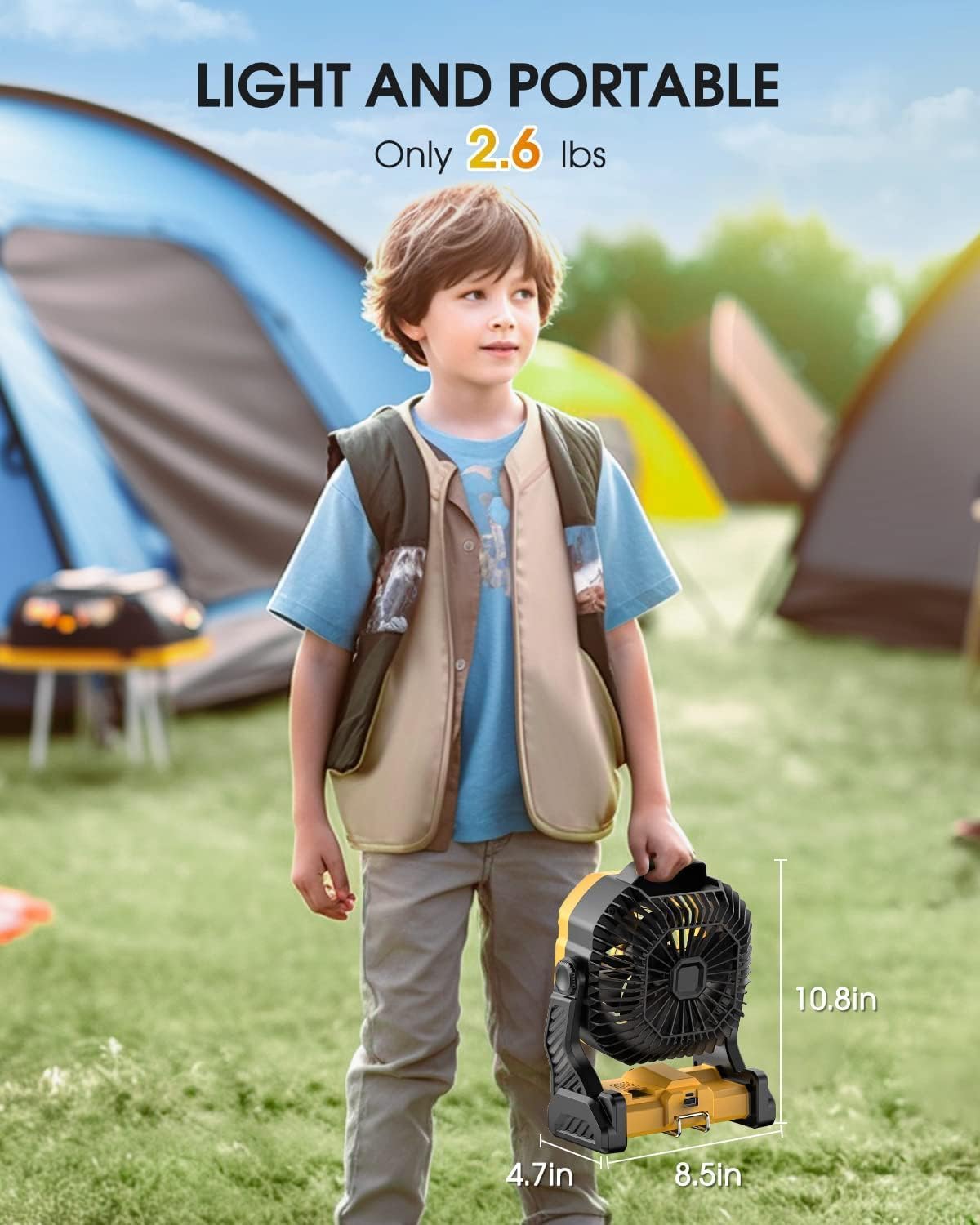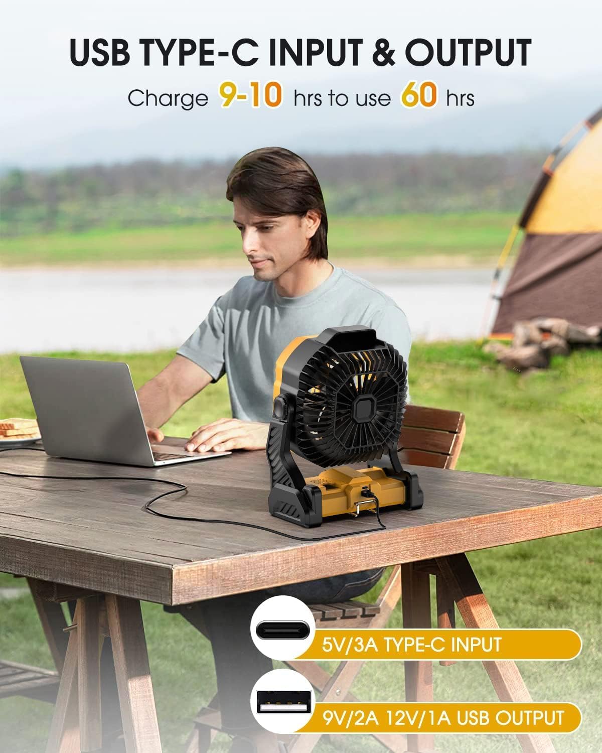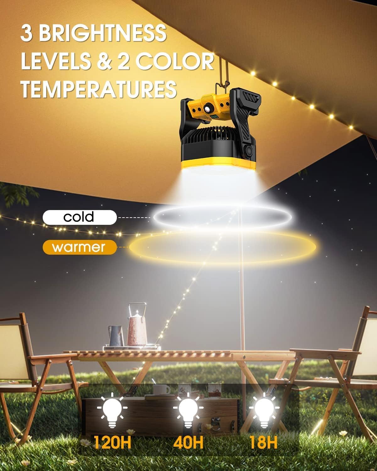 • 【Essential for Camping】This portable camping fan is equipped with a largecapacity battery of 20,000mah, dualcolor temperature lighting and supports 3 levels of brightness, five levels of wind speed, timing function, and a hanging device at the bottom, and is also equipped with USB A and Type C ports, which can be used Used as an emergency power supply for mobile phones, flashlights and laptops, it is an indispensable product for outdoor travel in summer.