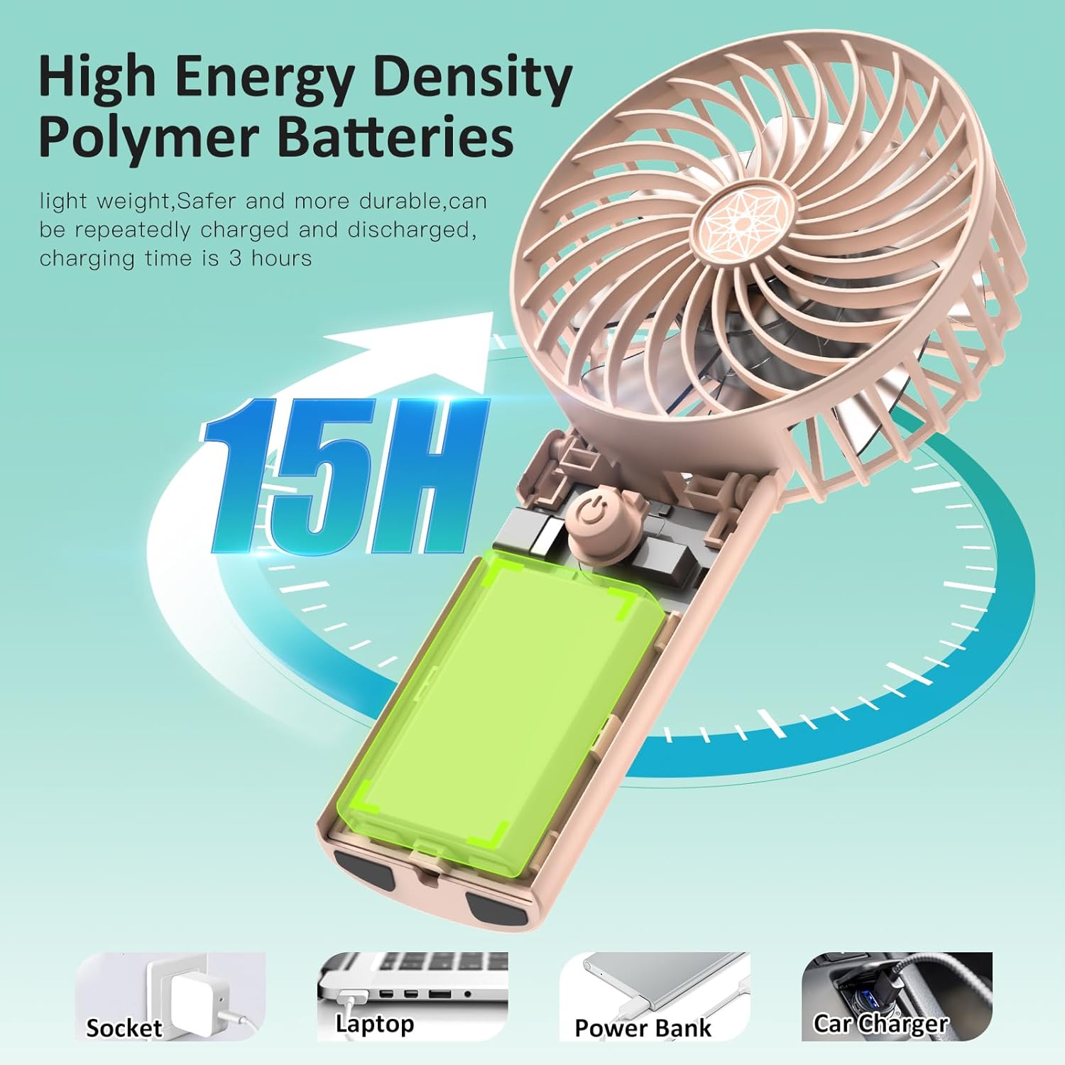 • 【15H Long Battery Life】Handheld fan using high energy density polymer batteries, light weight, long life, can be repeatedly charged and discharged, depending on the wind speed can provide 615 hours of continuous cooling, so you can enjoy a full day of cool comfort even in the outdoors.
