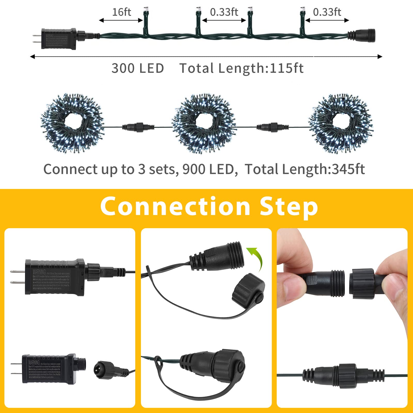 QUWIN White Christmas String Lights, 115Ft 300 LED UL 8 Modes with End-to-End Plug, Indoor & Outdoor Fairy Light for Christmas Tree, Patio, Wedding, Party (115Ft Cool White)