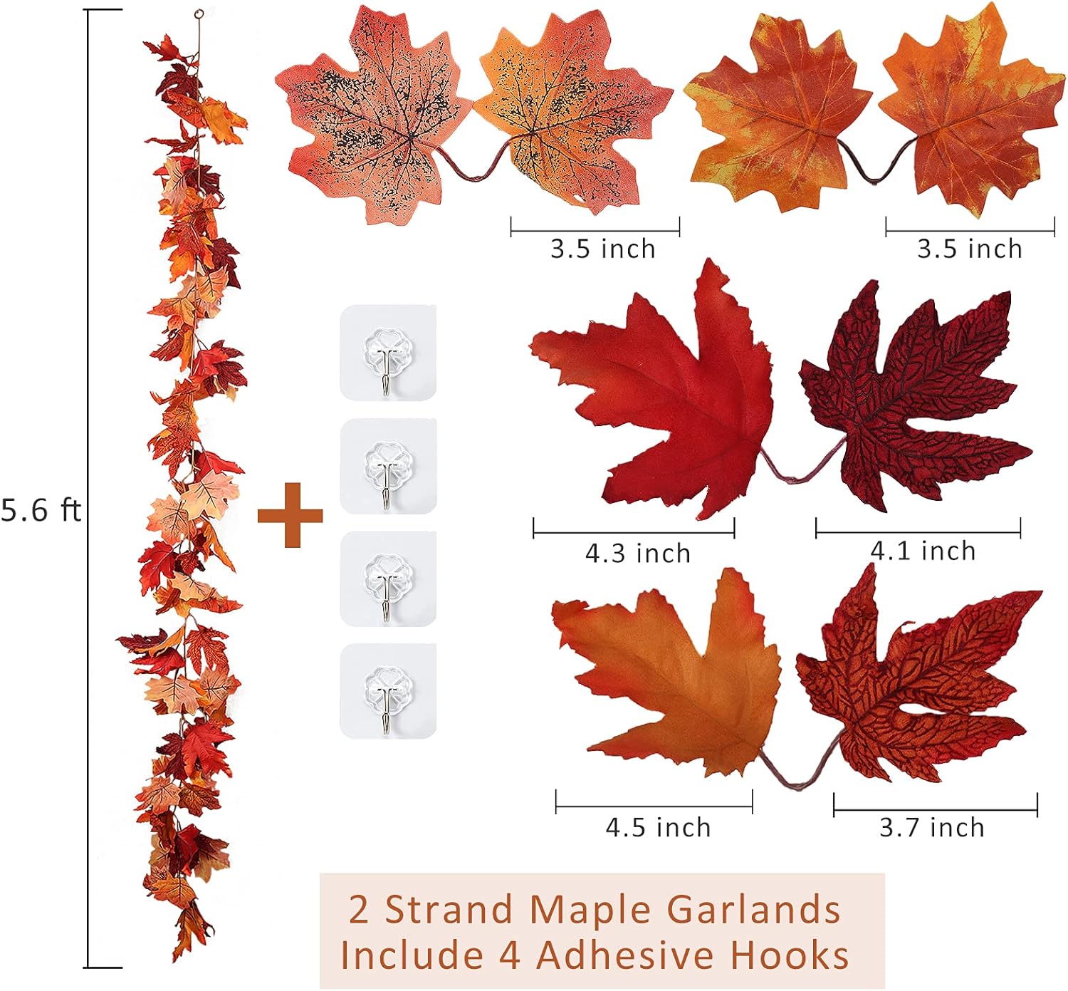Fall Garlands Quantity:2 strand of 5.6 feet artificial maple leaf garlands,56 pcs leaves, each length approx 3.4 inch, wide approx 3.4 inchFall Decorations for Home:The maple leaves garland are made of fabric material Silk and plastic high qualityPerfect for fall decorations for home,soft and durable, looks like the real fallen leaves have not scented, close to nature