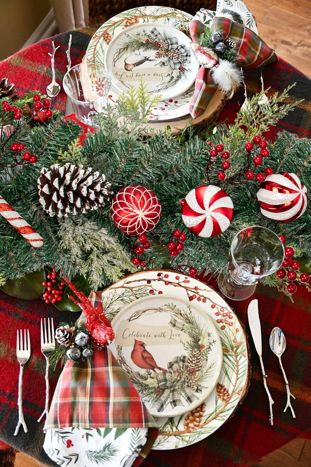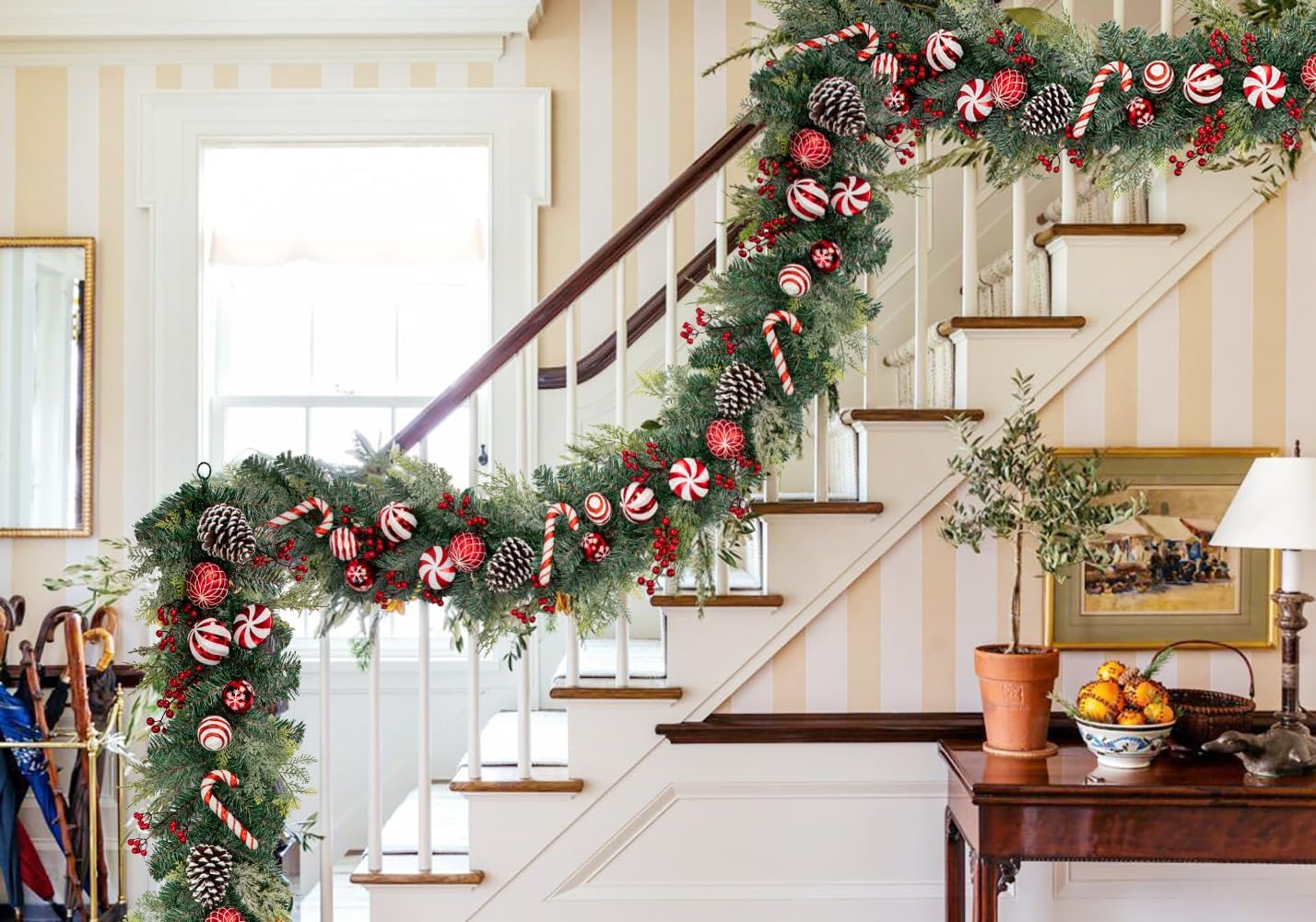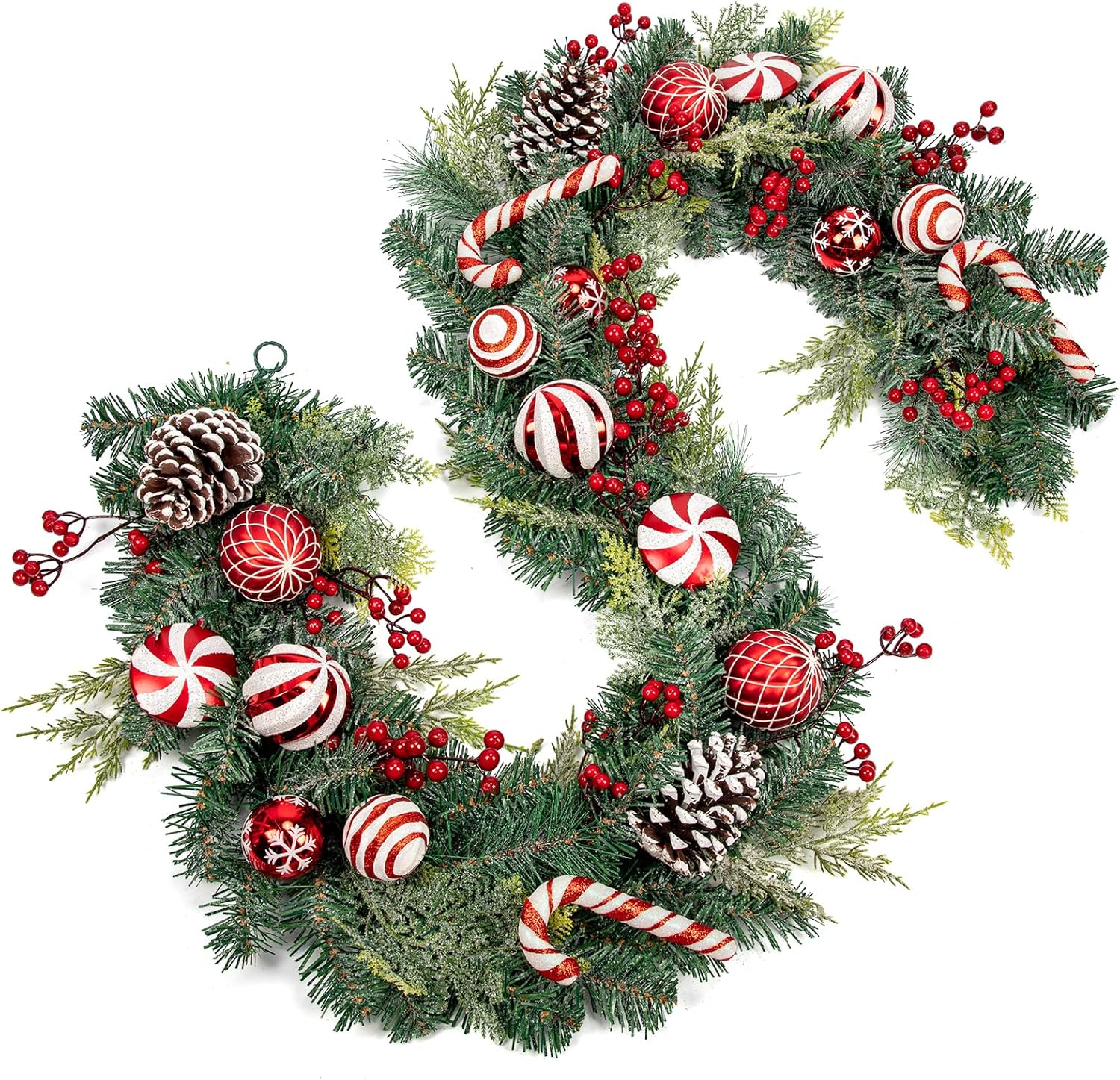Red and White Christmas Garland 6Ft Christmas Garland Ornaments with 15 Balls, 3 Pinecones, 3 Candy Canes, Doorway Garland Christmas Decorations for Fireplace Mantel Staircase Front Door Porch Holiday