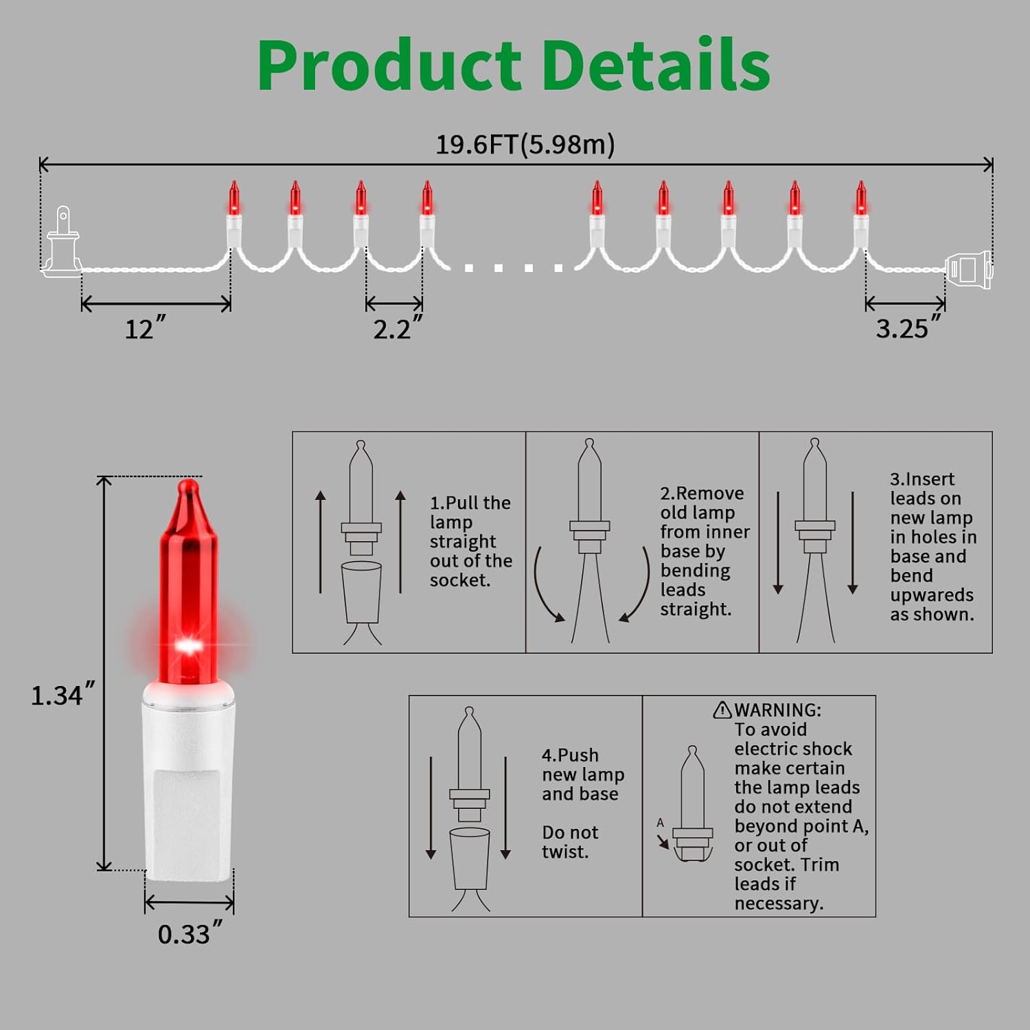 100 incandescent Christmas Lights: Old-fashion incandescent Christmas Red lights, creates a warm festive atmosphere, surely lights up your room and house. A warm welcome sign at night to make your home a wonderful sight for your neighborsWhite Wire Decorative Lights: Decorate with 100 Yellow incandescent mini lights with white wire will give a soft festive feel to your Christmas. Each bulb space 2.5in, 2.5V and 0.425W per bulbs, built-in 3A fuse for safe use. Extra bulbs and fuses are included.