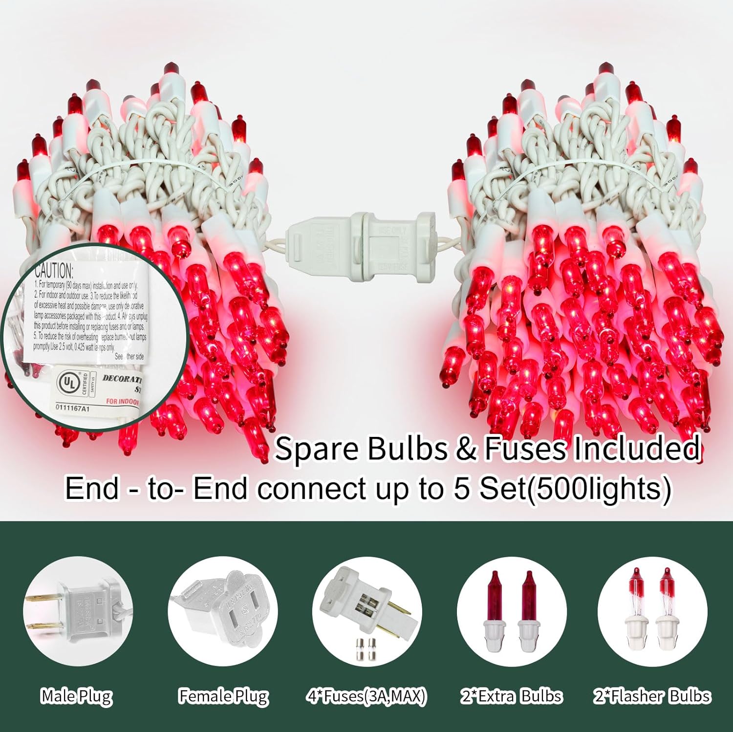 • End-to-end Connectable Lights: Each mini Christmas light set comes with end-to-end plug, can be connectable up to 5 sets (500 lights) . High quality UL products ensure the safety of you and your family.