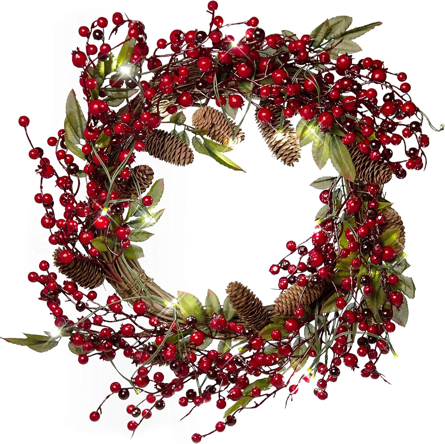 Red Co. 22” Light-Up Christmas Wreath with Red Cranberries, Pinecones & Leaves, Battery-Operated LED Lights with Timer