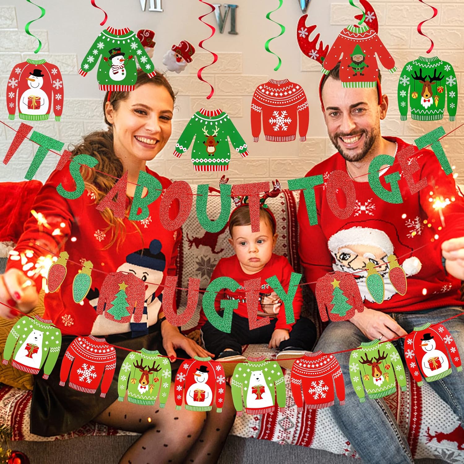 Red Green Its about to Get Ugly Banner and Ugly Sweater Garland Ugly Christmas Sweater Party Banner for Ugly Sweater Party Decorations, Ugly Christmas Sweater Party Supplies
