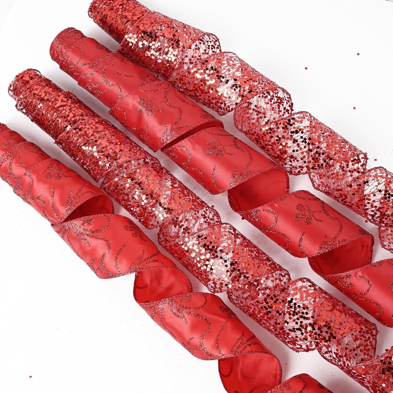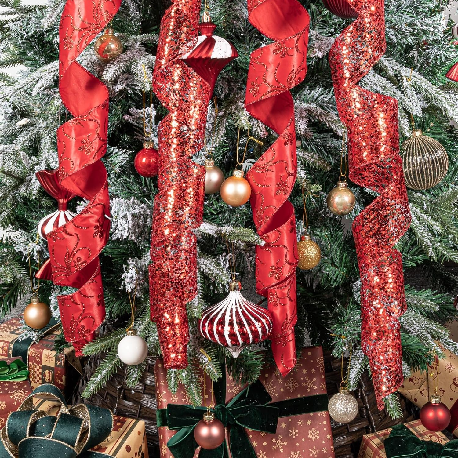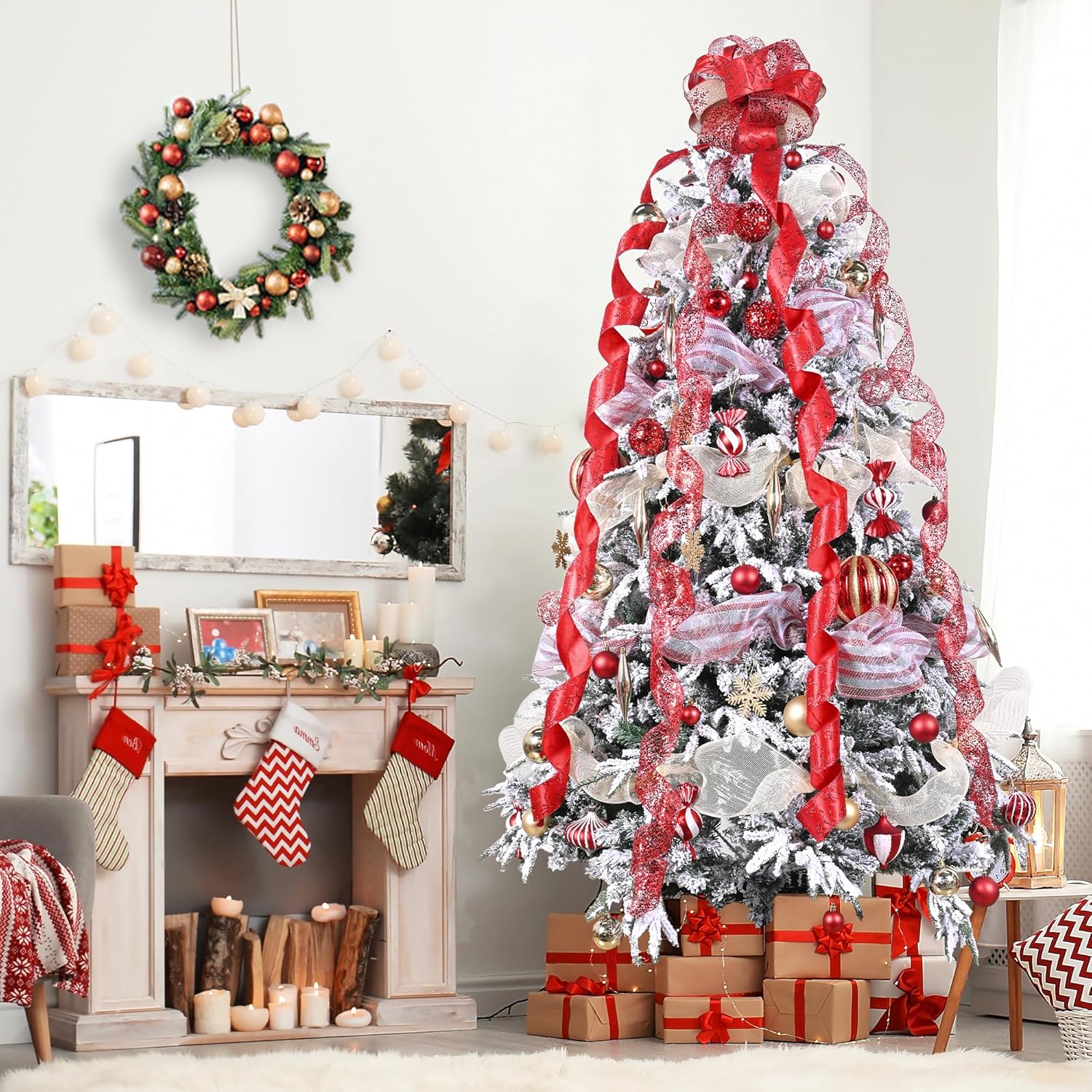 Red Linen Snowflake Glitter Topper Bow for Christmas Tree 11 Inch Topper Bow with 4 Ribbons 3 Yards Long Each Tails Christmas Tree Ribbon Bows Elegant Holiday Décor