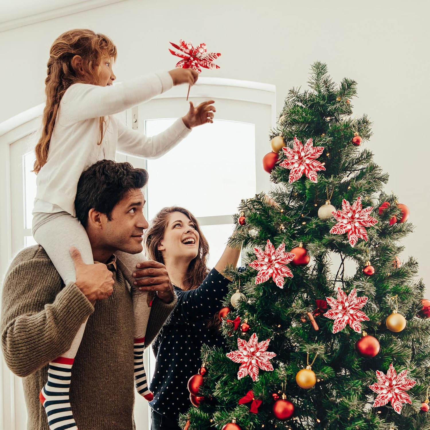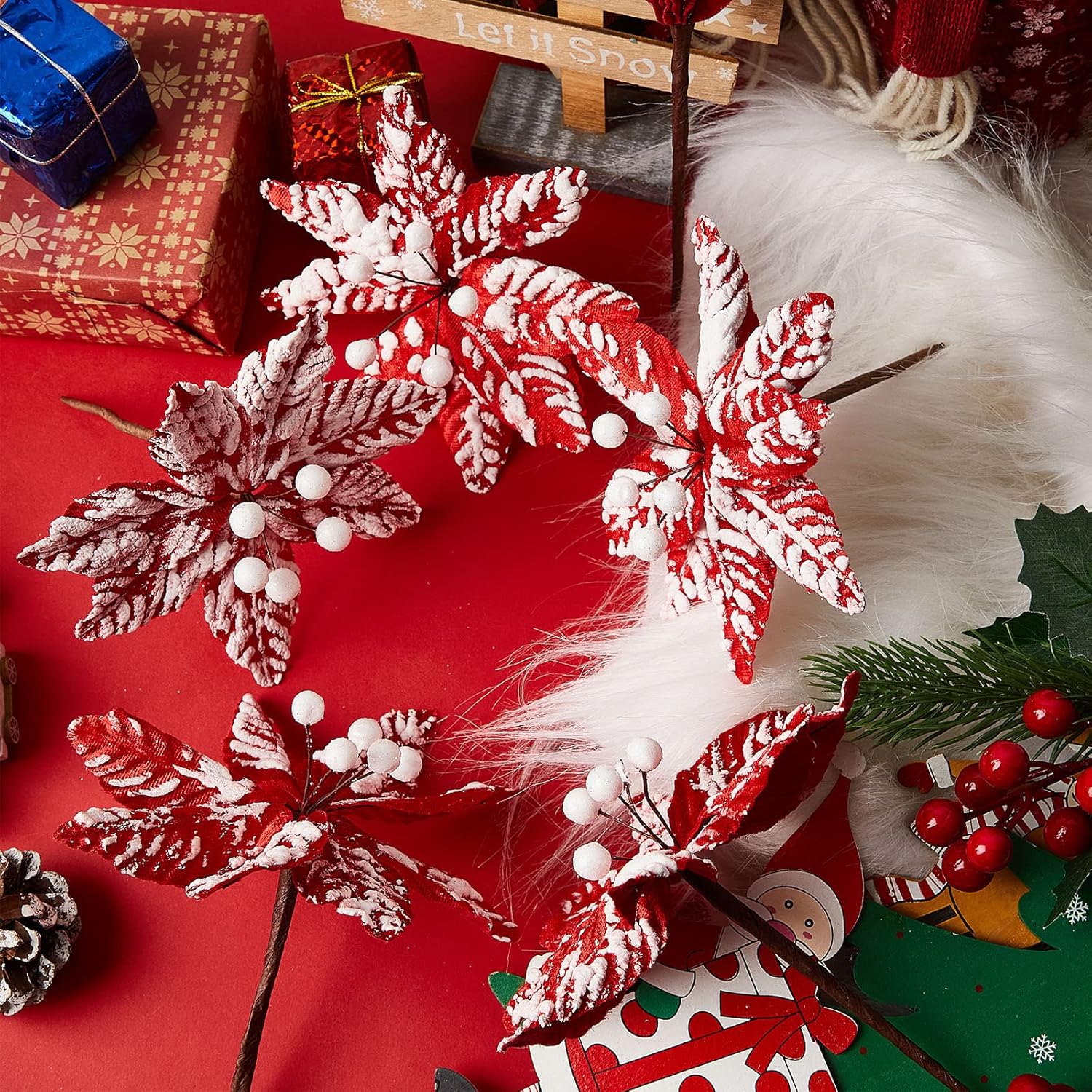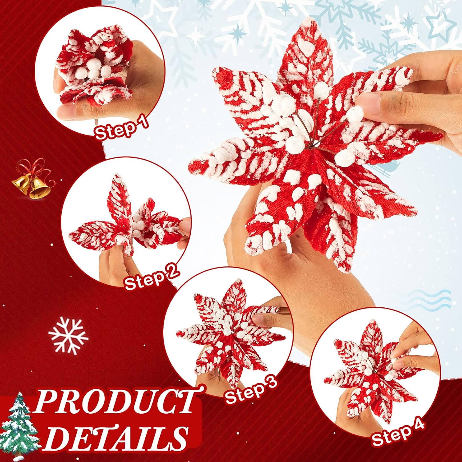 • Easy to Use: each artificial poinsettia flower is designed with bendable stem, which is convenient for you to directly fix it on the Christmas tree, Christmas wreath, garland and other decorations, stable and beautiful, not easy to fall, which is easy and convenient for you to install