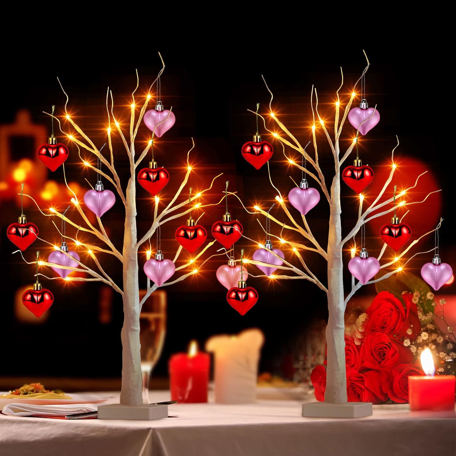 Remon Valentine 2Ft Birch Tree Light, 24 LED White Birch Tree Battery Powered Timer, Artificial Valentine Tree Included Set of 10 Valentine's Day Heart Ornaments for Table Center Decor Home Indoor