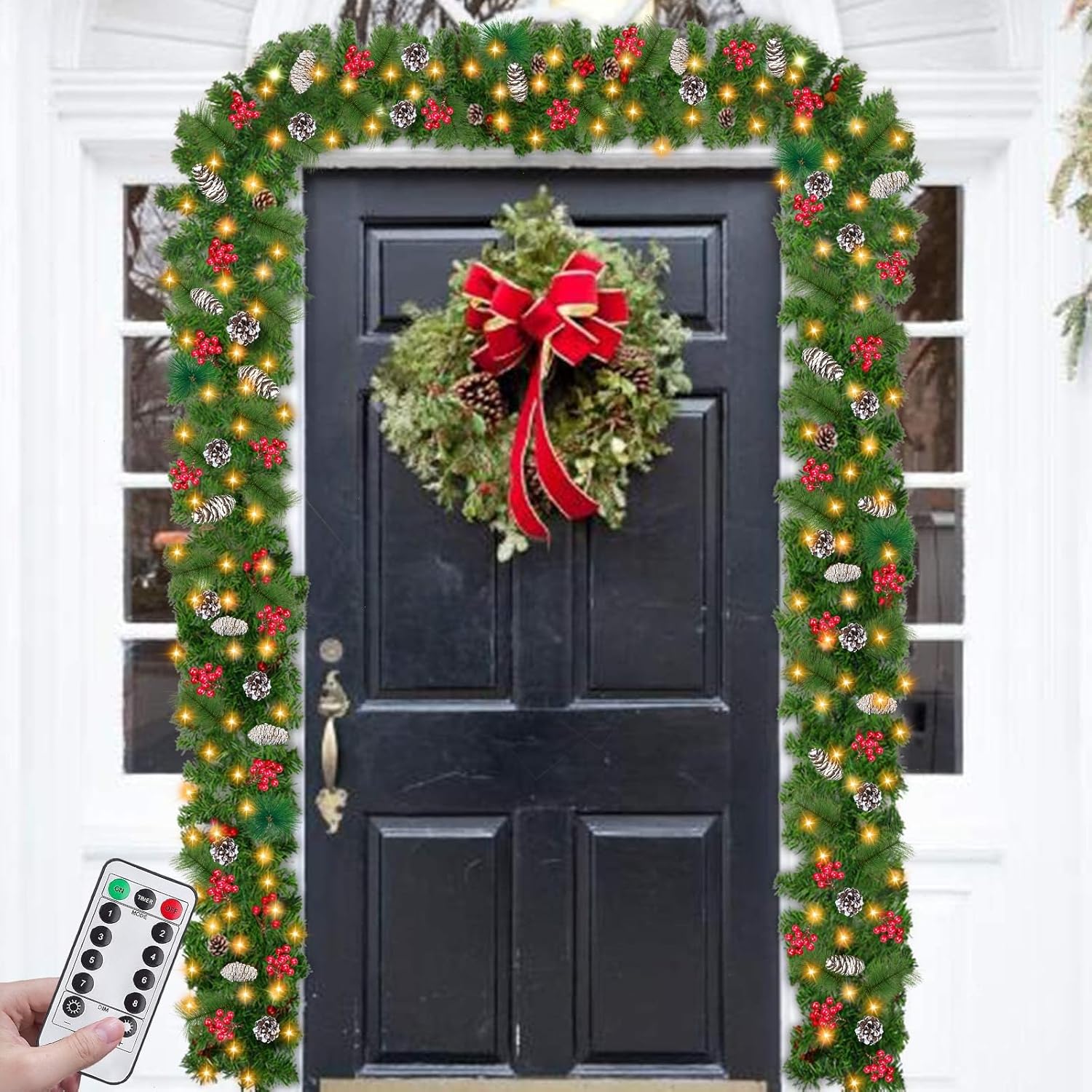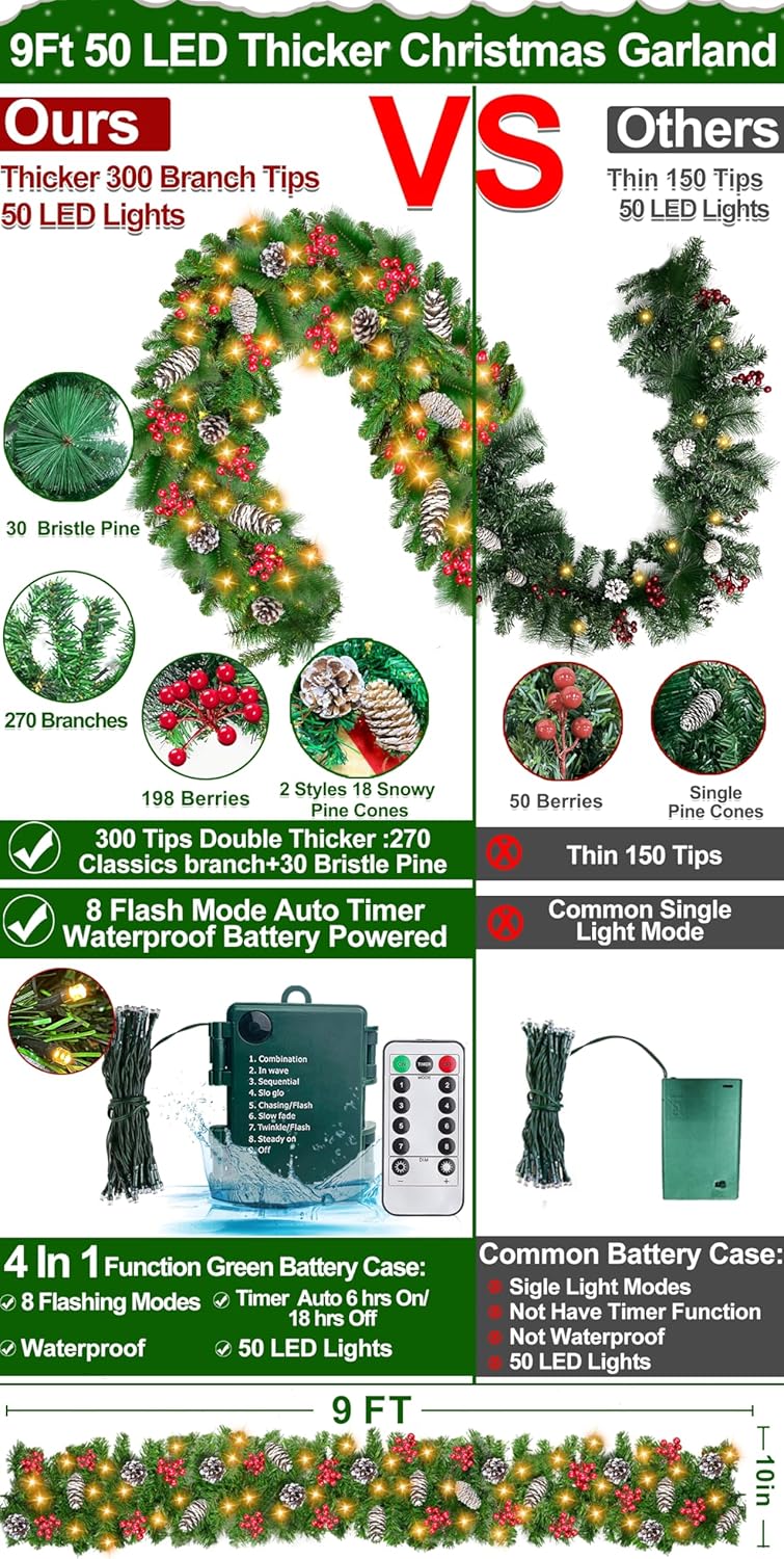 Pre-lit Christmas Garland with 50 Lights & Timer: 9 Foot by 10 Inch lighted garland is pre-strung with 50 LED warm white lights, 270 Thick branches Tips, 30 pine needles, 18 pine cones, 198 red berries. Built-in auto timer (6h on, 18h off)Prelit Warm White Lights: This Christmas lights garland, adorned with pre-lit 50 LED warm white string lights, lighted Christmas Garland will fill your home with a Christmas ambiance