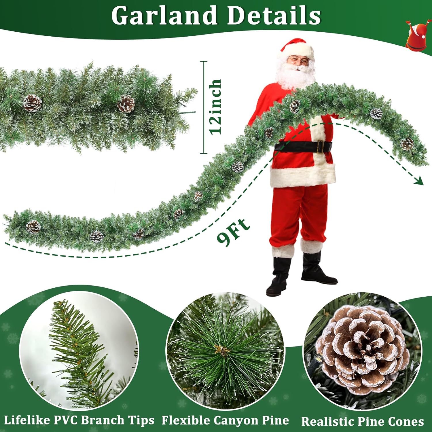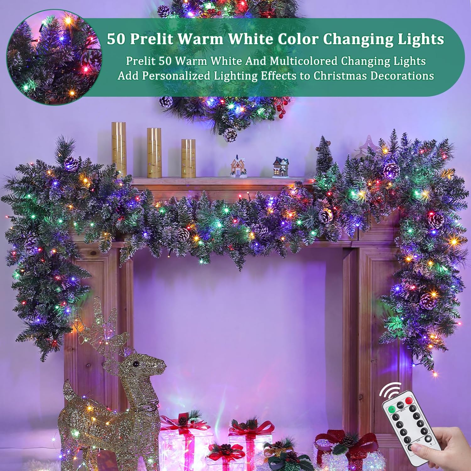 Remote Control&Timer - 9Ft by 12Inch Prelit Christmas Garland Decorations Snowy Thick Garland with 50 Colorful Lights 8 Modes 250 Branch Tips 20 Canyon Pines 10 Pinecones Xmas Garland Mantle Fireplace