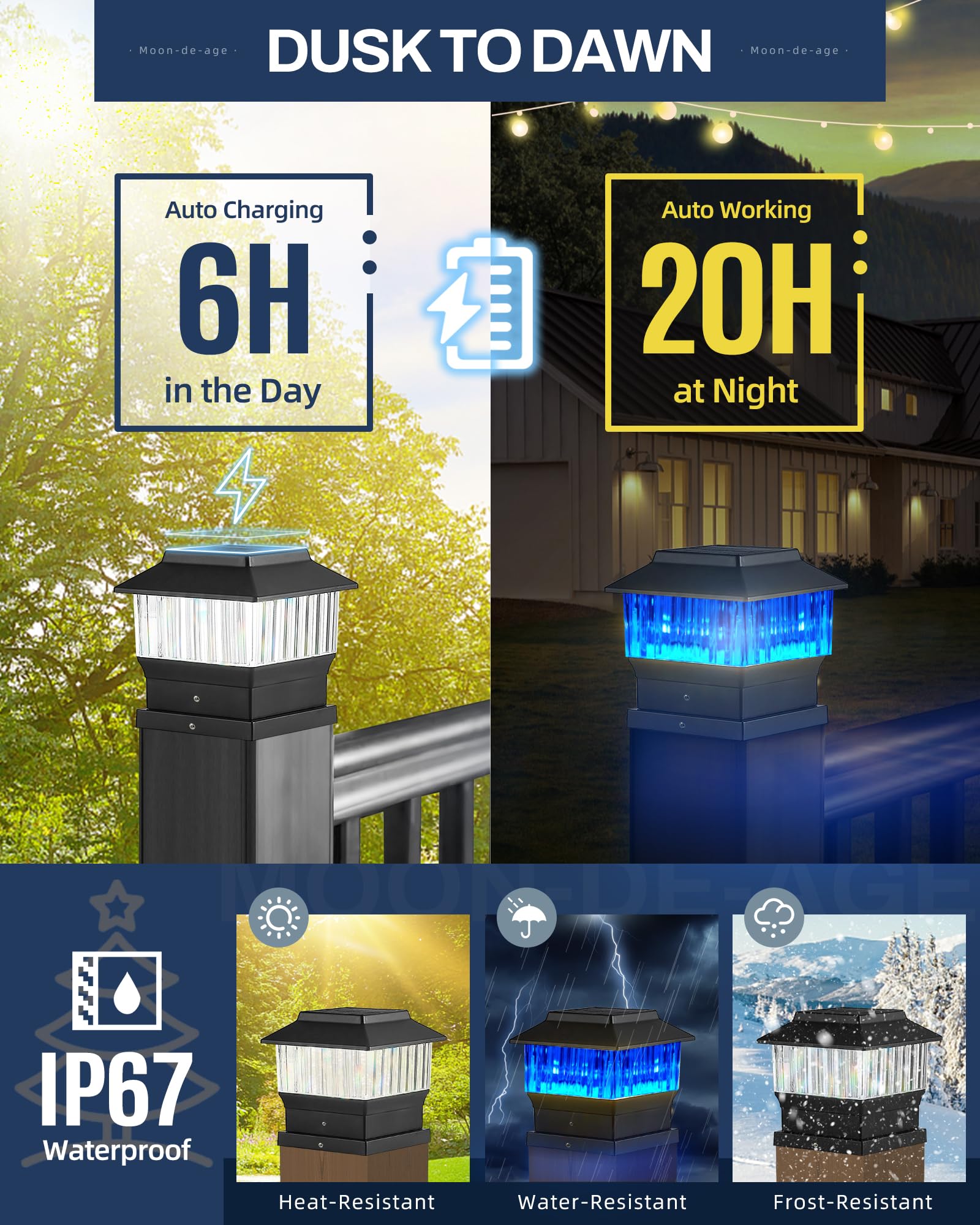 • 【Meet 4 Size Requirements】 For installation, please watch the video Provide 4 different adapters (3.5x3.5 wood post, 4x4pvc post, 4.5x4.5 wood post and 5.5x5.5 wood post) with mounting kit, the base connects to the wood post with matching screws, no wires required. Suitable for posts, decks, patios, fences and more. You can also choose to mount on outdoor tables and other flat surfaces. Product size is 5.7" X 5.7" X 5.7".