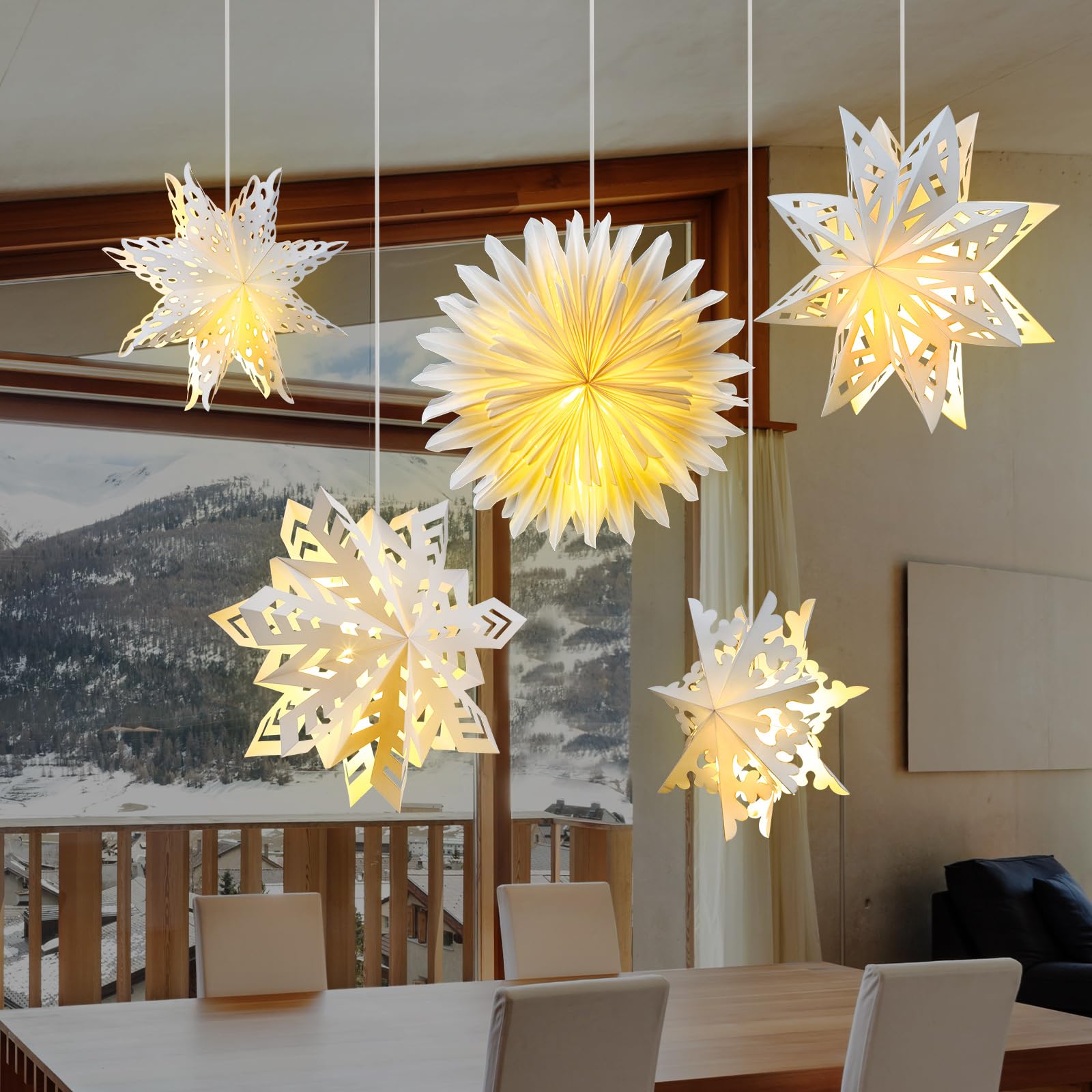 Novel Decorative Lights: the white paper snowflakes are designed with many small holes crafted by machine, beautiful and elegant, which allows the warm white light emitted by LED lights to go through and cast beautiful shapes on your wall or floor, creating a romantic and warm Christmas atmosphere Delicate Material: the snowflake hanging lamp is made of quality paper, thick and strong, delicate and exquisite in craft process, not easy to break, fade or tear, it has a long service life and can stand the test of time, easy to hang most places you like It is flat packed for transport, and also convenient to store when not in use