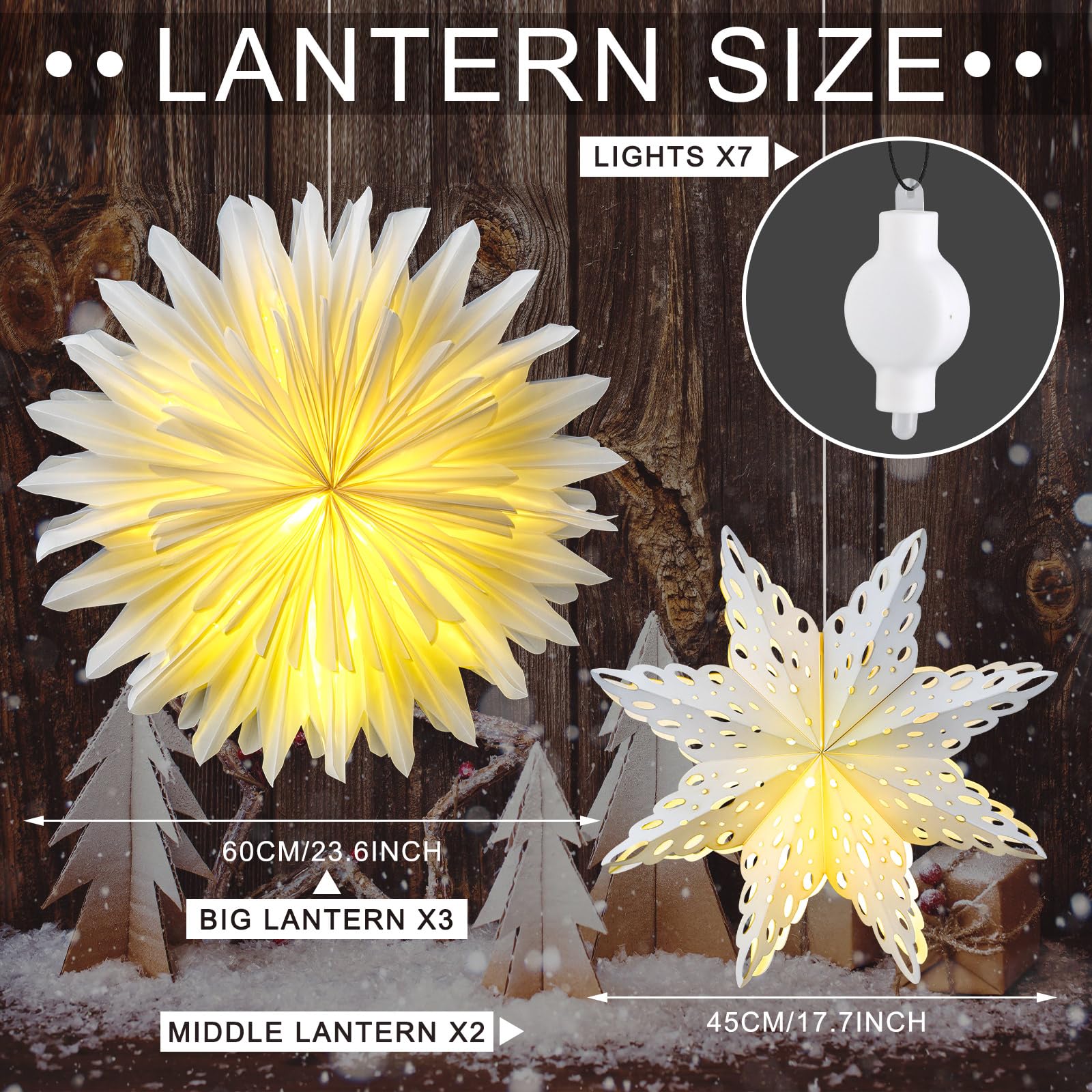 • 3 Different Sizes to Choose: the large white snowflakes lanterns are approx. 23.6 inches/ 60 cm, the medium size is approx. 17.7 inches/ 45 cm, while the small white snowflakes lanterns measure about 11.8 inches/ 30 cm Lanterns of different sizes can meet your needs of large and small size combinations