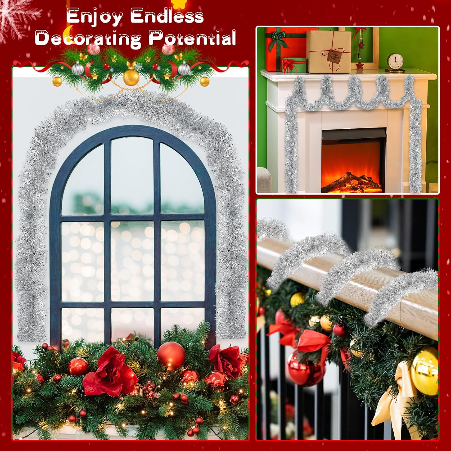 • Easy to Shape and Hang: the shiny tinsel garland is designed for multiple uses, you can bend and shape them into different shapes by your imagination and creativity, and you can hang your designs on Christmas trees, stair railings, fireplace mantels, and more, showing your creativity, and good taste