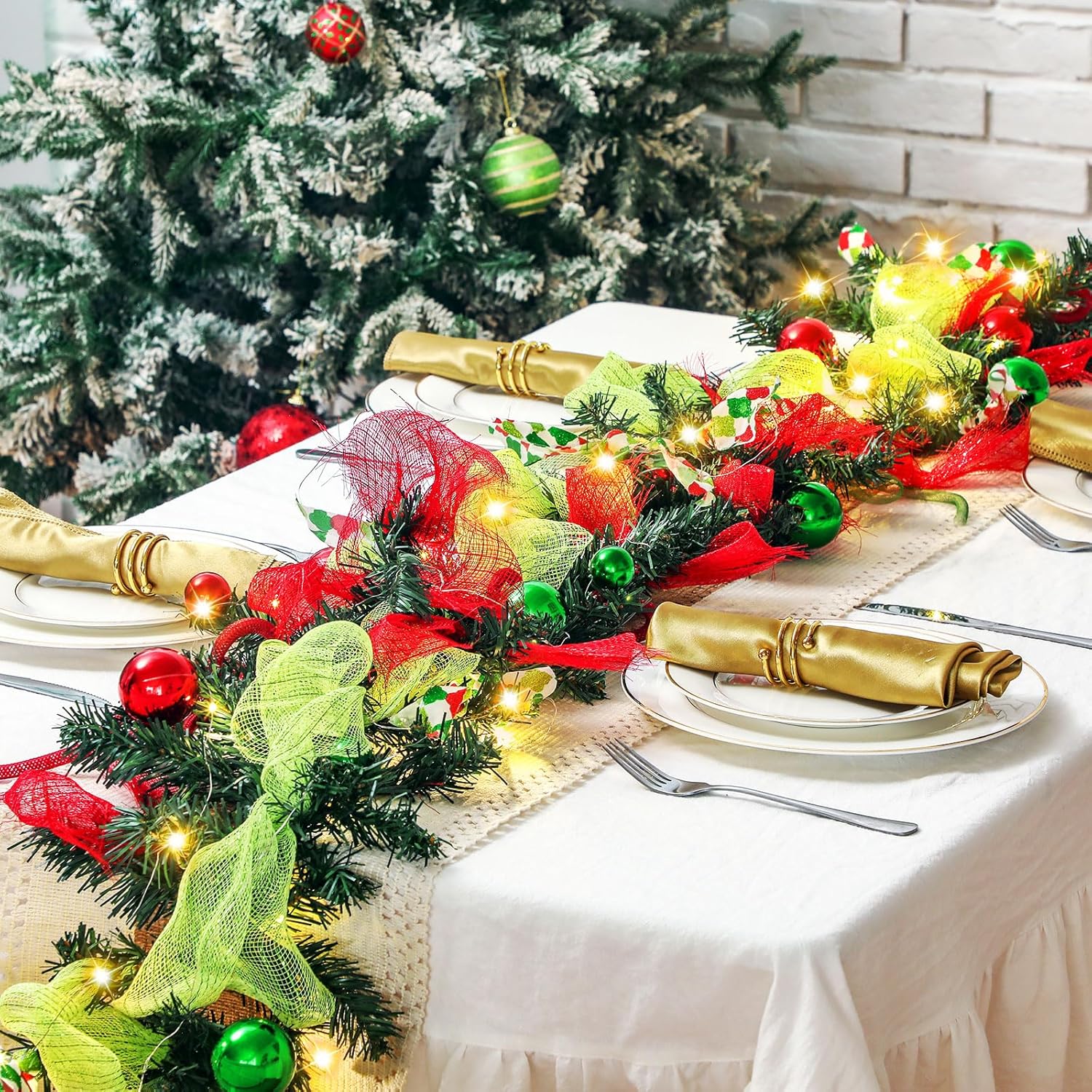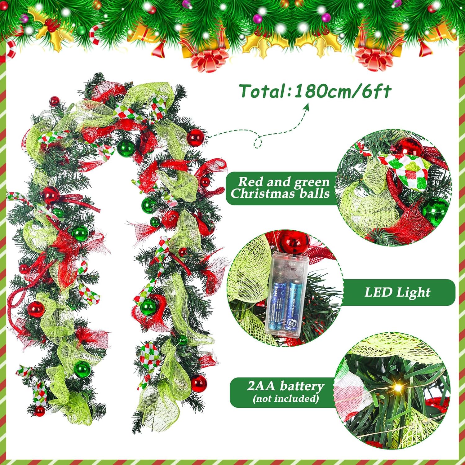 Riceshoot 6 ft Red and Green Christmas Garland with Lights for Mantle Bright Green Whimsical Xmas Garland with Red Green Balls for Front Door Fireplace Porch Table Centerpiece Outdoor Party Decor