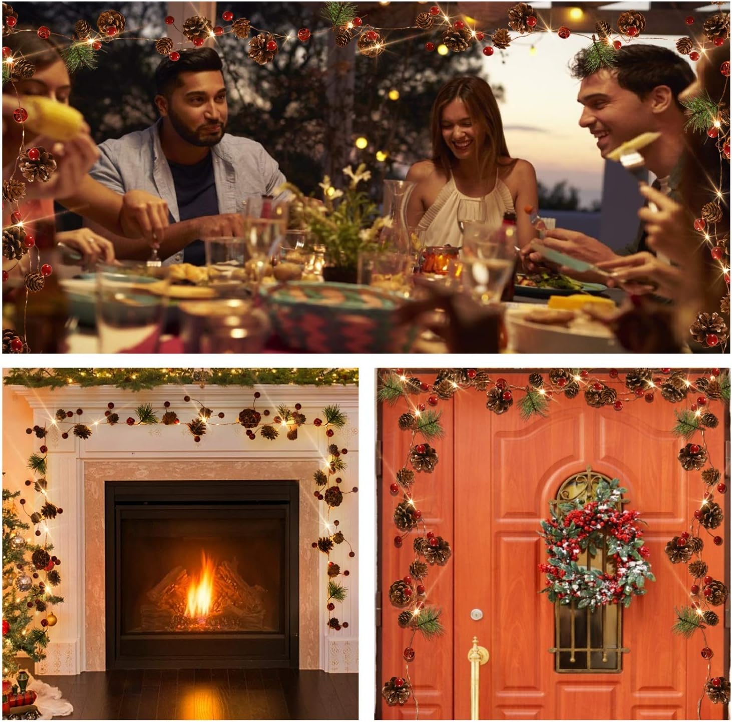Rocinha Christmas Garland with Lights Battery Operated 7.2 Ft 20 Pinecones Red Berry Garland with Lights Prelit Garland for Mantle Fireplace Table Indoor Outdoor Lighted Garland Decor