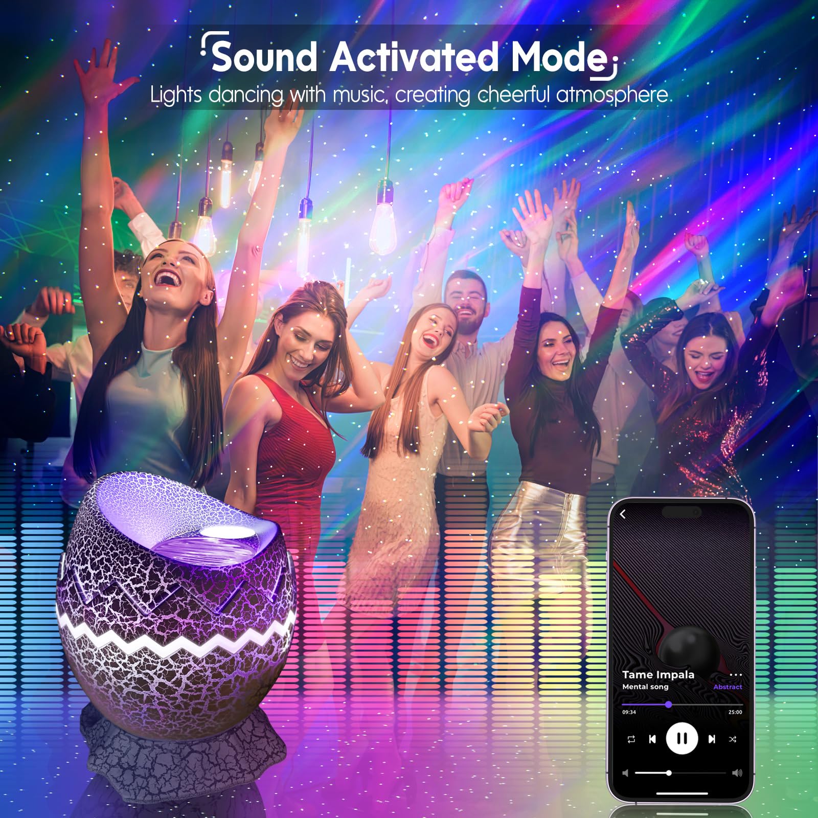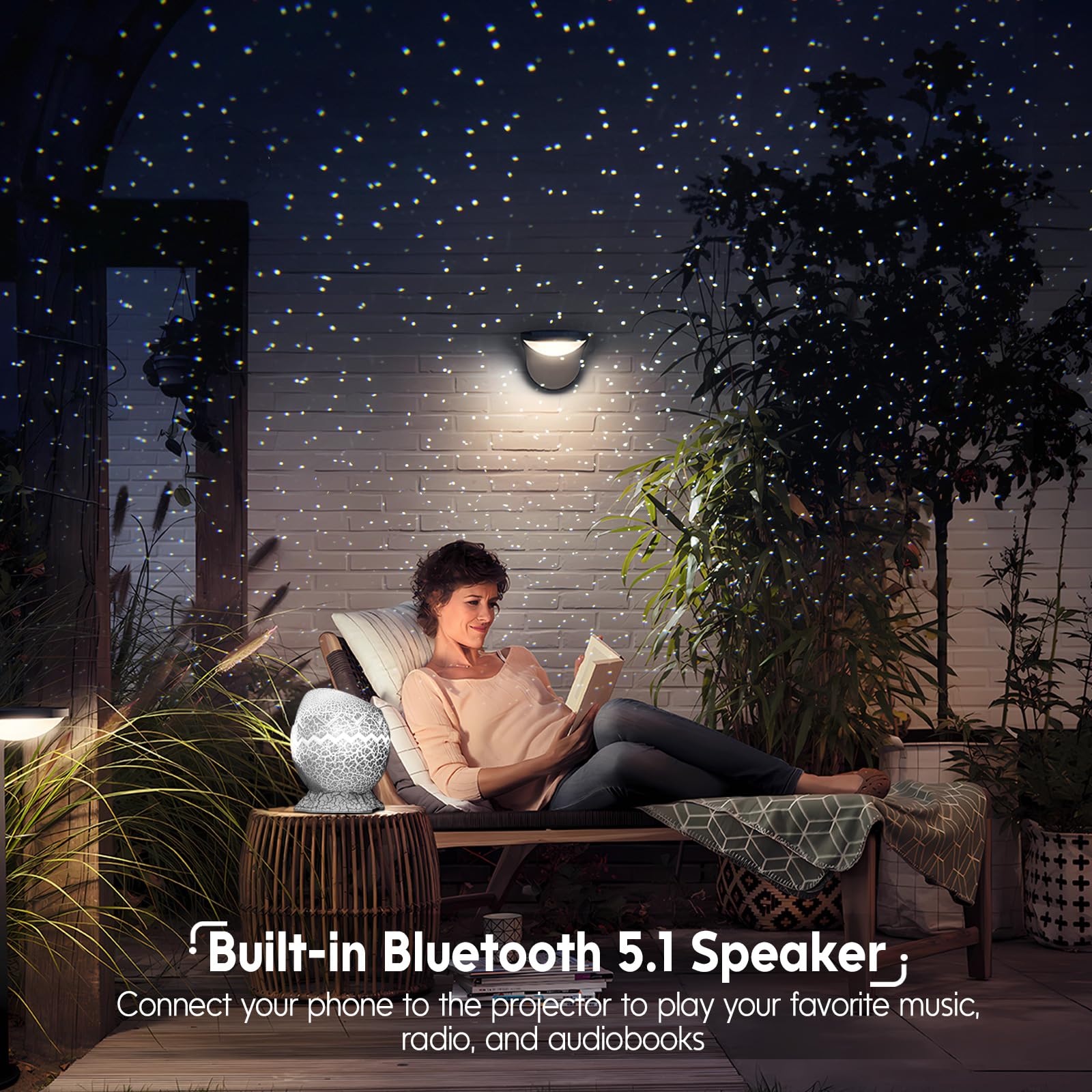 • Bluetooth 5.1 Speaker & Sound Activated - The galaxy projector features a built-in Bluetooth speaker. Connect your device via Bluetooth to play some music through the galaxy light projector and watch in amazement as the little stars blink and northern lights moves rhythmically to the beat of the music. You can activate the sound function from the remote control and the night lights will flash and change according to the music rhythm or by clapping your hands, resulting in immersive experience.