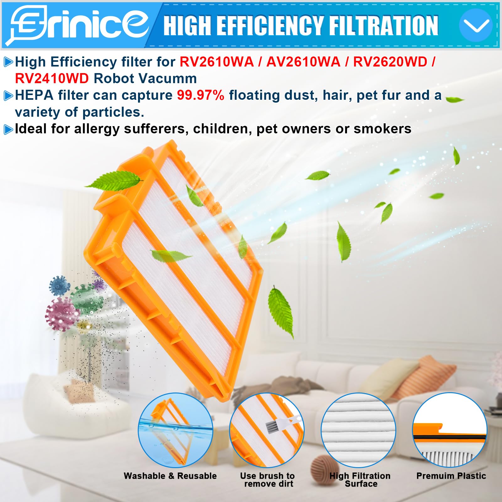 • 【High Suction Performance】Our part for shark AV2610WA AI Ultra 2in1 Robot Vacuum accessories offer high efficiency filter technology, with the aim of improving vacuum suction strength, effectively help you remove the dirt and enjoy a clean environment at home. Erinice UR2450WD filter can capture 99.97 of particles as small as 0.3 microns. The pleated filter media increases the capture area while maintaining good airflow through the filter.