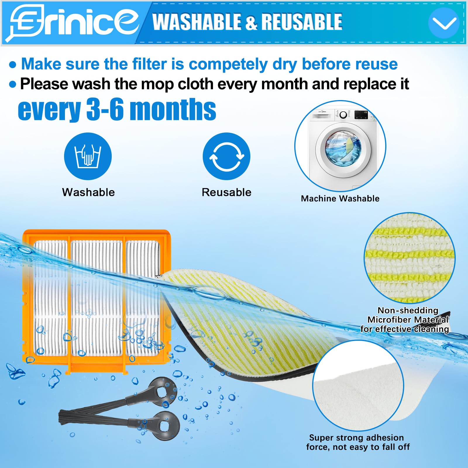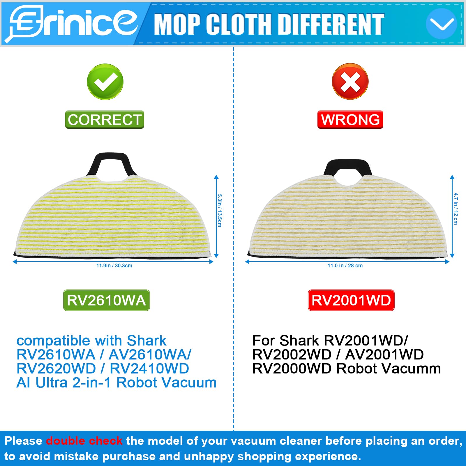 • 【Nonshedding Microfiber Material】 Erinice av2610wa rv2610wa mops are made of nonshedding microfibre material, which is high temperature resistance, no fading, no lint, easy drying and durable.The pad size is 11.89in30.2cm×5.31in13.5cm,velcro loop size 3.94in10cm×0.59in1.5cm. In order to matching your vacuum correctly, please comfirm your mop size before purchase.
