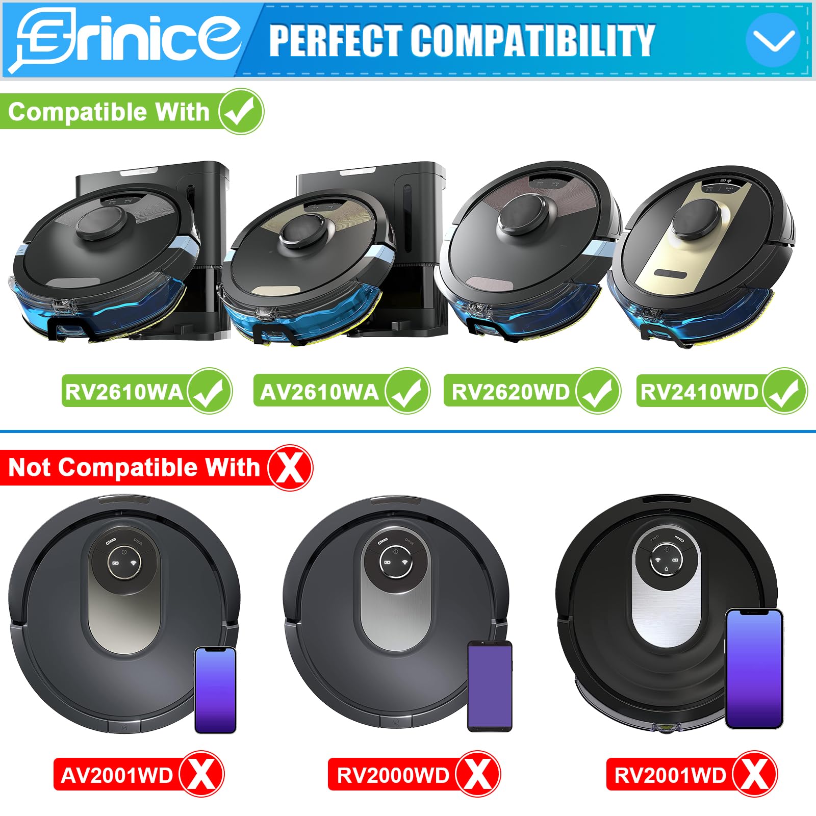 • 【Perfect Compatibility】 Erinice rv2610wd kit is compatile with Shark AI Ultra 2in1 Robot RV2610WD, RV2610WA, AV2610WA, RV2410WD, AV2610WACA, RV2400WD, RV2400WS, RV240BLXUS, RV2402WD, RV2402WXUS, RV2600WA, RV2600WD, RV2610WACA, RV2610WDCA, RV2620WD, UR2450WD Vacuum, Compare to part XFRV2600WD PADRVWD2. 🚫Not compatible with Shark RV2001WD RV2002WD AV2001WD RV2000WD Robot Vacuum. Please confirm the model of your robot before placing an order, in avoid of wrong purchase and unhappy shopping experience.