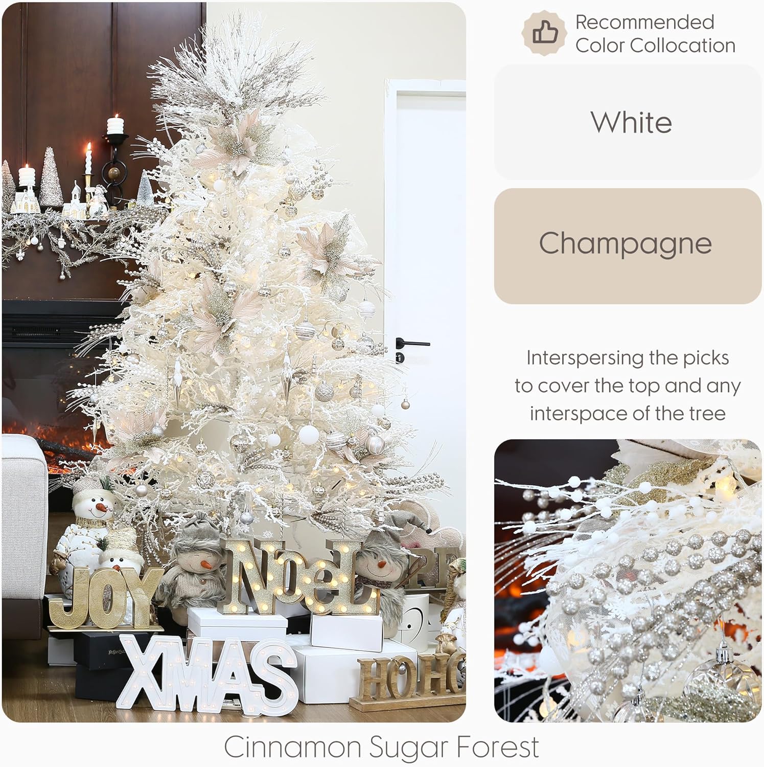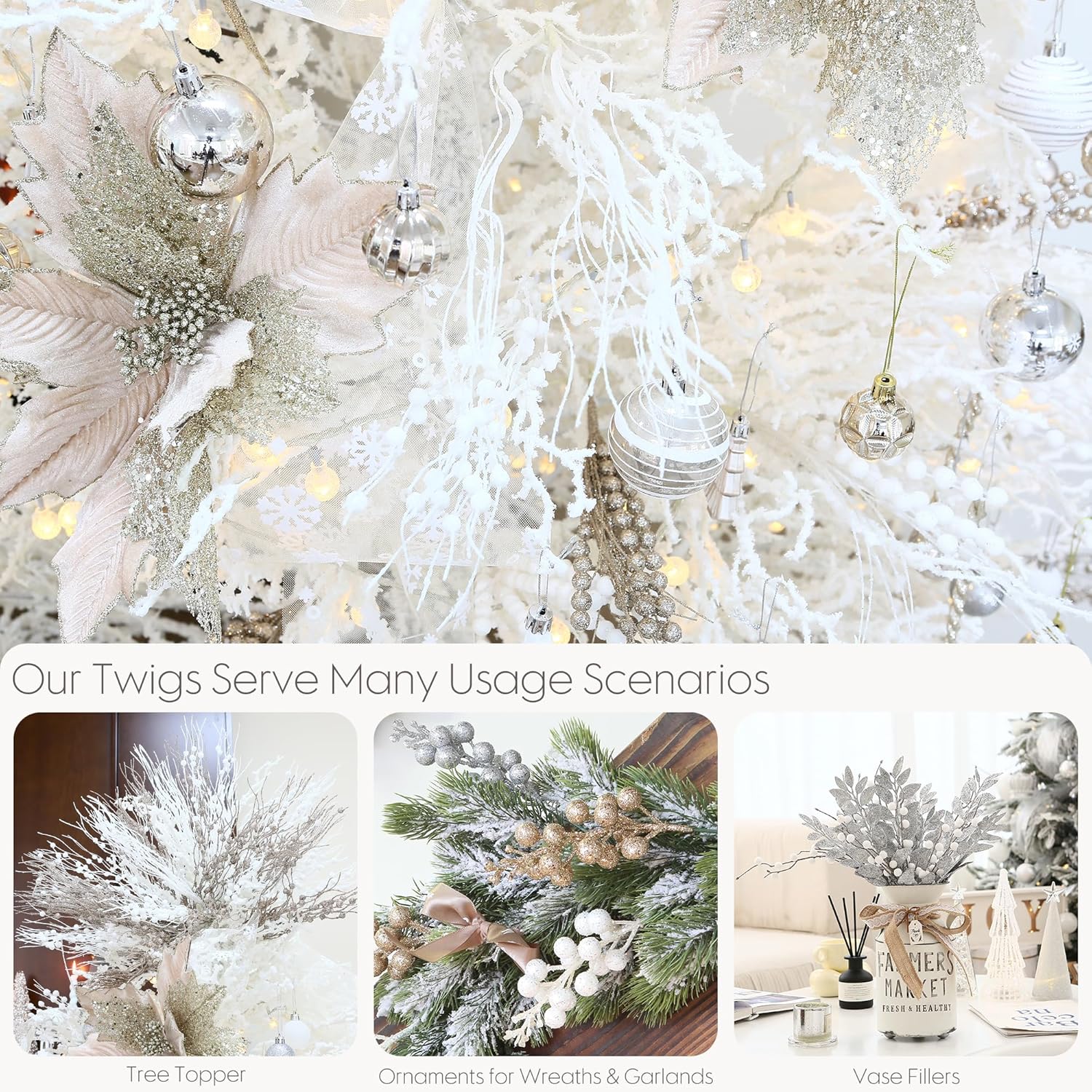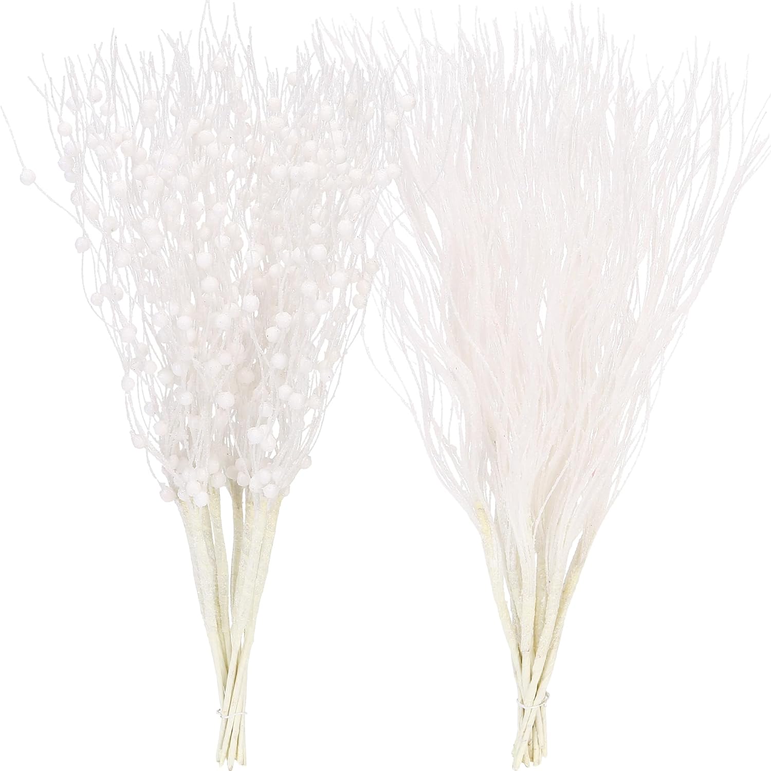 Sea Team 24-Pack Artificial Glitter Berry Stem Ornaments, Decorative Bead Sticks, Glittery Twigs, Picks, Branches for Christmas Tree, Small Vase, Holiday, Wedding, Party (15 Inches, White)