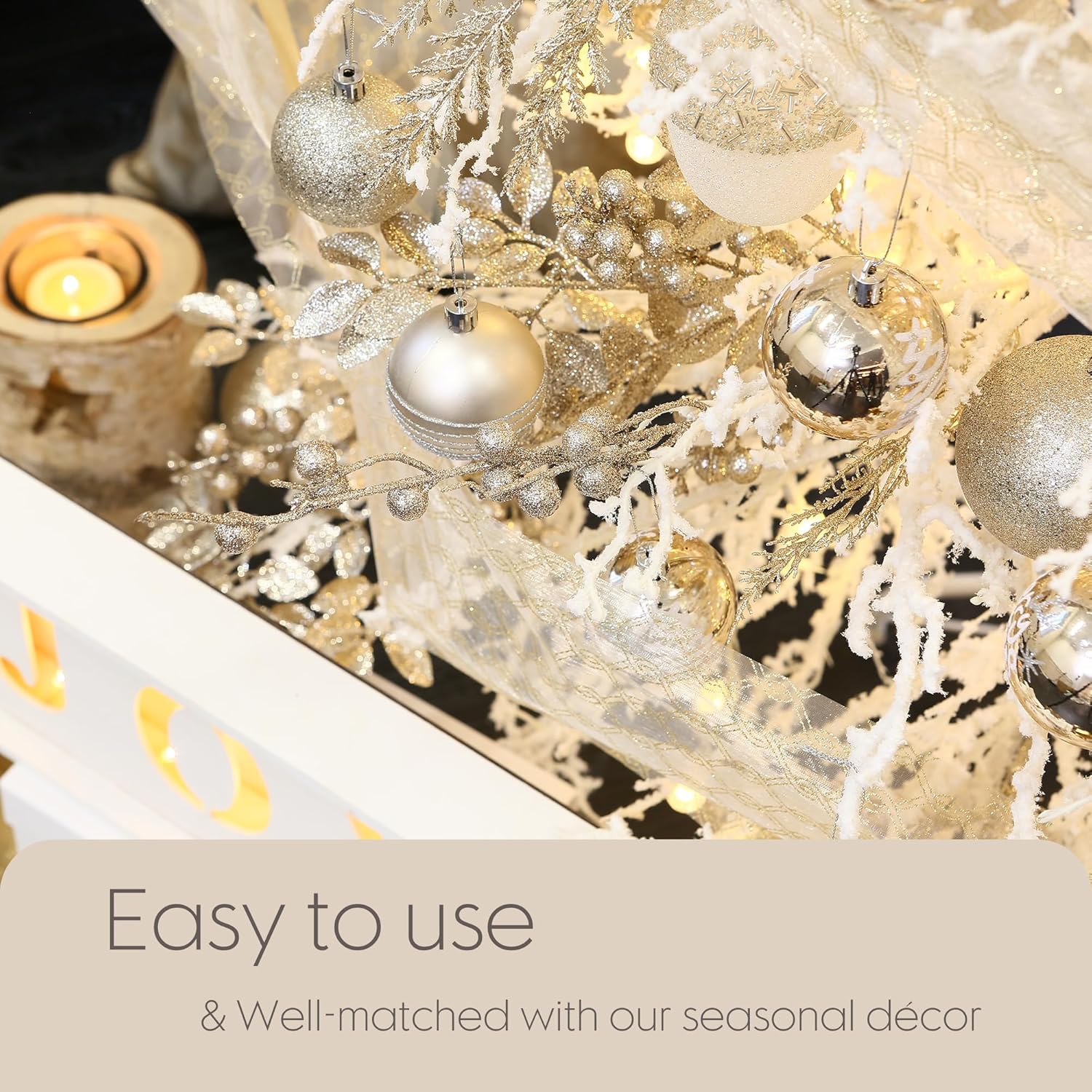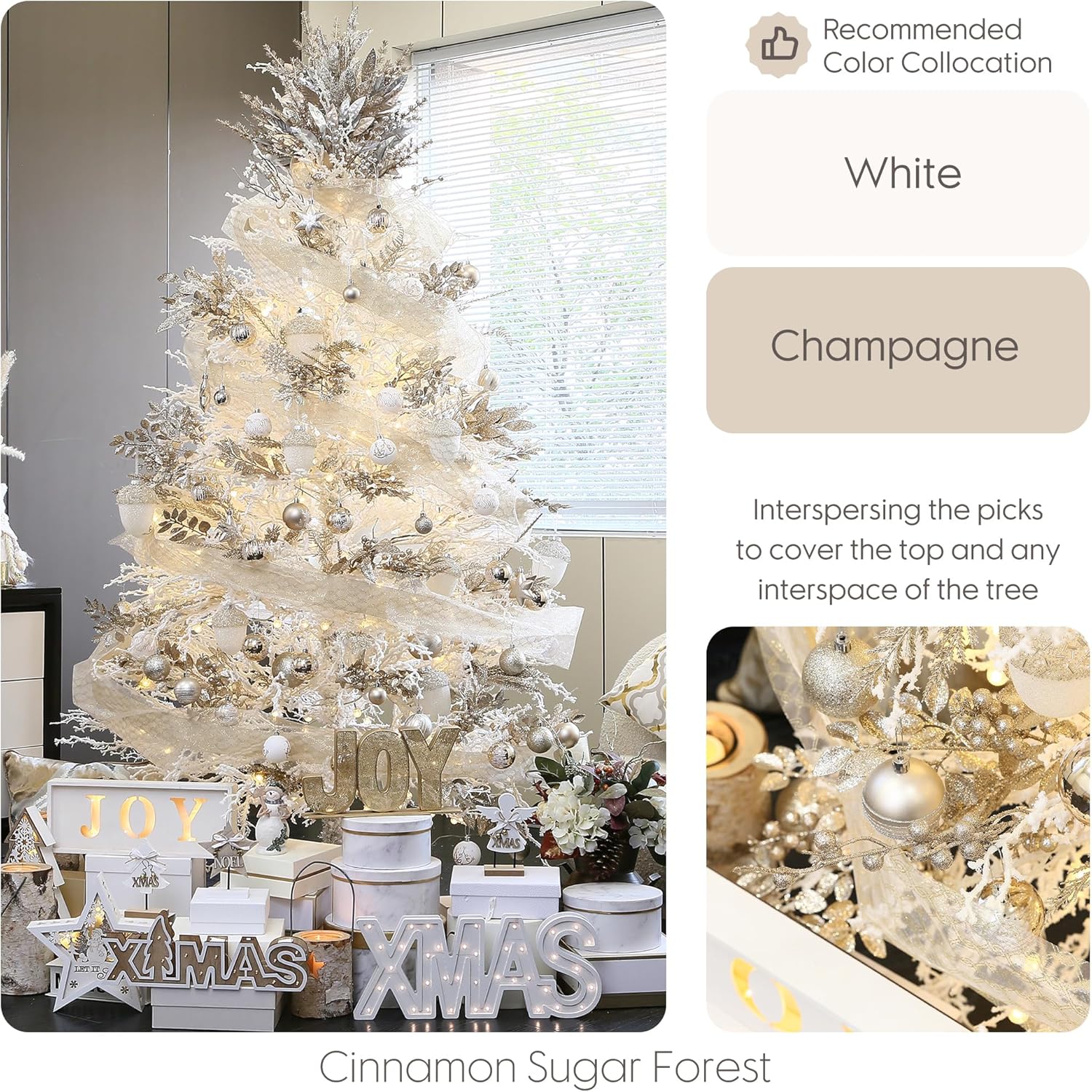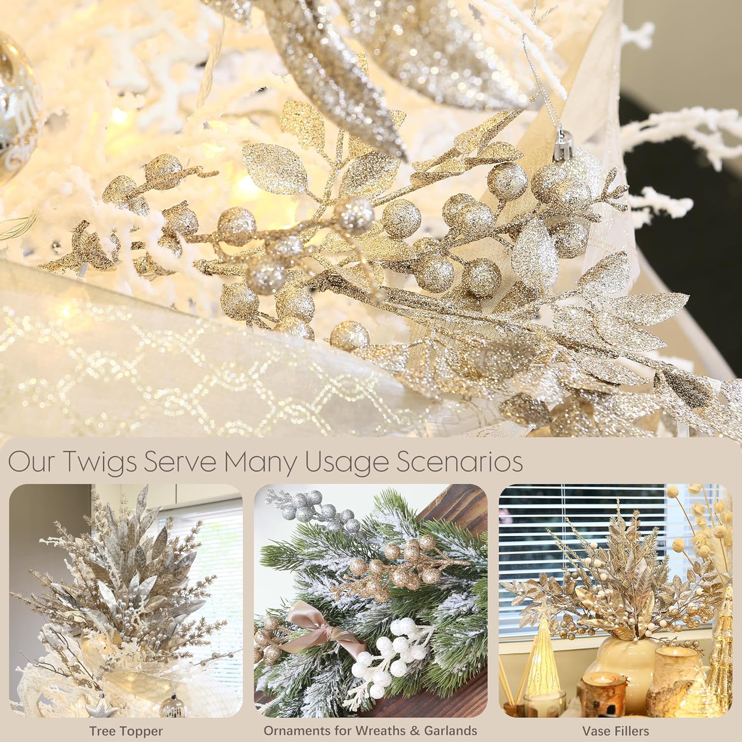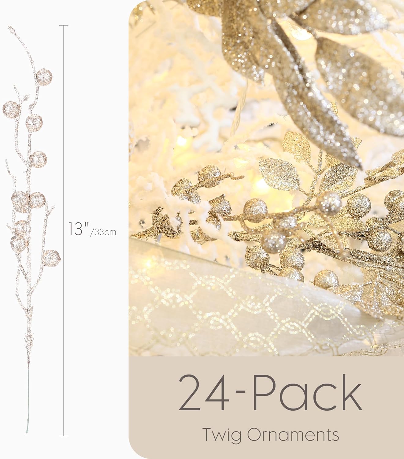 Sea Team 24-Pack Artificial Glitter Berry Twigs, Bacca Stem Ornaments, Decorative Bead Sticks, Picks, Branches for Christmas Tree, Wreath, Vase Fillers for Centerpieces, Home Décor, Champagne