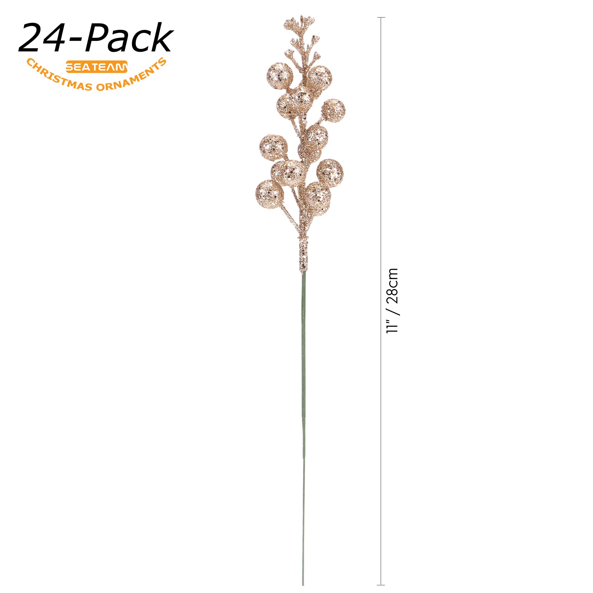 Sea Team 24-Pack Artificial Glitter Holly Berry Twig Ornaments, Decorative Fruit Sticks, Glittery Stems, Picks, Branches for Christmas Tree, Small Vase, Holiday, Wedding, Party (11", Champagne)