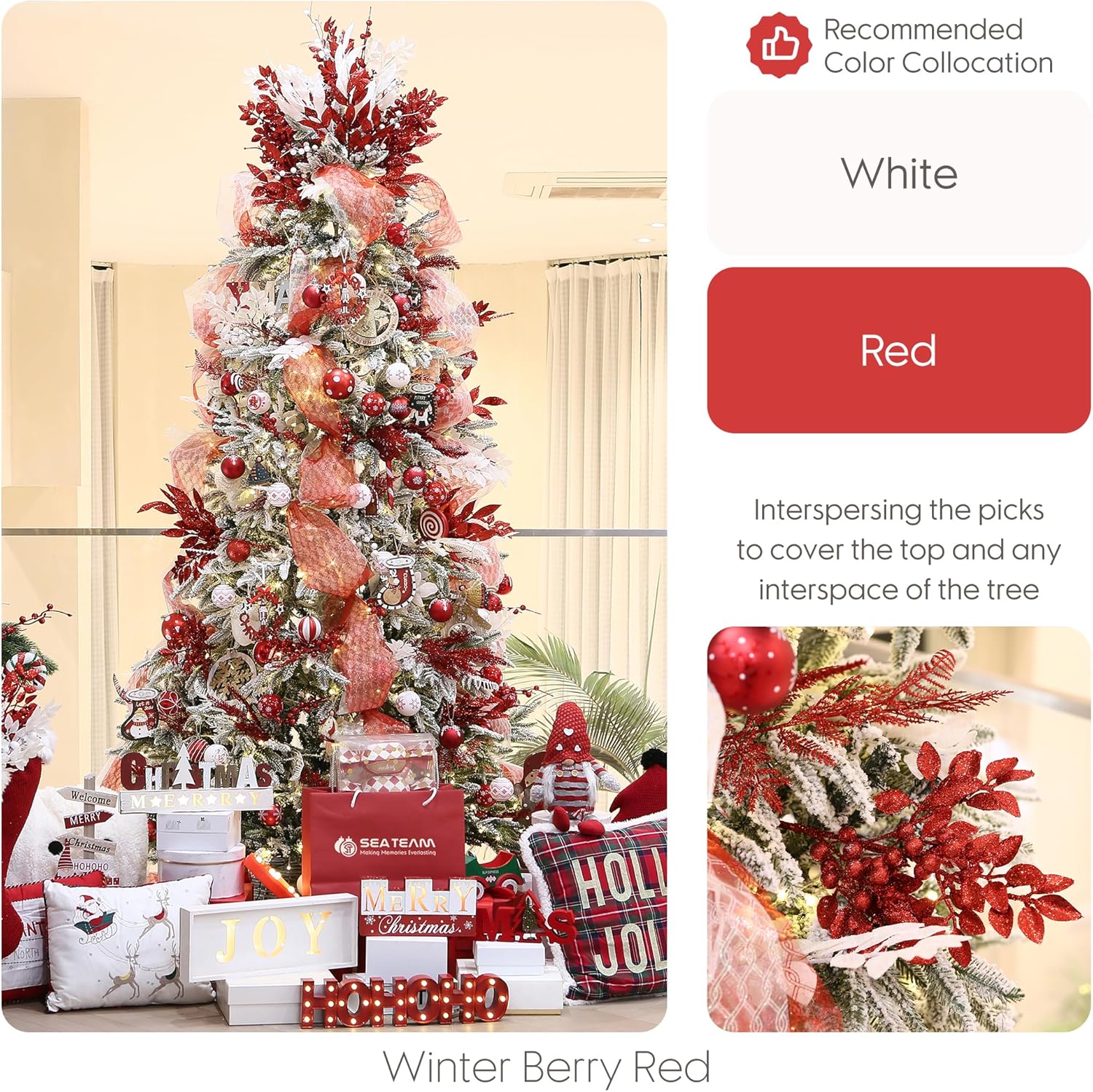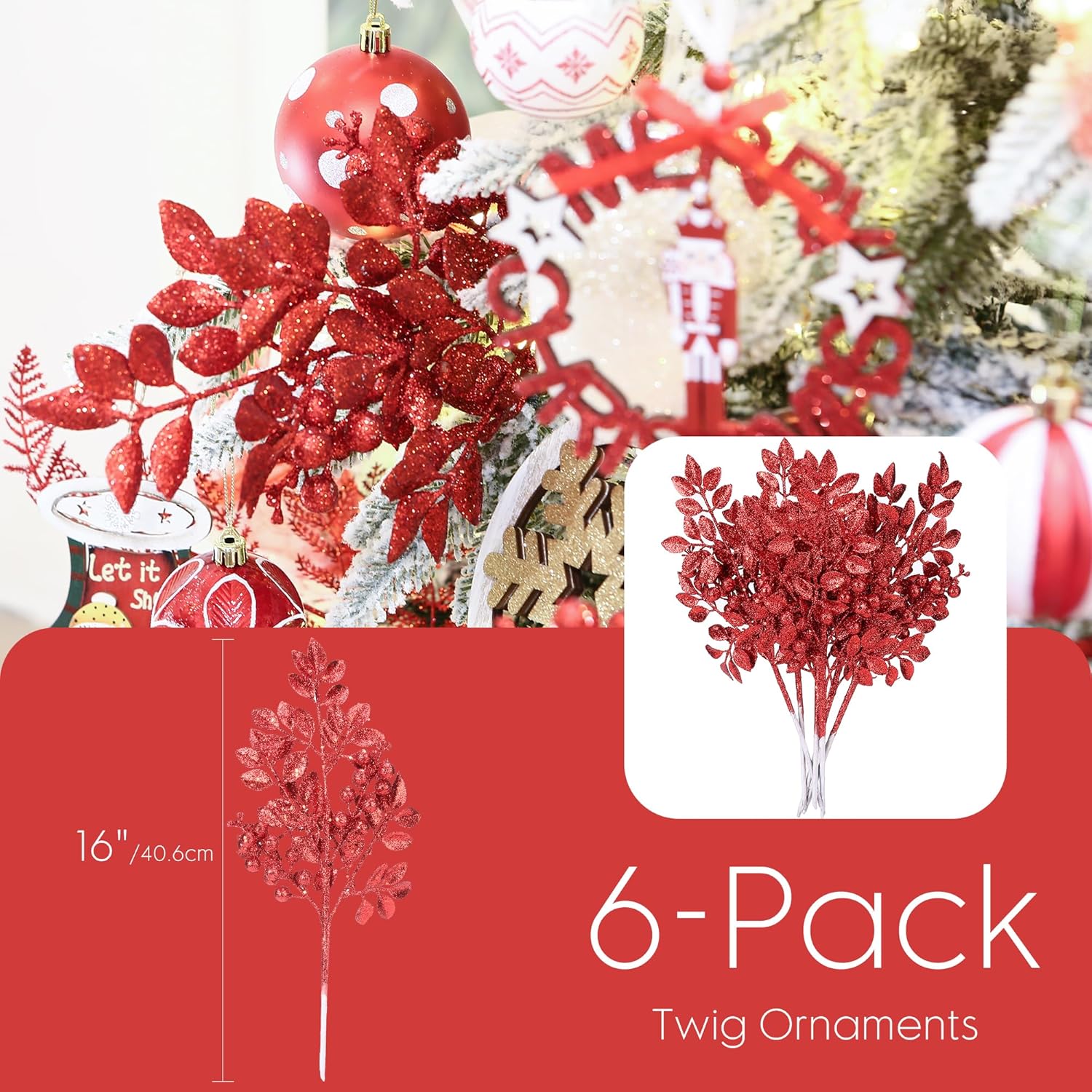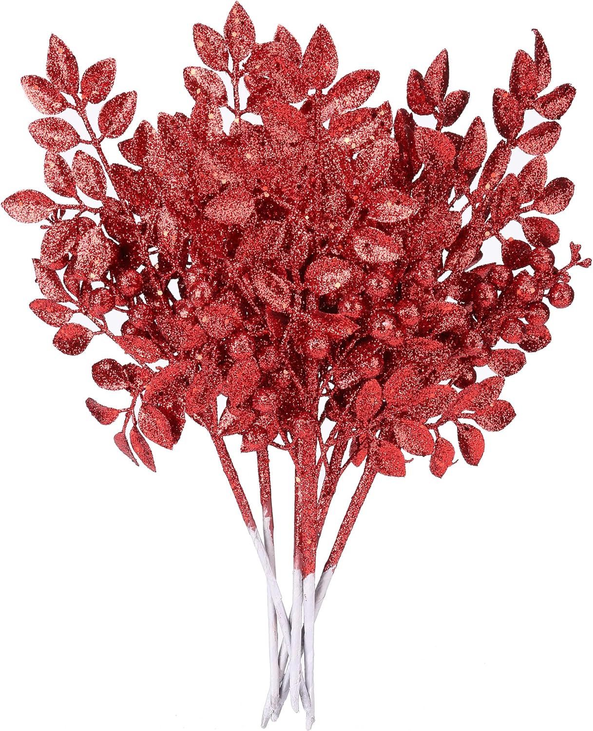 Sea Team 6-Pack Artificial Glitter Holly Berry Twigs, Bacca Stem Ornaments, Decorative Bead Sticks, Picks, Branches for Christmas Tree, Wreath, Vase Fillers for Centerpieces, Home Décor, Red