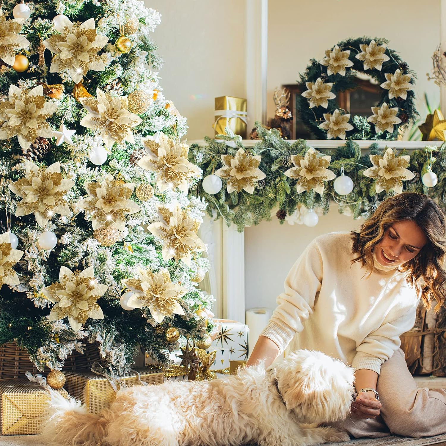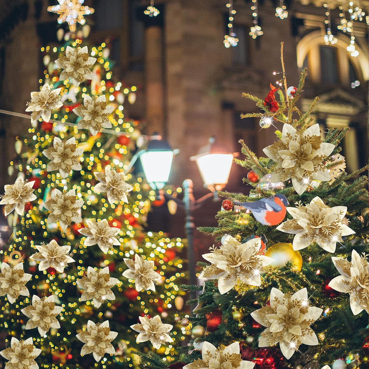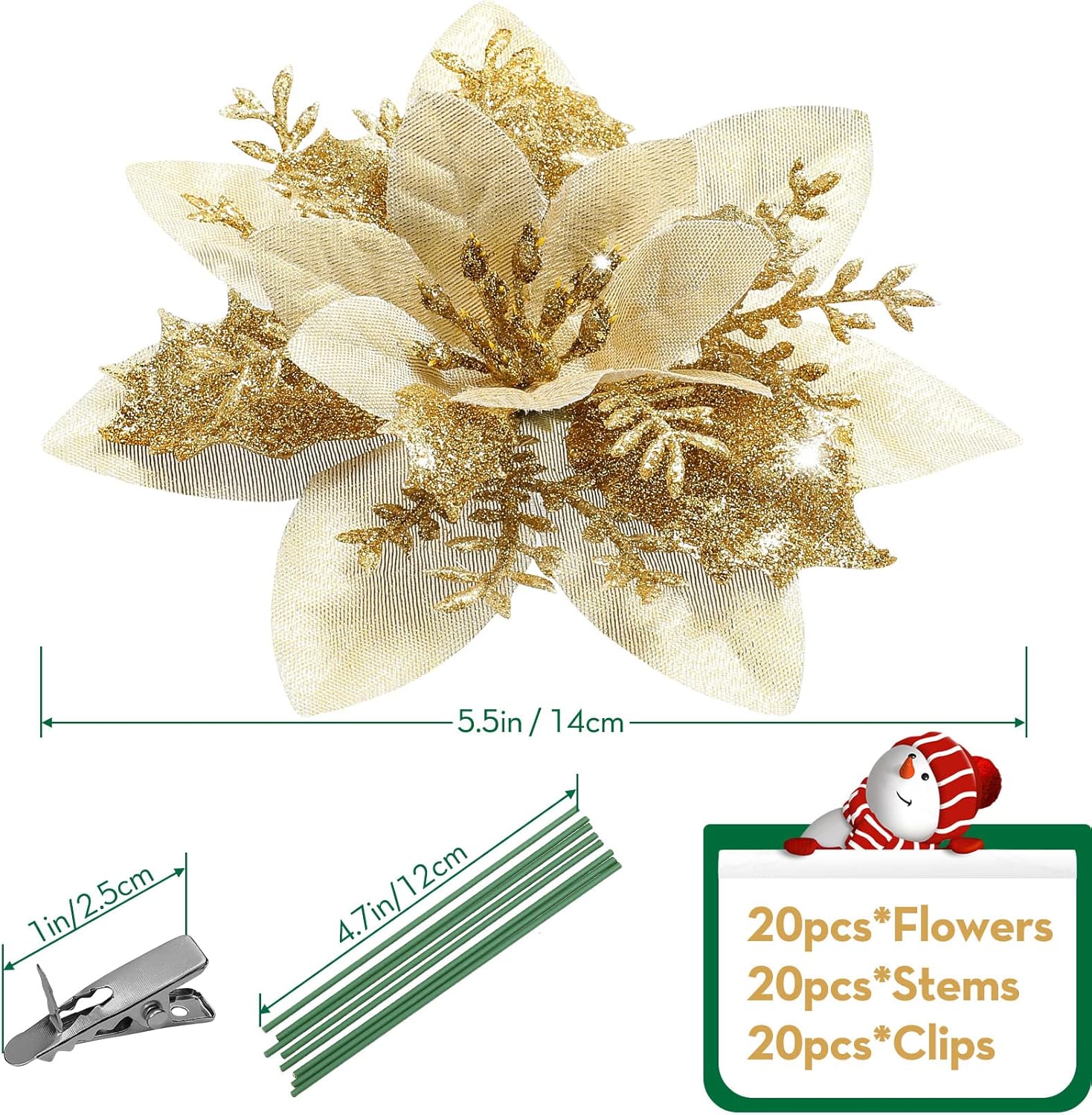 Serwalin 20pcs Christmas Flowers Artificial Gold Poinsettia Flowers Decorations with Clips Stems 14cm/5.5in Glitter Christmas Tree Ornaments Xmas Wedding Party Wreath Garlands DIY