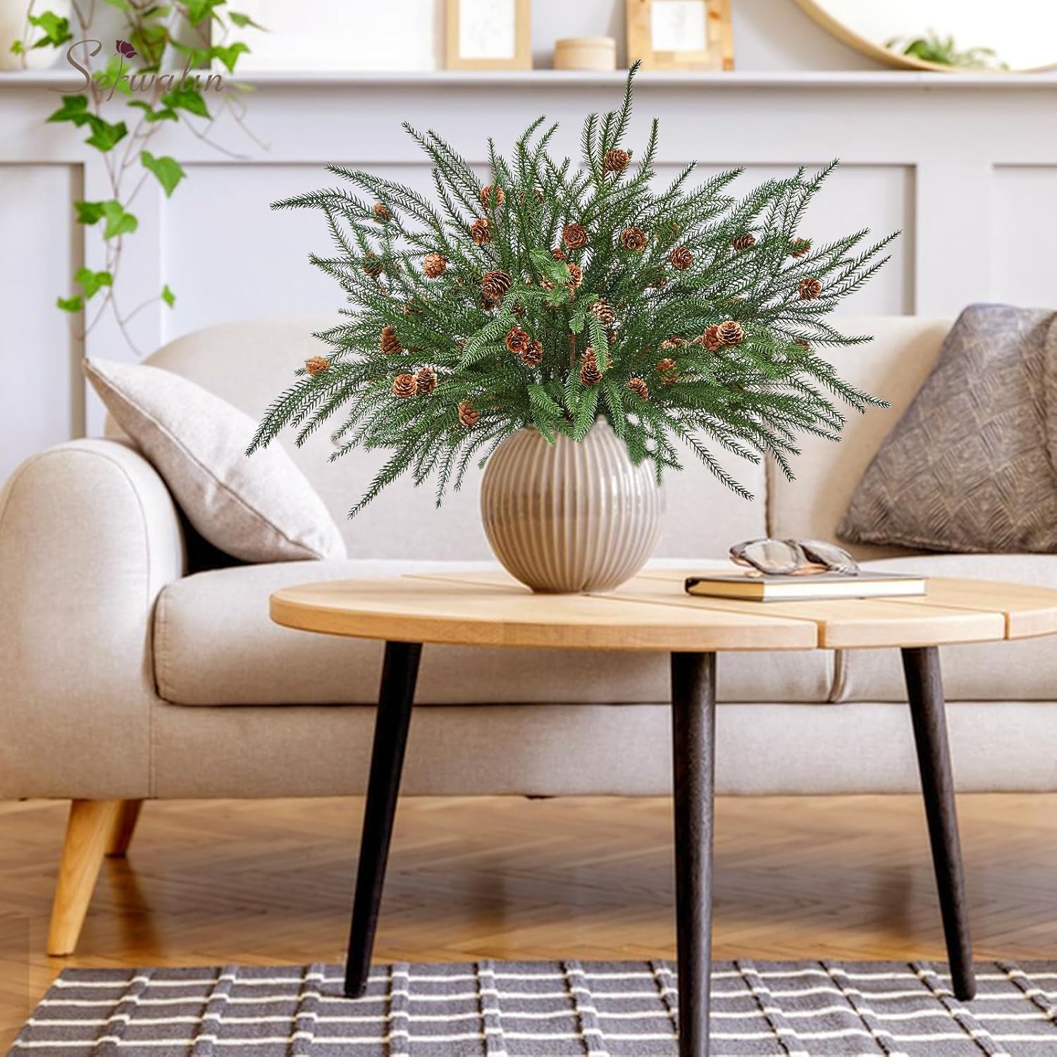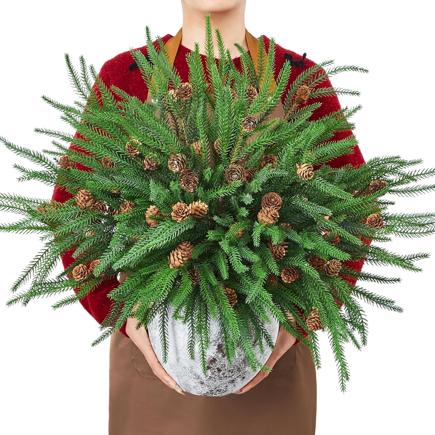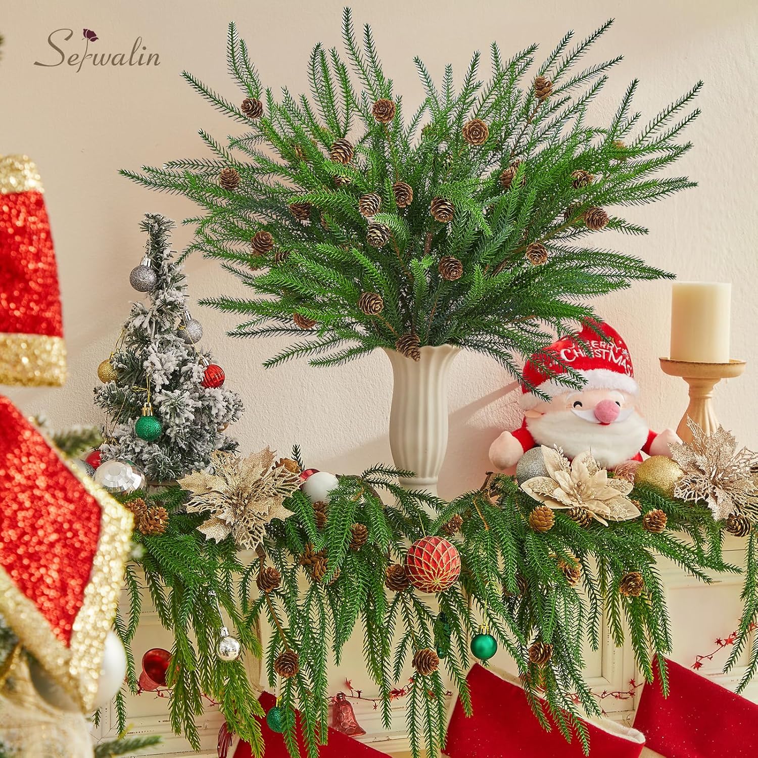 Serwalin 23.6“ Artificial Pine Branches, 12PCS Real Touch Norfolk Pine Branches with Pine Cones, Faux Christmas Greenary Picks for Xmas DIY Crafts Wreath Indoor Outdoor Home Decor