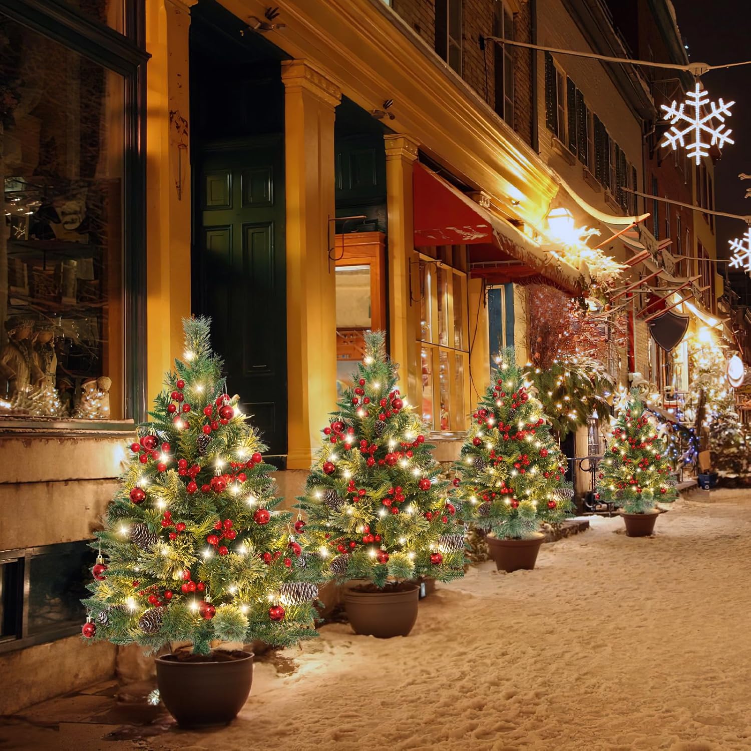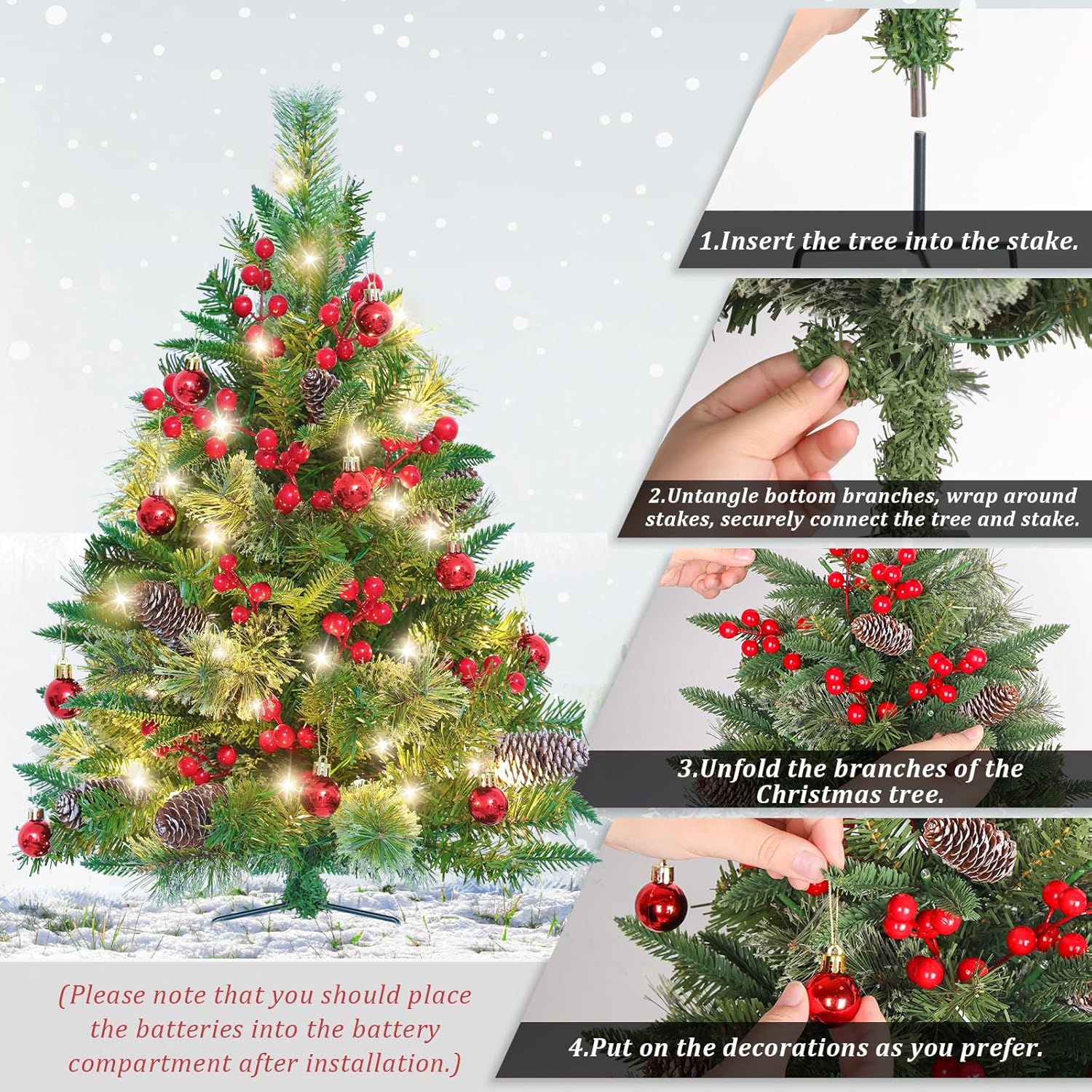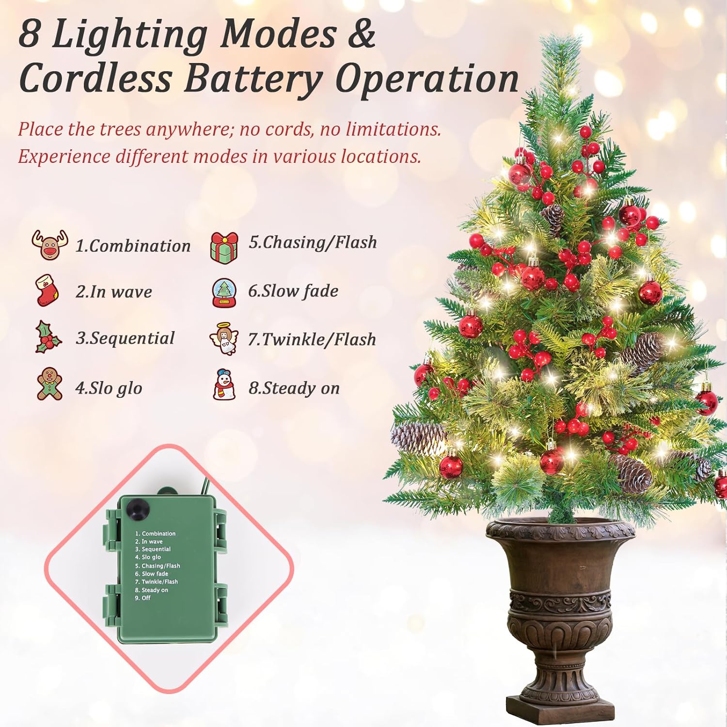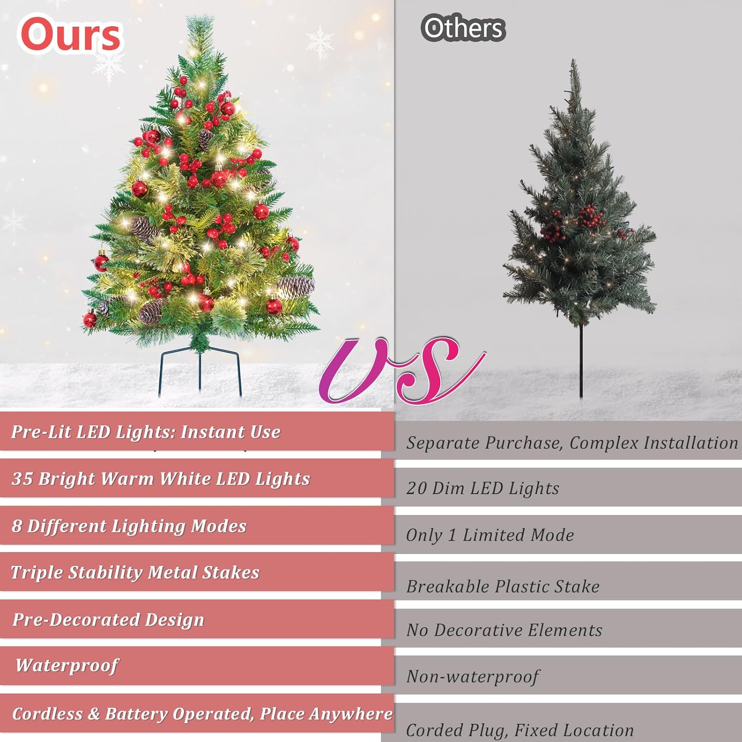 Pre-Lit with 35 LED Lights & 8 Flash Modes: Come with 35 warm white LED beads pre-strung on a 20.7 FT light string on each tree, these pathway Christmas trees ensure an easy and instant usage, saving you from second purchase and the painful threading process Moreover, these outdoor Christmas trees providing 8 different flash lighting for your option, you can set desired lighting mode to add more fun and decorative effects to the holiday season, making your space more lively and appealing.Battery Operated Cordless Design, Place in Anywhere You Like: These Xmas trees offer enhanced flexibility as it required no power outlet, no worries about wire mess, no extend cord needed, it is a safer and convenient holiday decor choice. Simply put on 3 AA batteries, stake these Christmas trees to the ground, containers or flower pots of porch, front door, patio, lawn, pathway, flower bed, garden, office, kitchen island and so on, enhancing the holiday cheer for an enjoyable festive season.