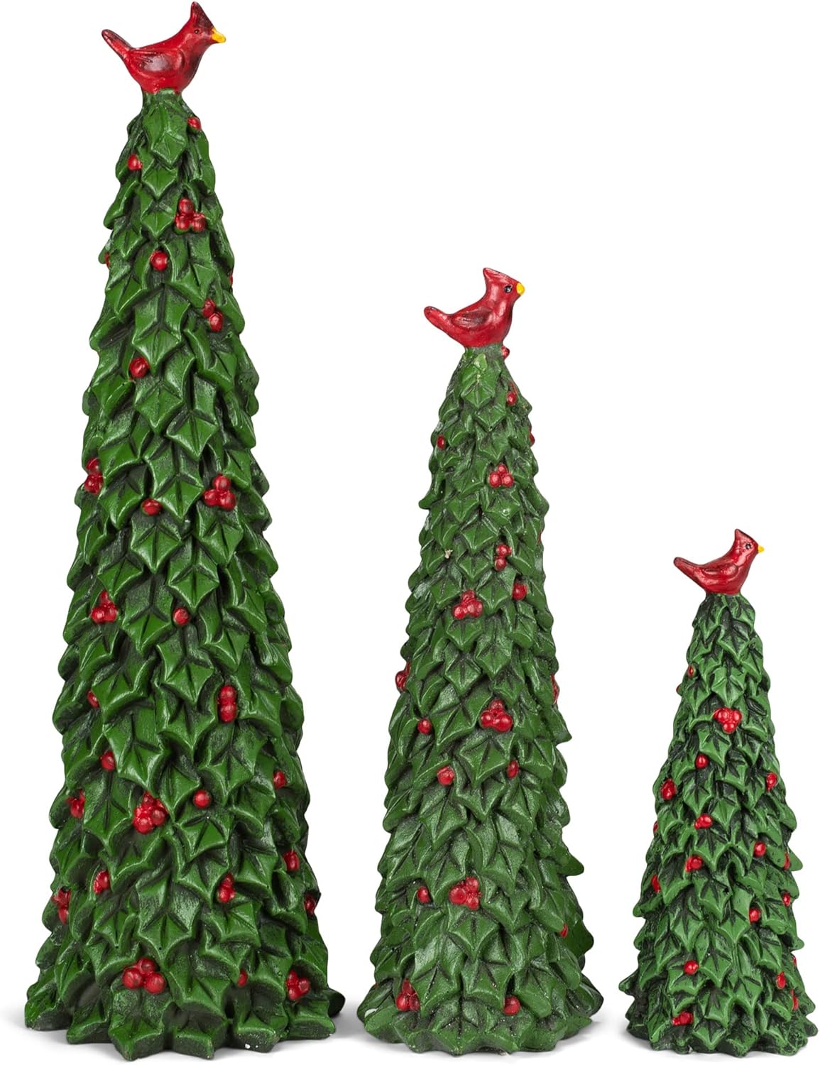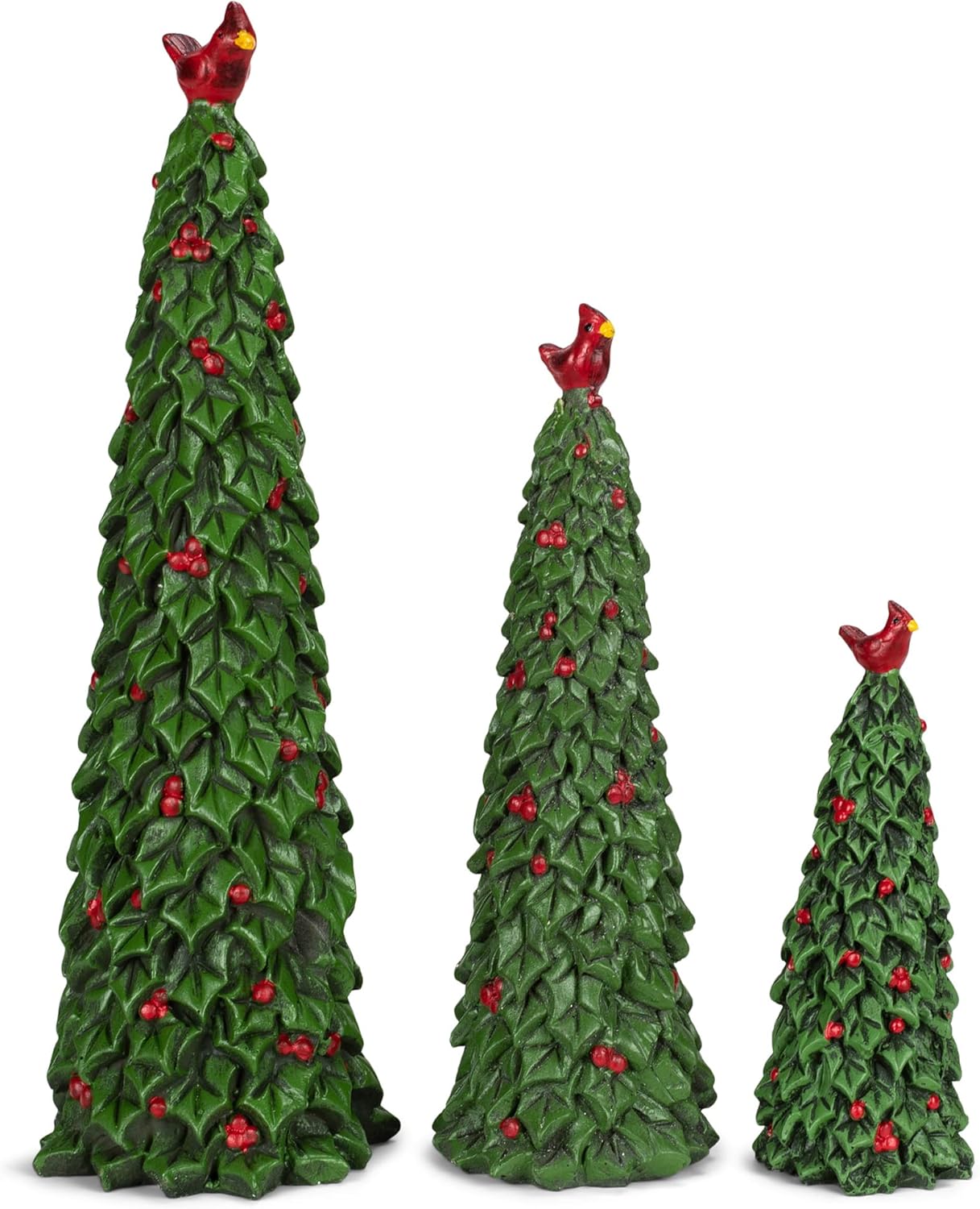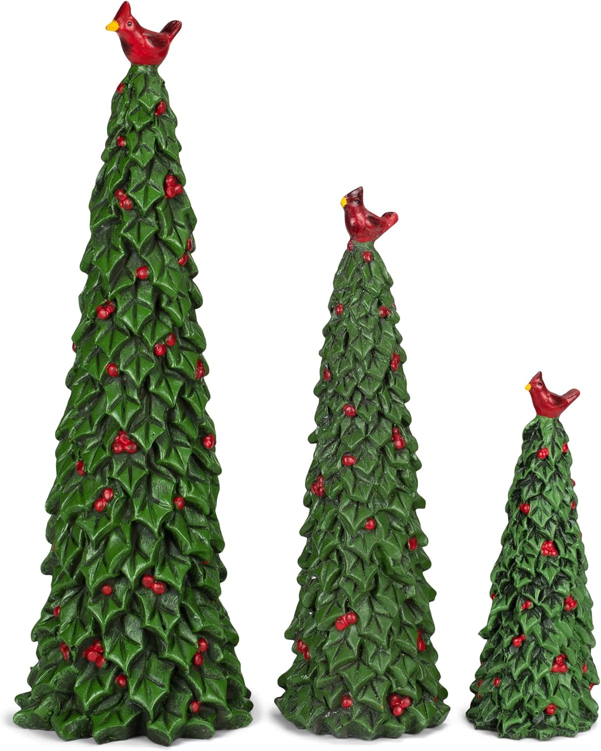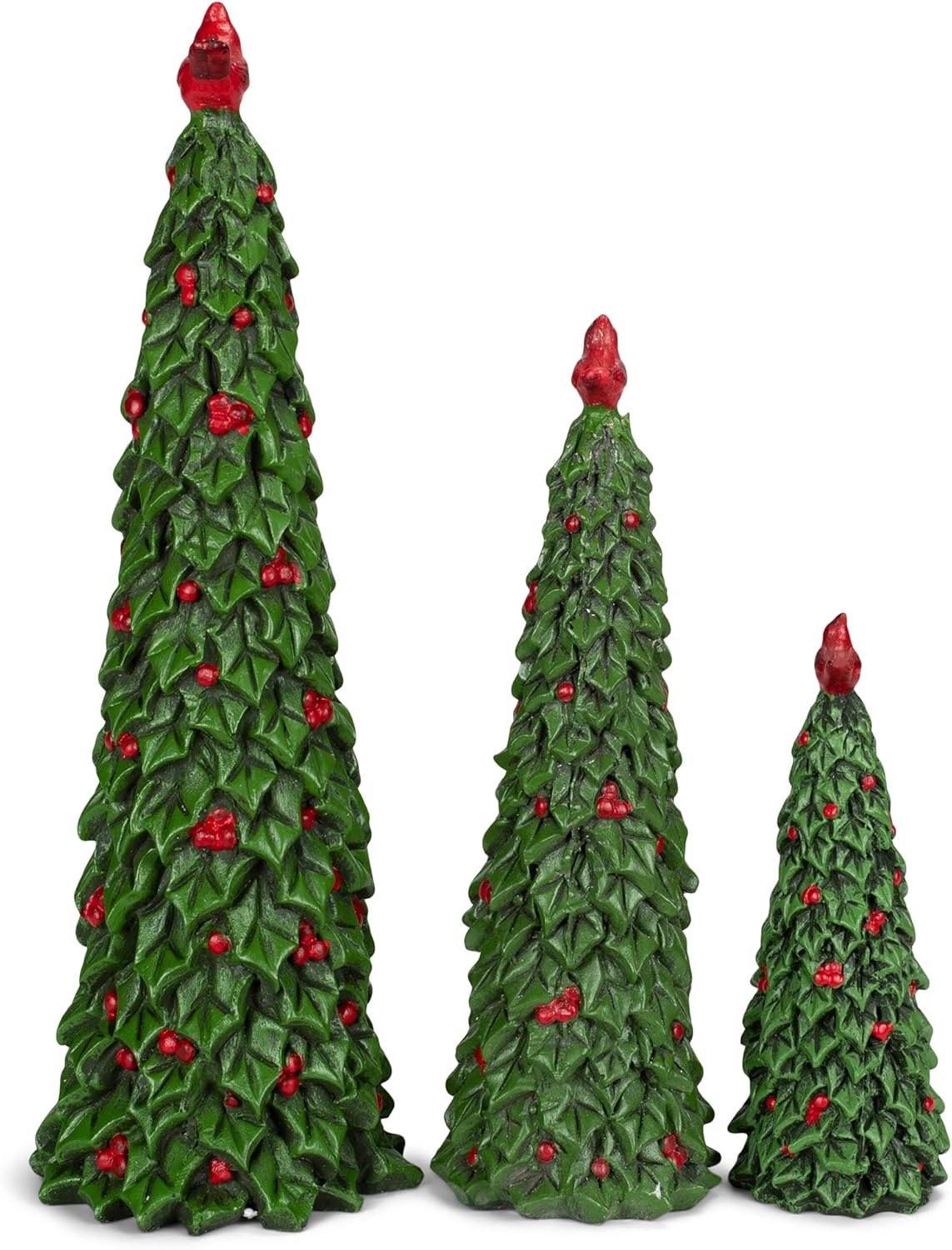 Set of 3 Sculpted Resin Holly Christmas Trees with Red Cardinals and Berries, 6, 9 and 12 Inches High