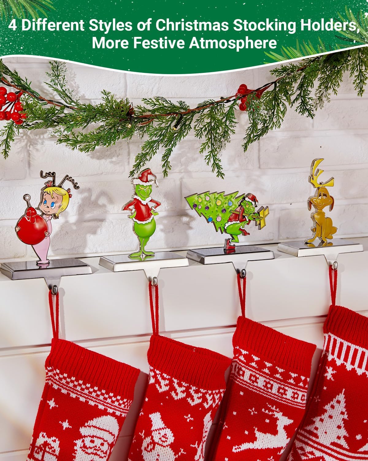 Set of 4 Christmas Stocking Holders for Mantle, 2D Metal Christmas Tree Santa Claus Stocking Hangers, Home Xmas Decorations for Fireplace Mantel Table Garland