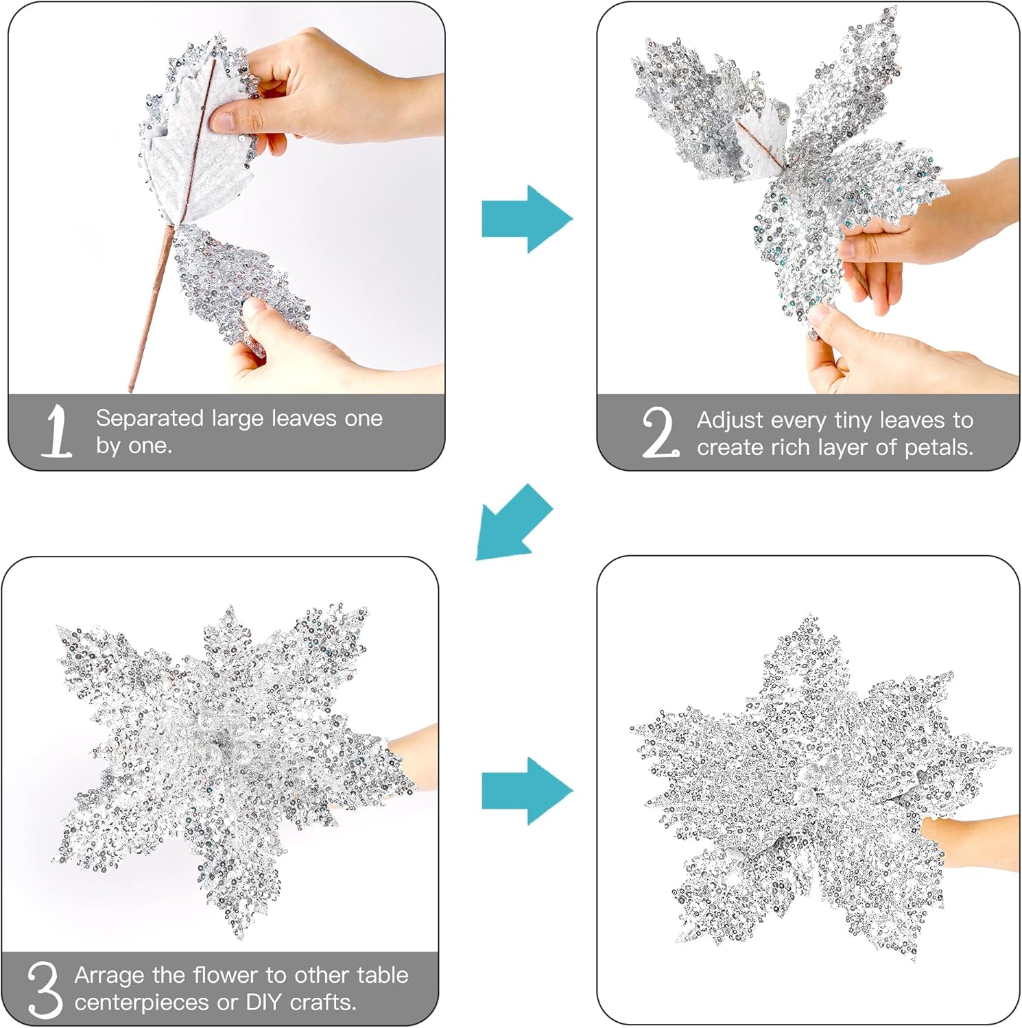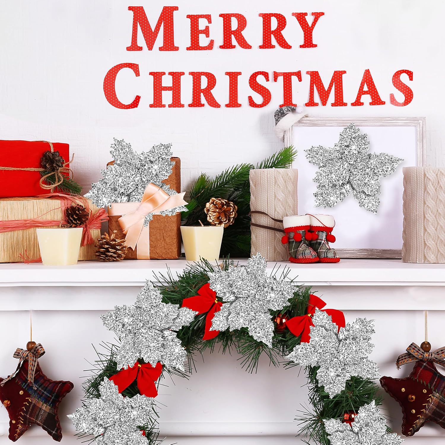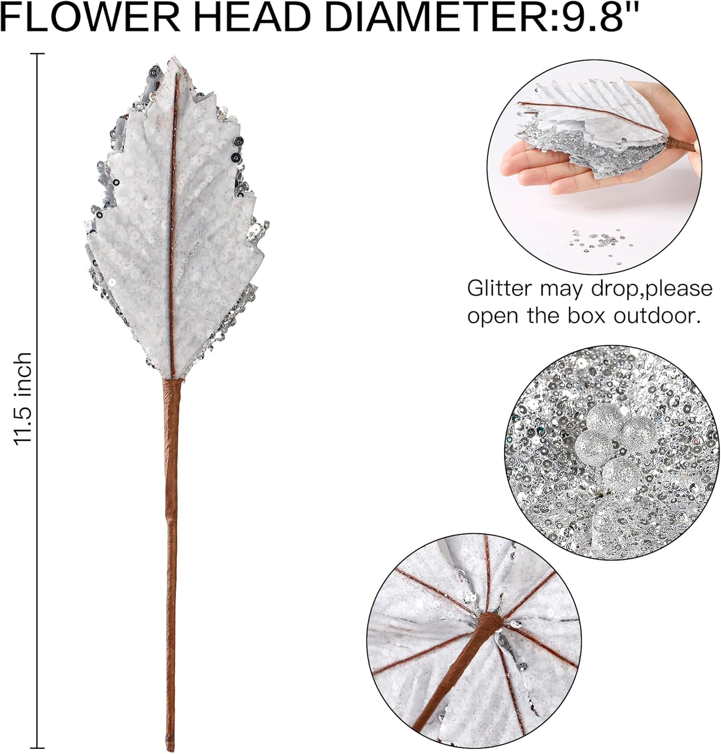 Sggvecsy 10 Pcs Christmas Glitter Flowers 9.8inch Christmas Tree Ornaments Shining Artificial Poinsettia Stems Floral Picks for Xmas Holiday Wedding Wreath Party Floral Decorations(Silver)
