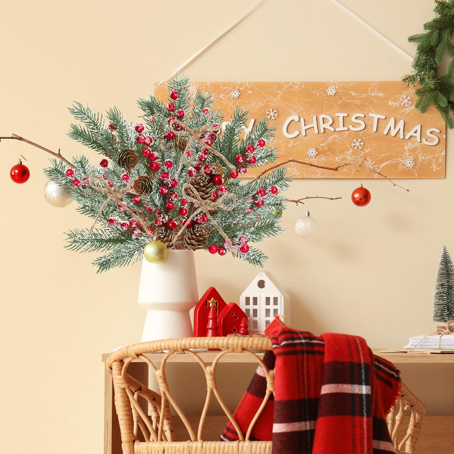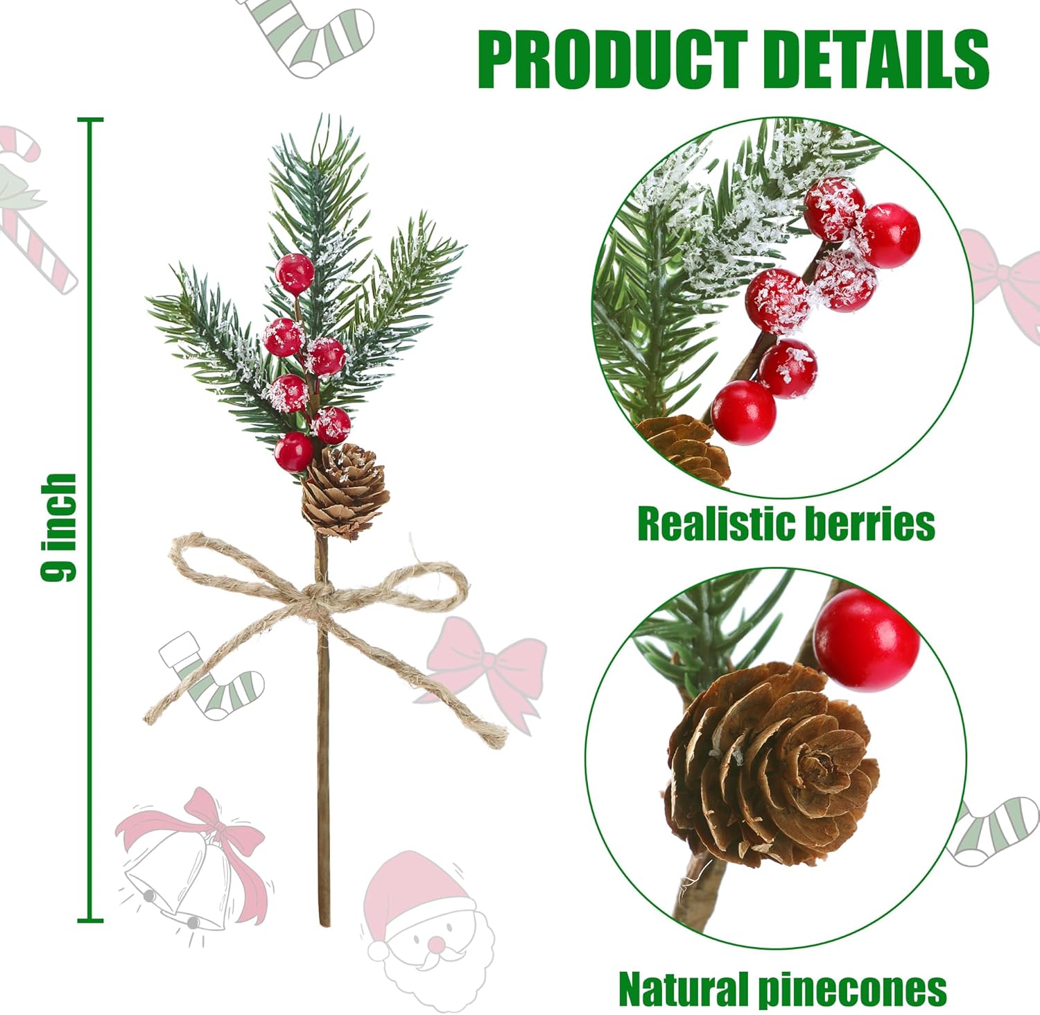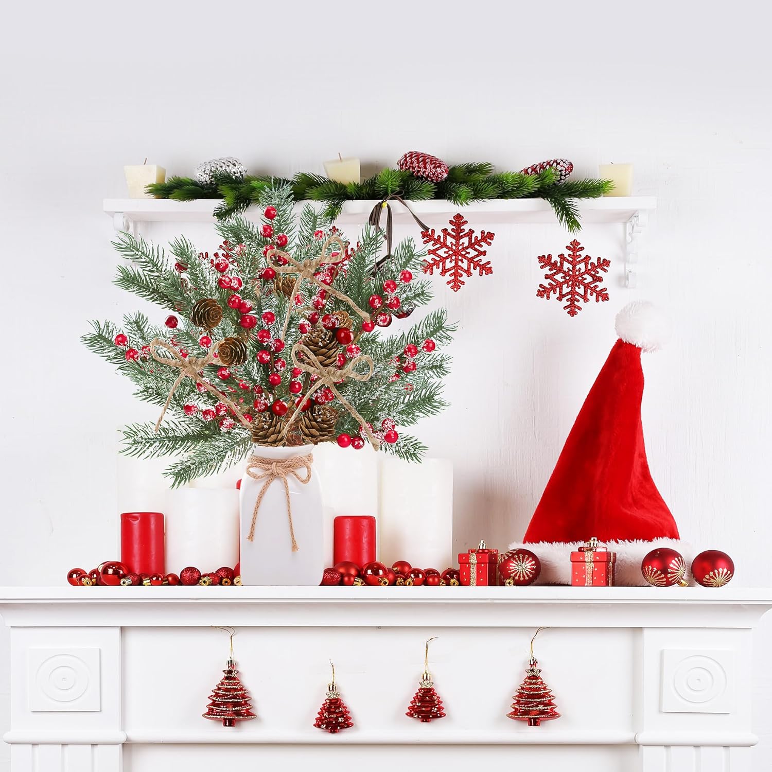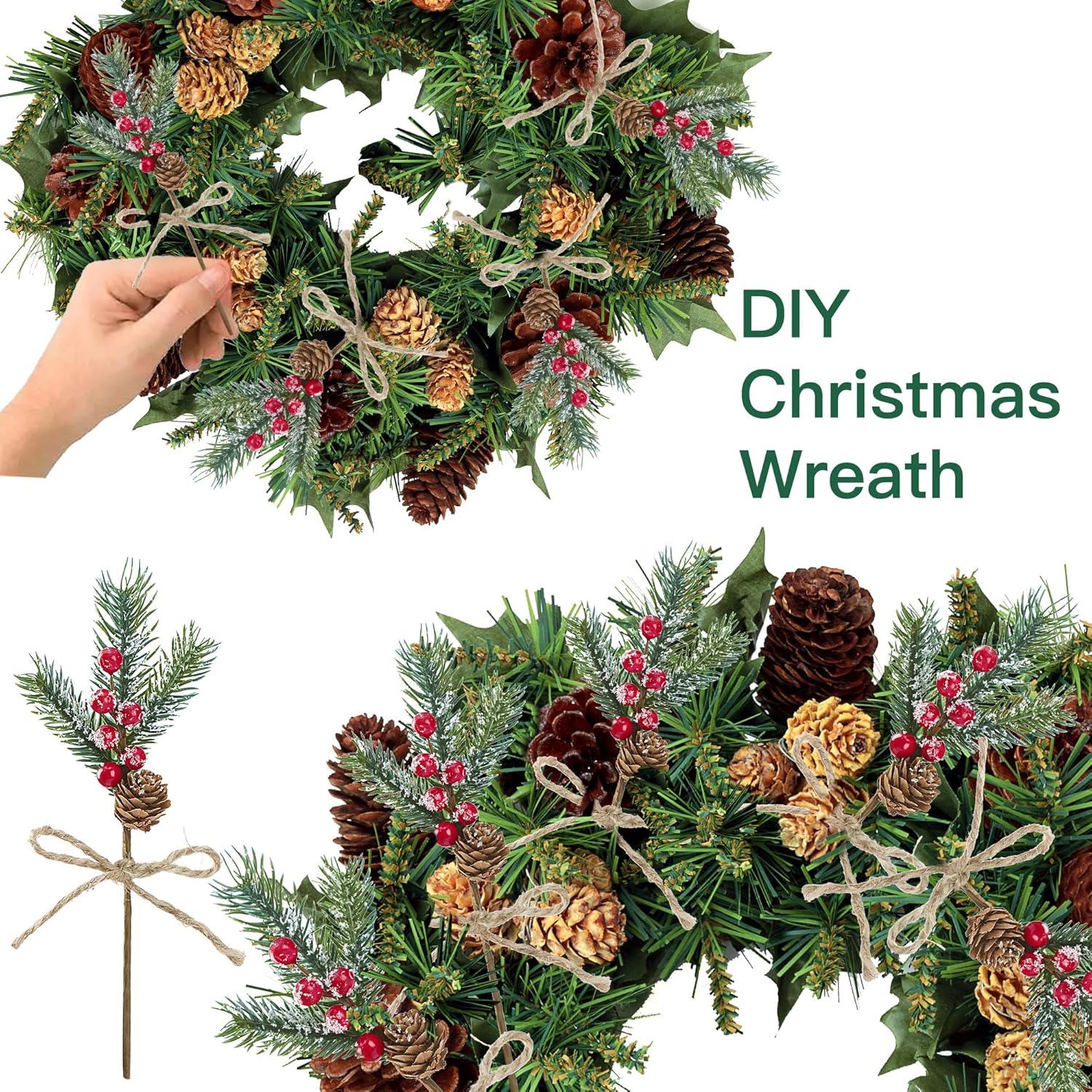 Sggvecsy 15 Pack Snow Frosted Christmas Berries Pine Picks Artificial Red Berry Pine Branches Frosted Faux Pine Stem with Pine Cones Fake Pine Needles for Xmas Tree Wreath DIY Craft Holiday Decor