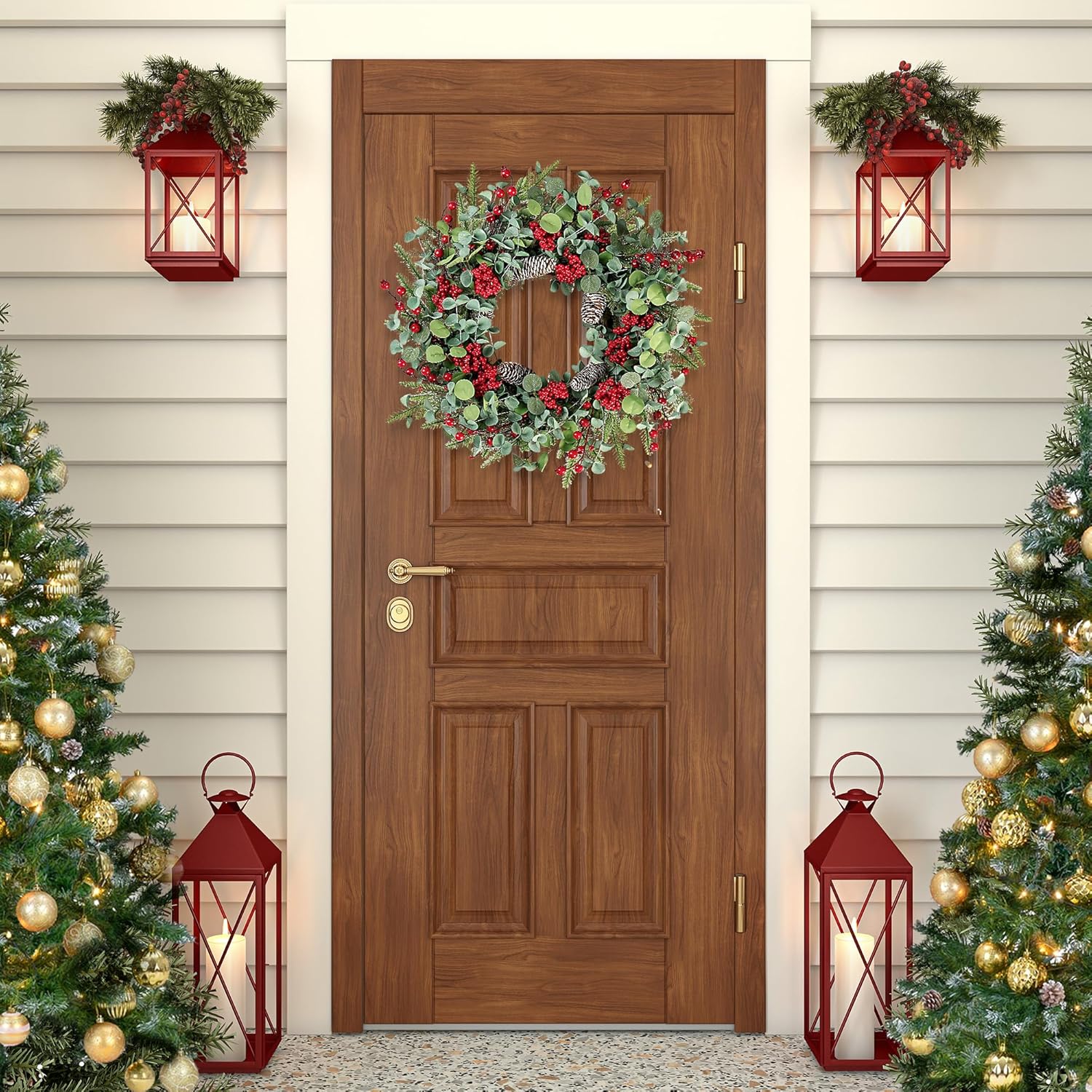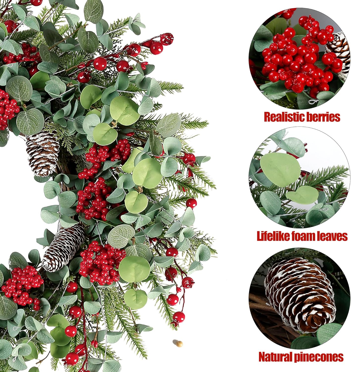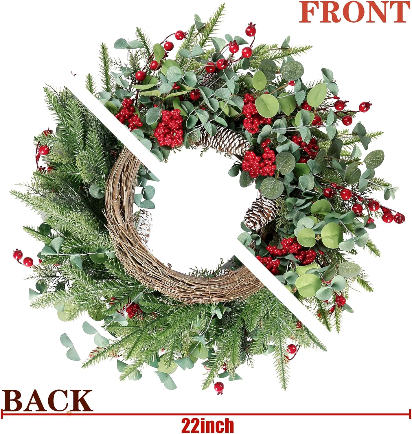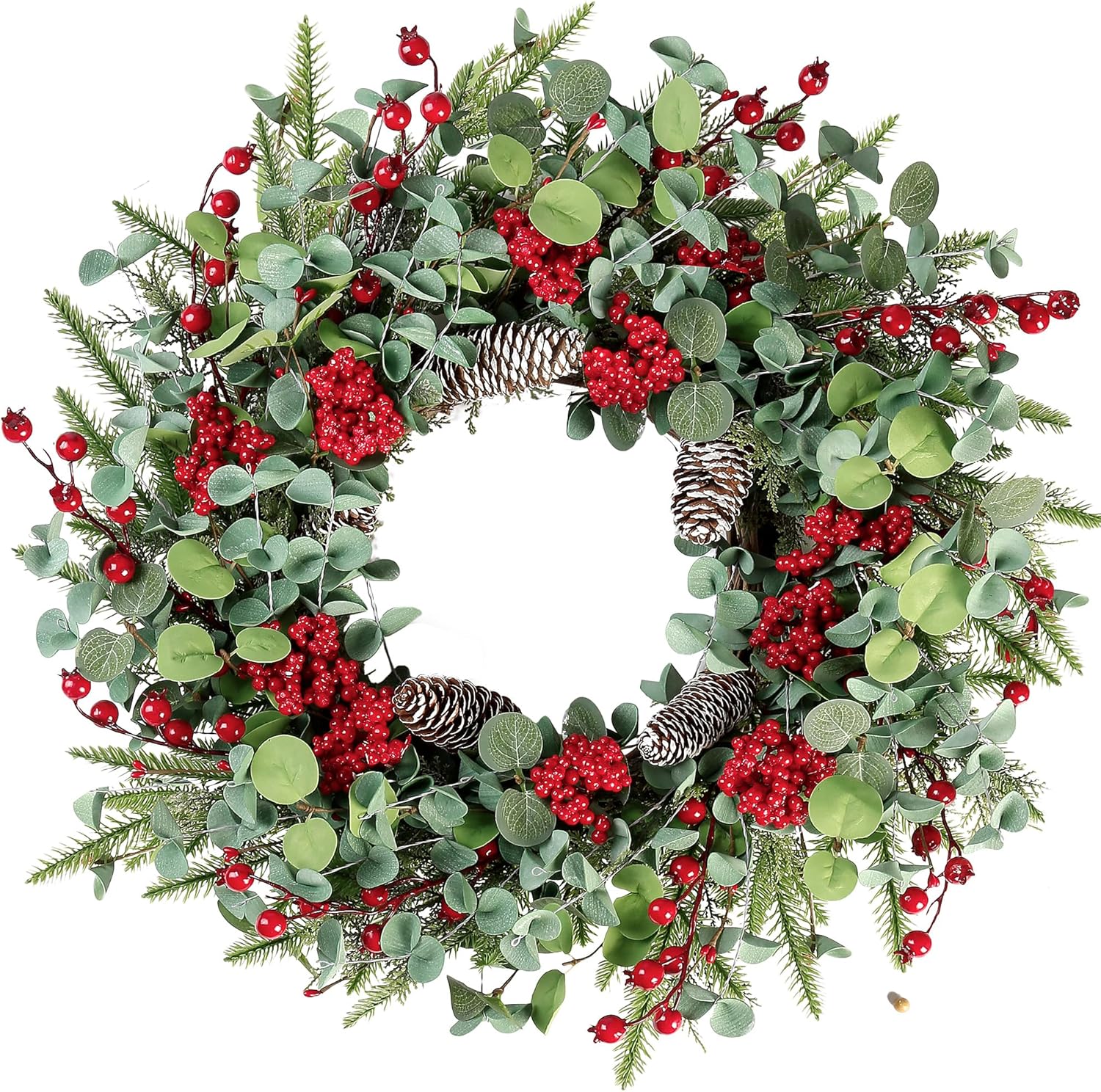 Sggvecsy 22 Inch Artificial Christmas Wreath for Front Door Xmas Red Berry Wreath with Pine Needles Pine Cones Eucalyptus Leaves Christmas Decorations for Winter Wall Outdoor Home Holiday Xmas Decor