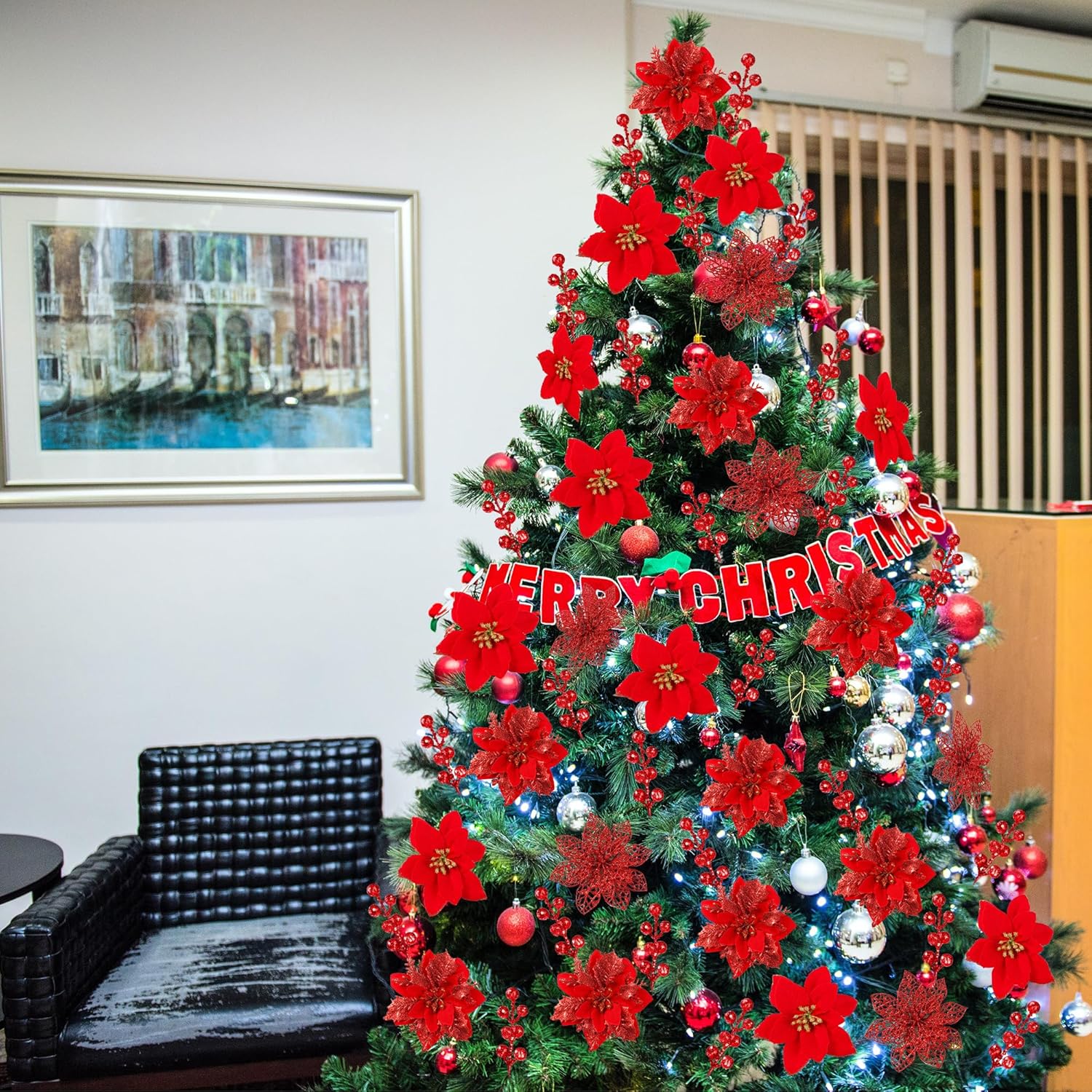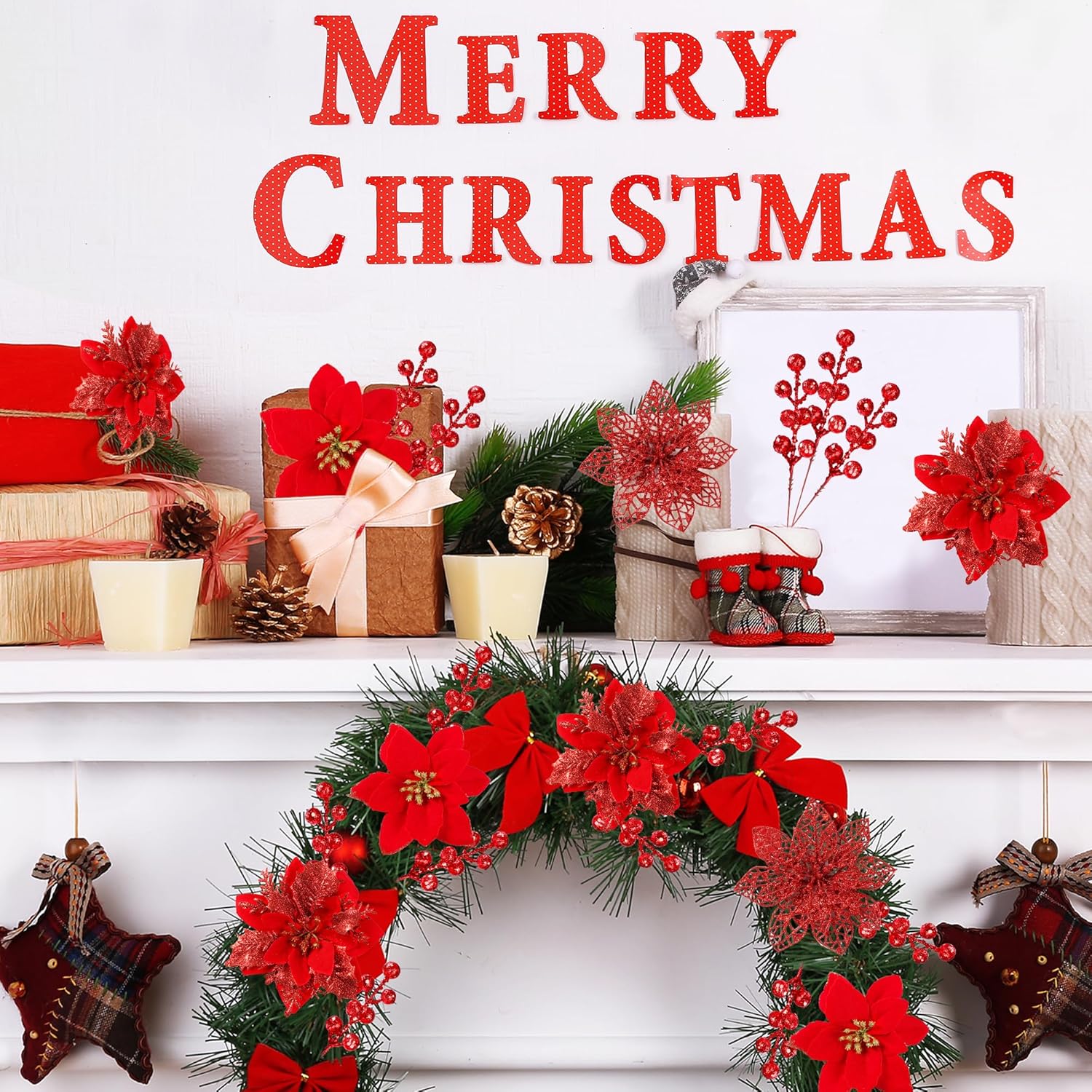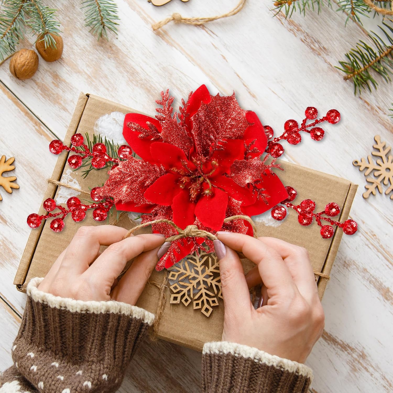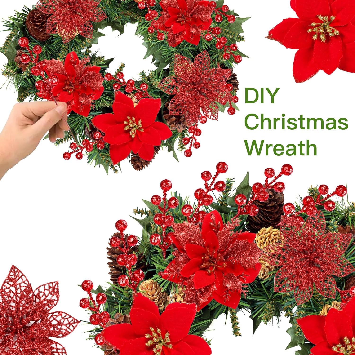Sggvecsy 30 Pcs 3 Styles Christmas Glitter Poinsettia Flowers Artificial Berry Picks Christmas Tree Ornaments Artificial Christmas Flowers with Clips for Xmas Wedding Wreath Floral Decorations(Red)