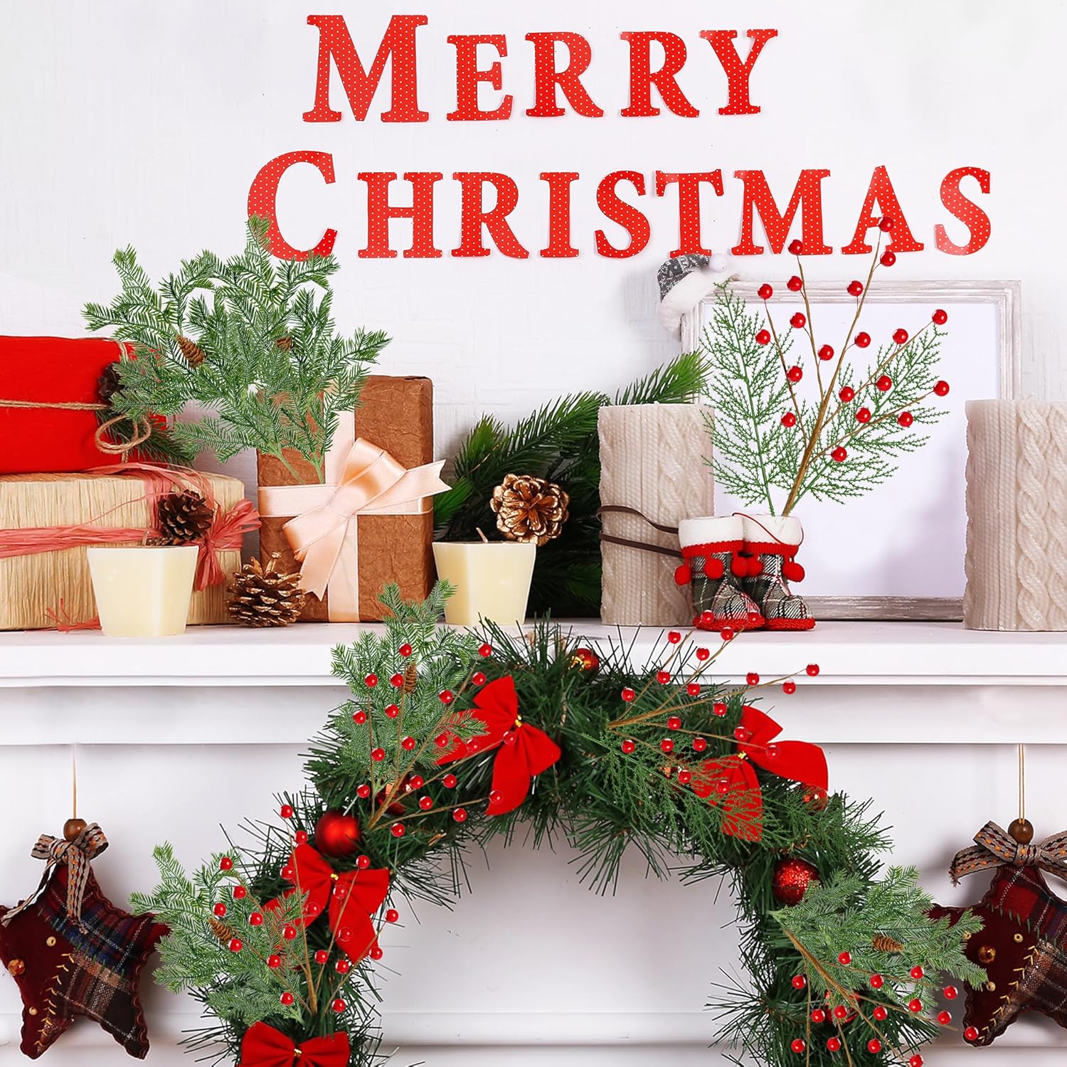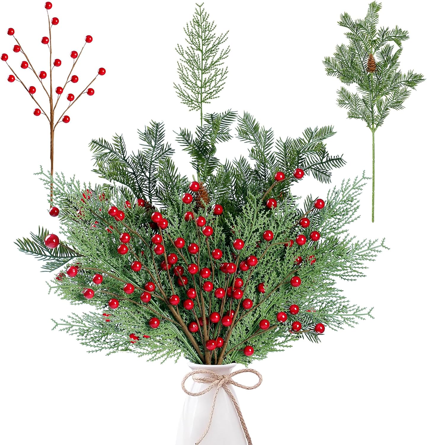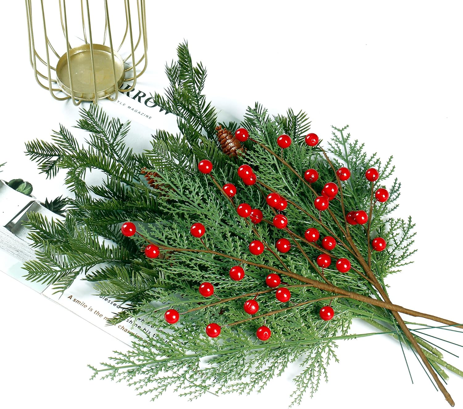 Sggvecsy 30 Pcs Artificial Pine Branches Fake Greenery Pine Picks with Pine Cones Artificial Red Berry Branches Christmas Pine Needles for DIY Wreath Xmas Embellishing Flower Arrangements Decoration
