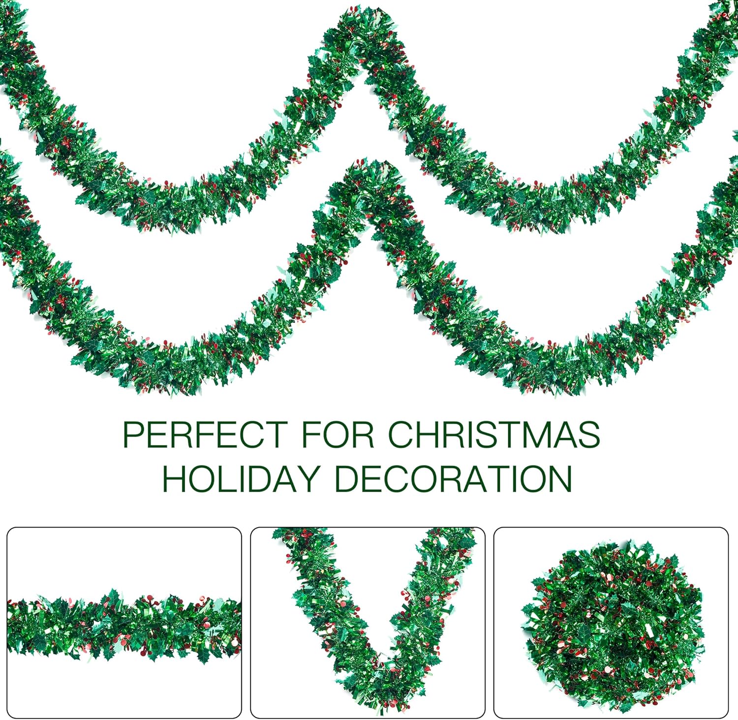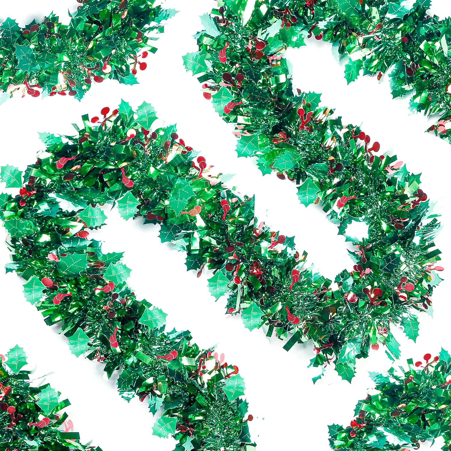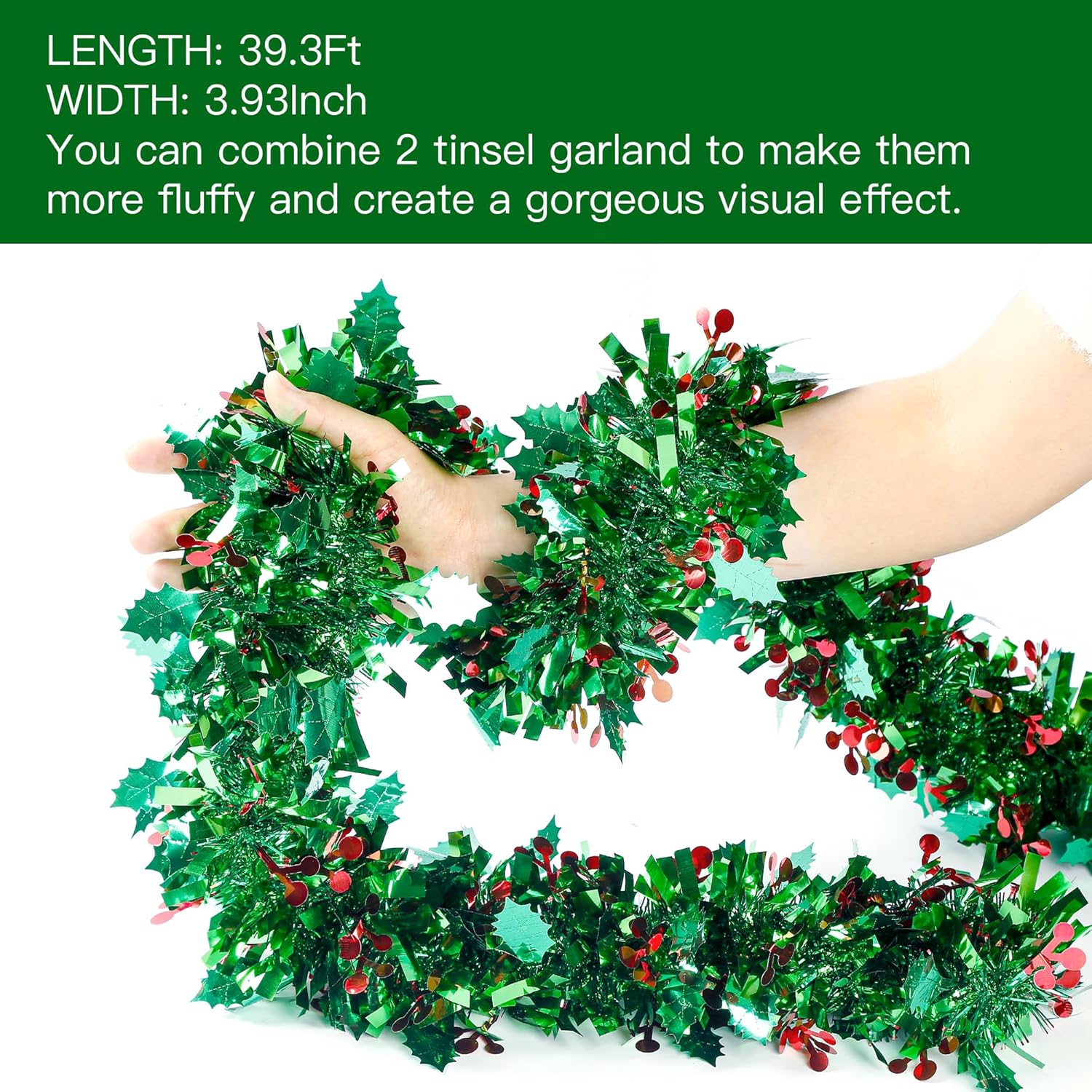 Sggvecsy 39.37Ft Christmas Red Berry Tinsel Garland Xmas Tree Decorations Green Leaves Christmas Metallic Twist Garland Ceiling Hanging Decorations for Year Party Holiday Indoor Outdoor Supplies