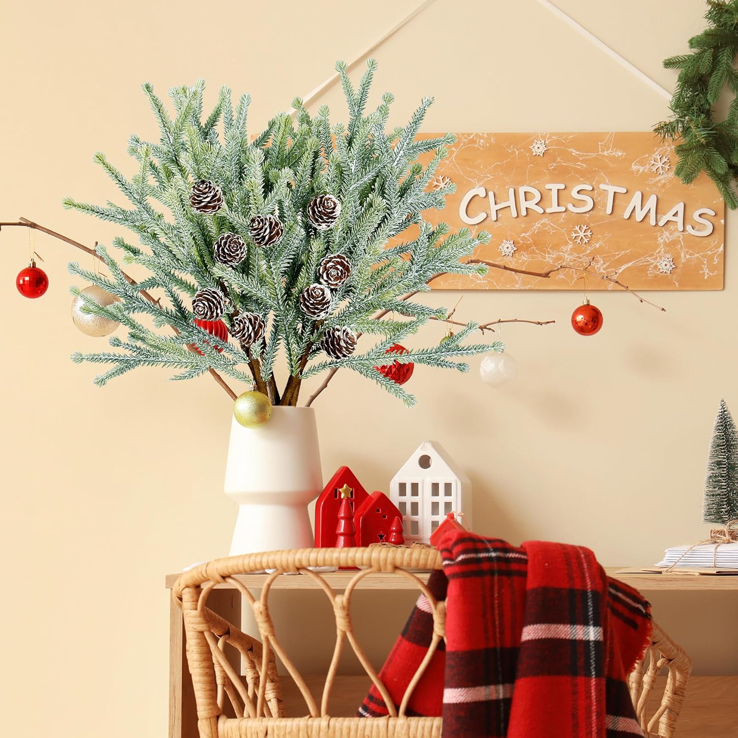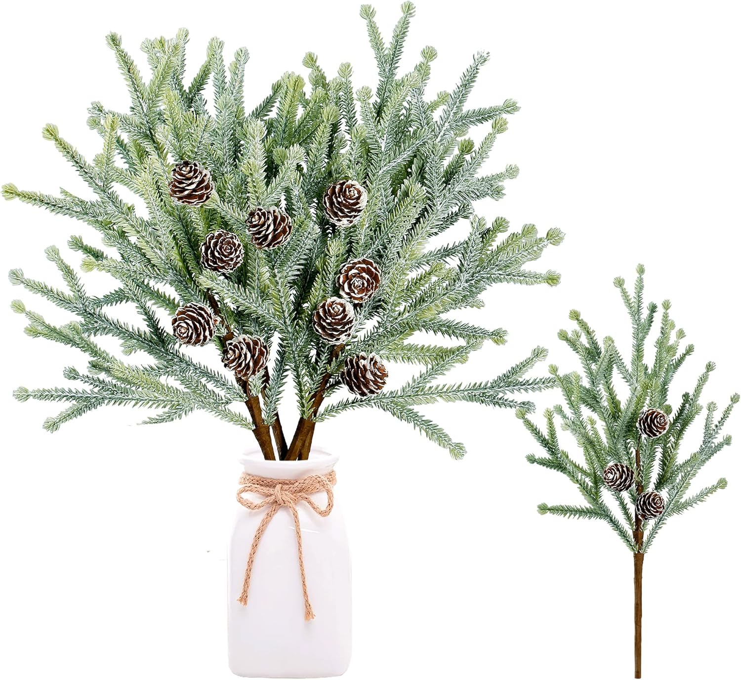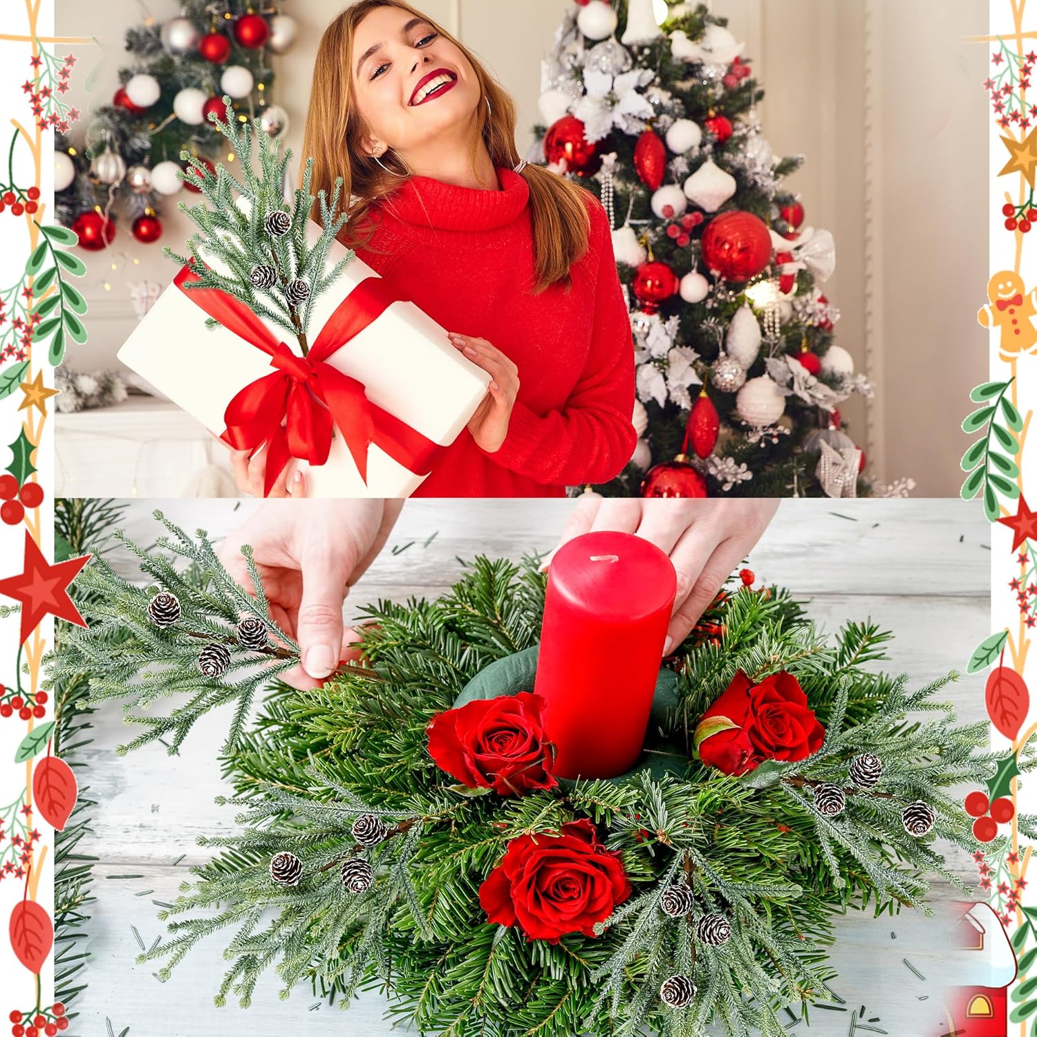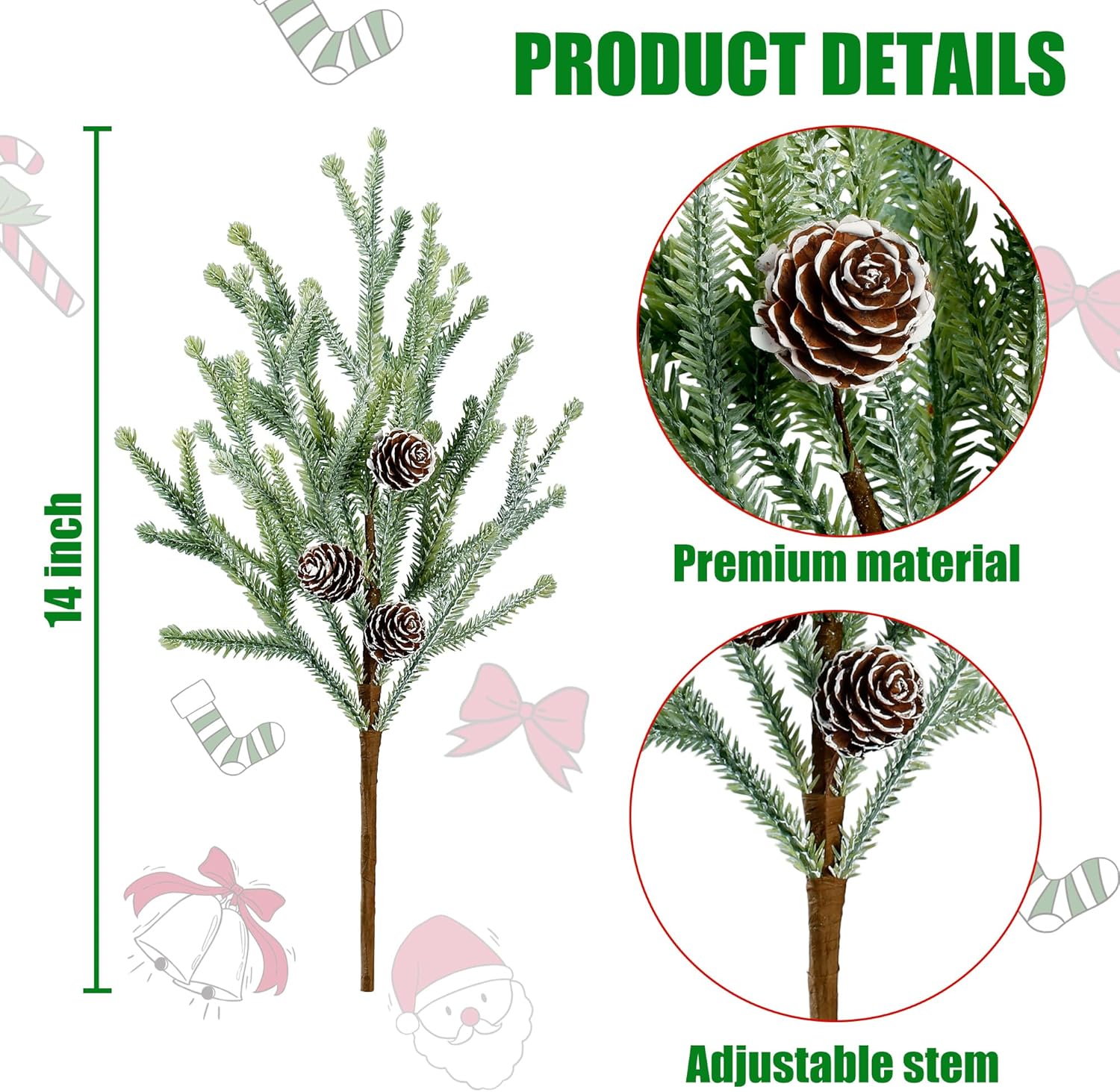 Sggvecsy 4 Pack Snow Frosted Christmas Pine Picks with Pine Cones Frosted Artificial Pine Branches Faux Pine Stem Christmas Pine Needles for Xmas Tree Wreath DIY Craft Holiday Decor (Red)