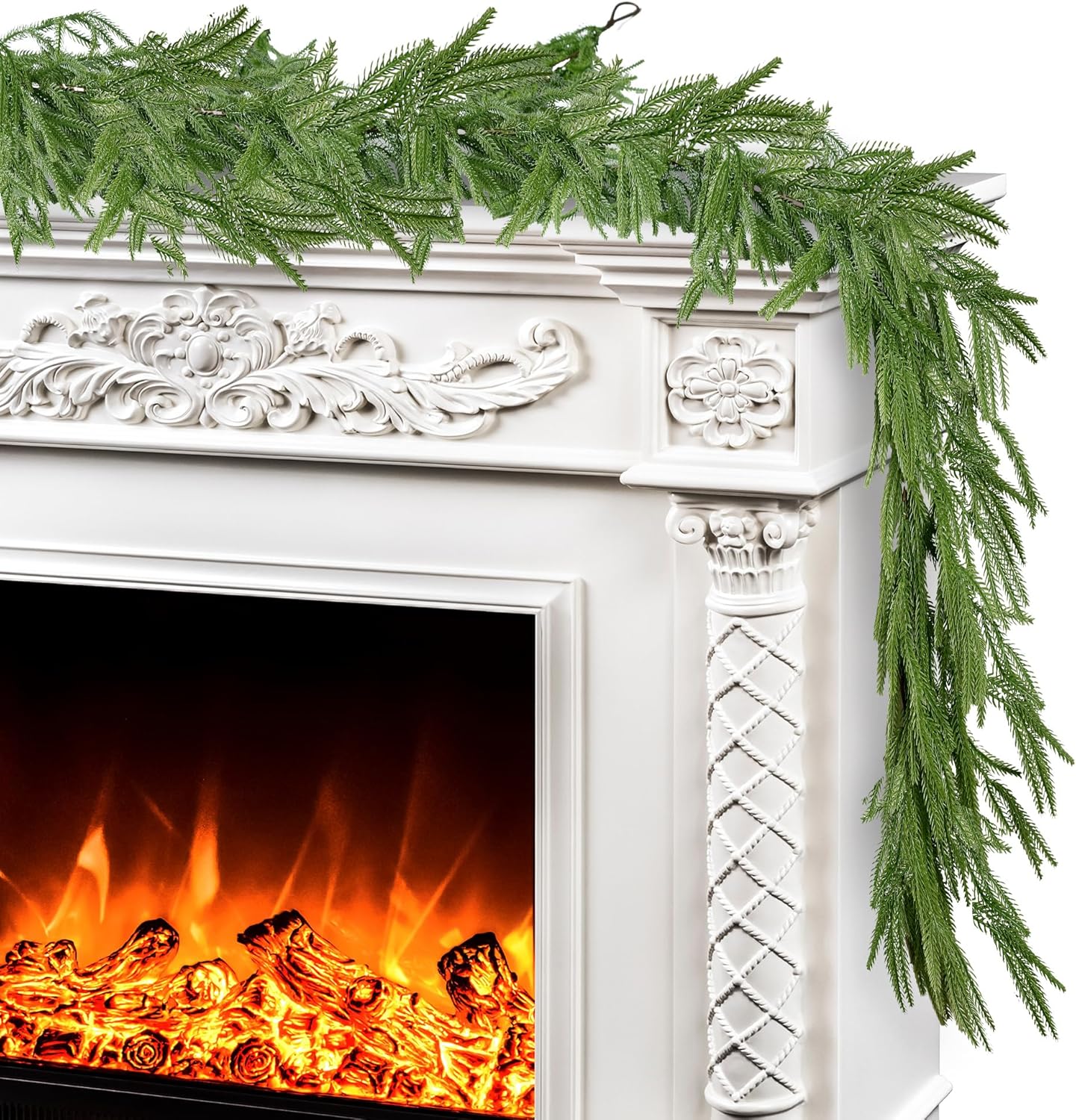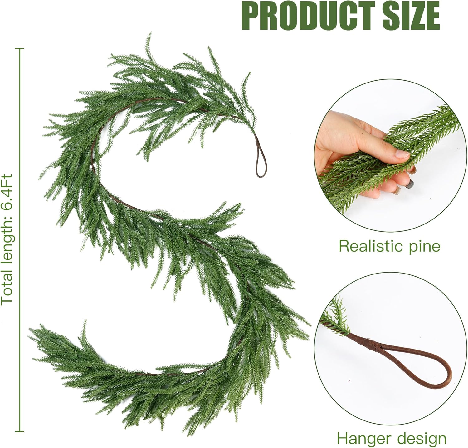 [PREMIUM MATERIAL & ADJUSTABLE GARLAND]:The Christmas Fork Norfolk pine garland are made of high quality plastic,soft and flexible. Inside the garland stem is iron wire, the artificial Christmas garland is flexible, so you can shape the garland ly as you wish.[PACKAGE & SUITABLE SIZE]:The real touch artificial pine greenery garland is total 6.4ft, adequate enough to match many holiday ornaments and satisfy your diverse. Due to transportation, the garlands have been slightly bent, please adjust the garland into original shape after receiving.
