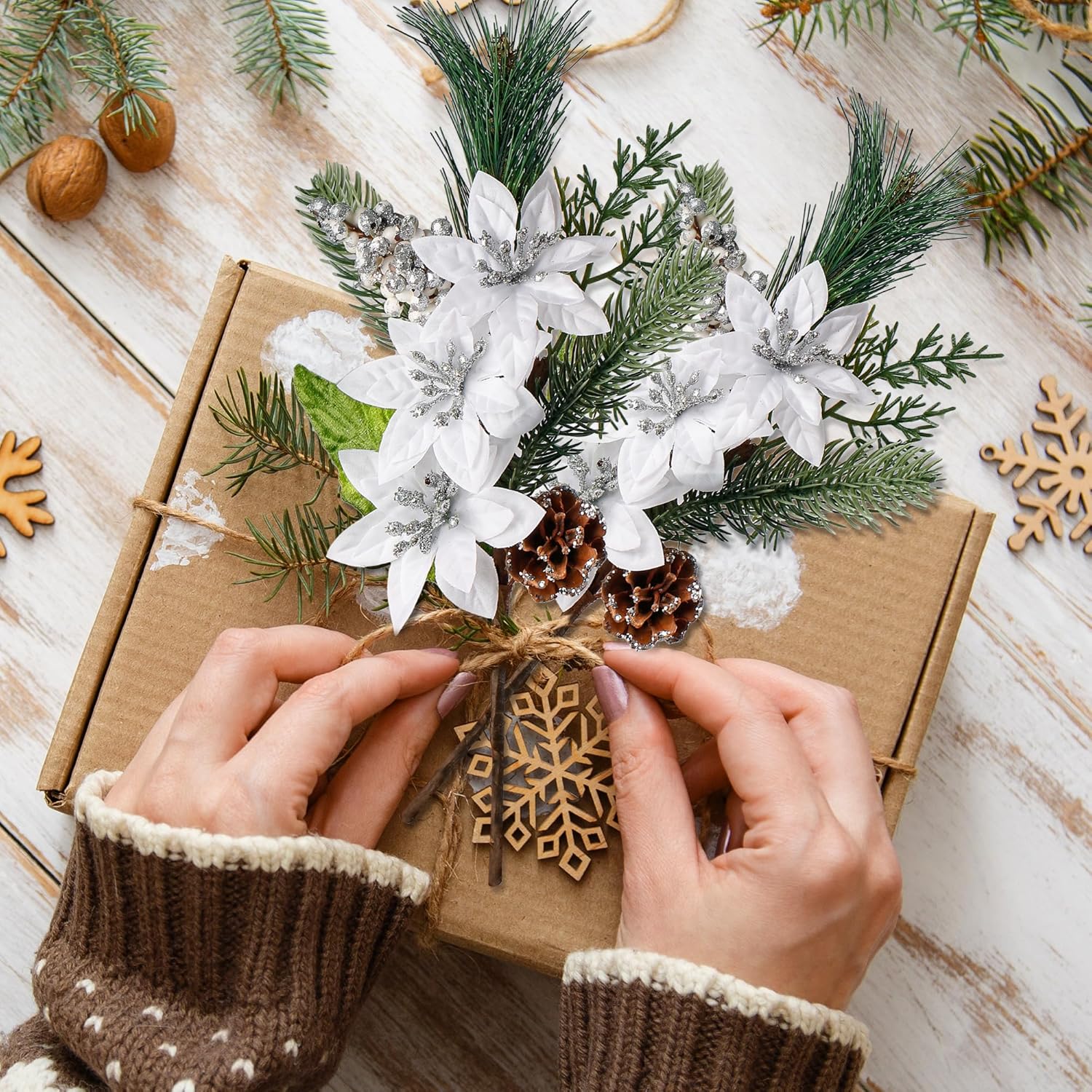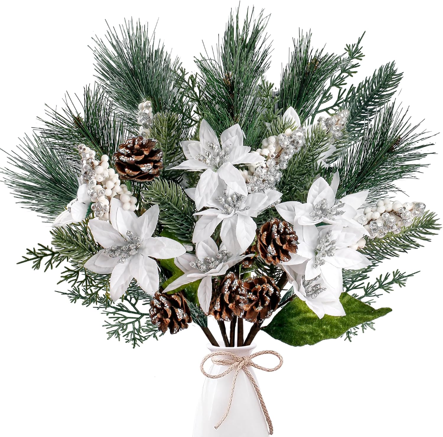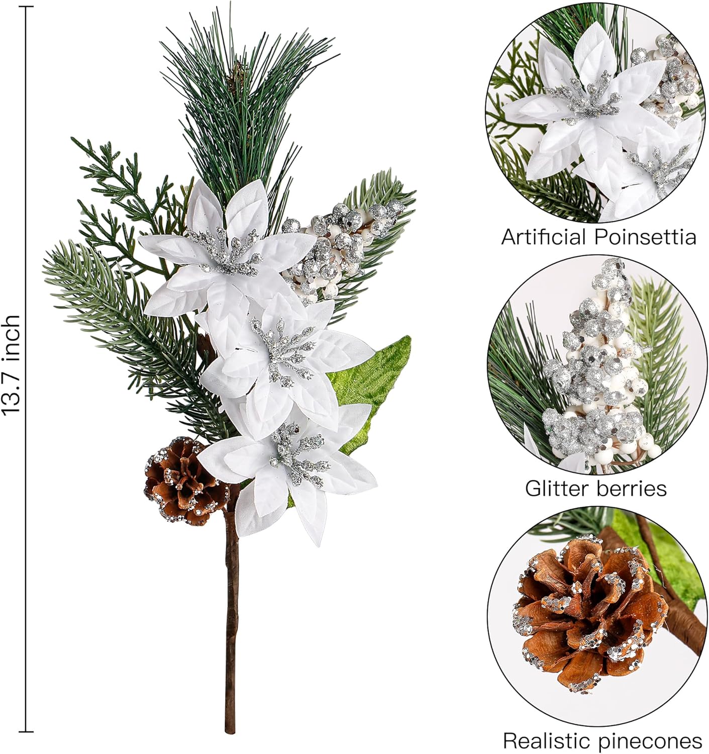 Sggvecsy 6 Pack Artificial Christmas Poinsettia Picks Faux Berries Pine Stems Berry Pine Branches with Pine Cones Poinsettia for Xmas Tree Wreath DIY Craft Floral Arrangement Holiday Decor (Silver)