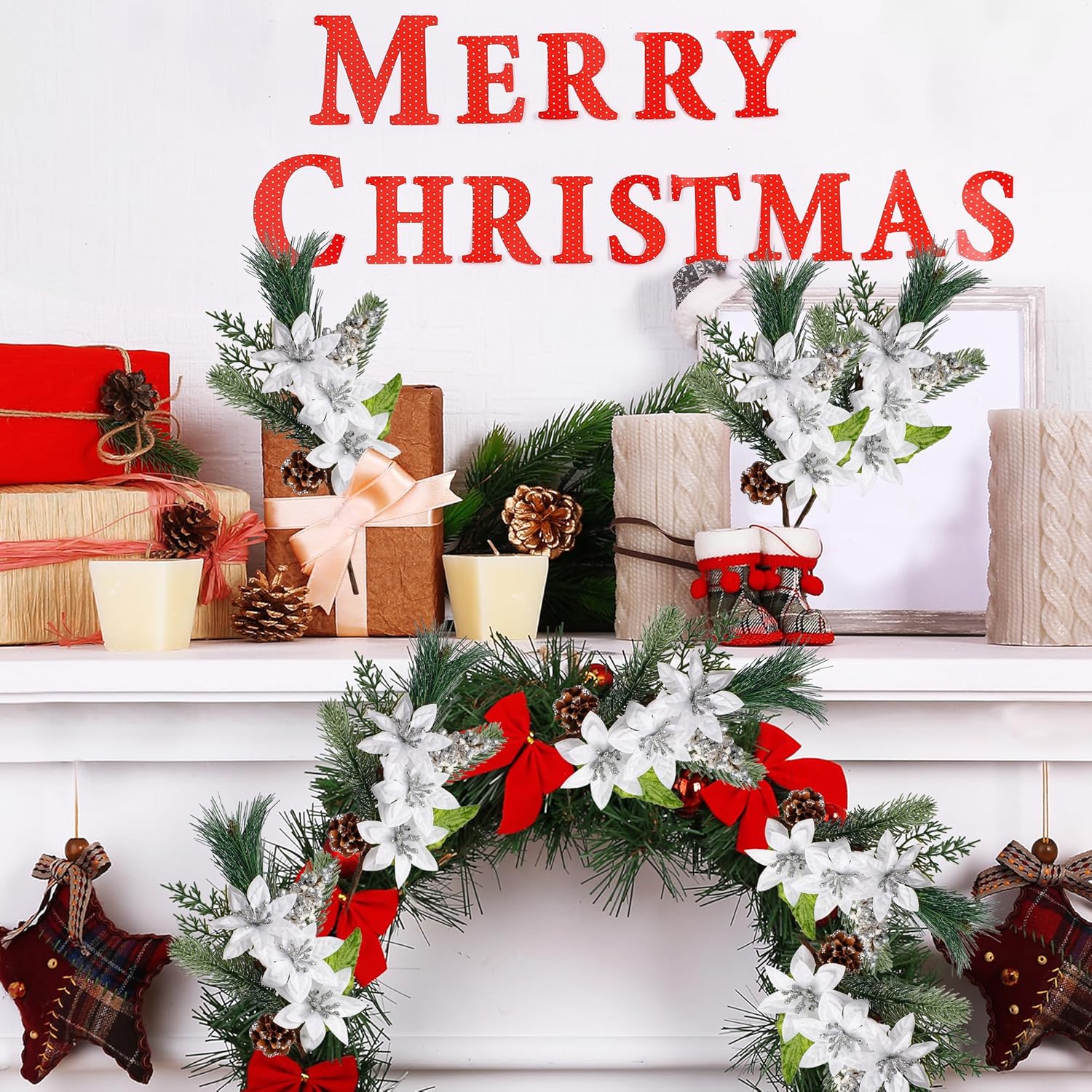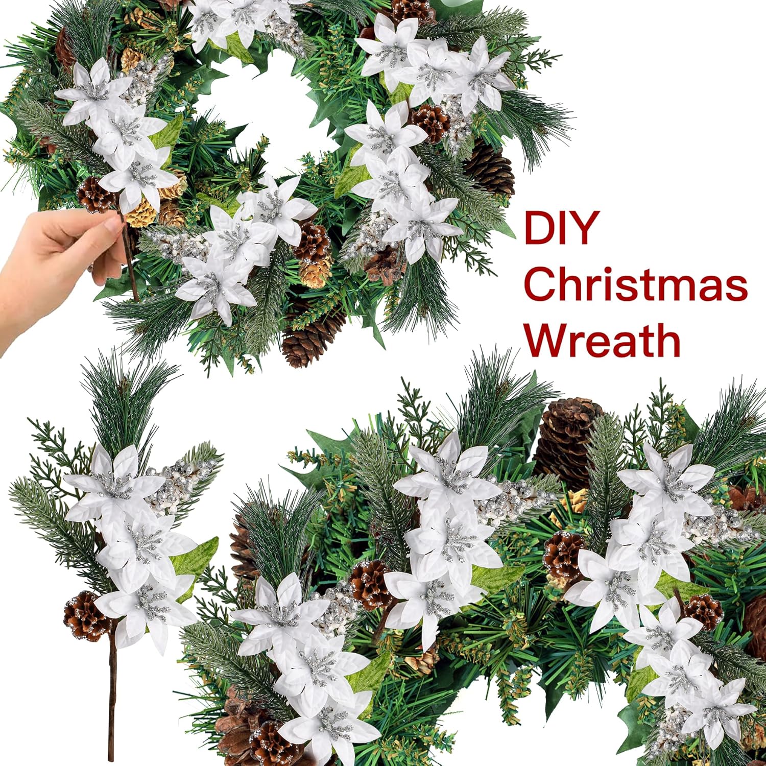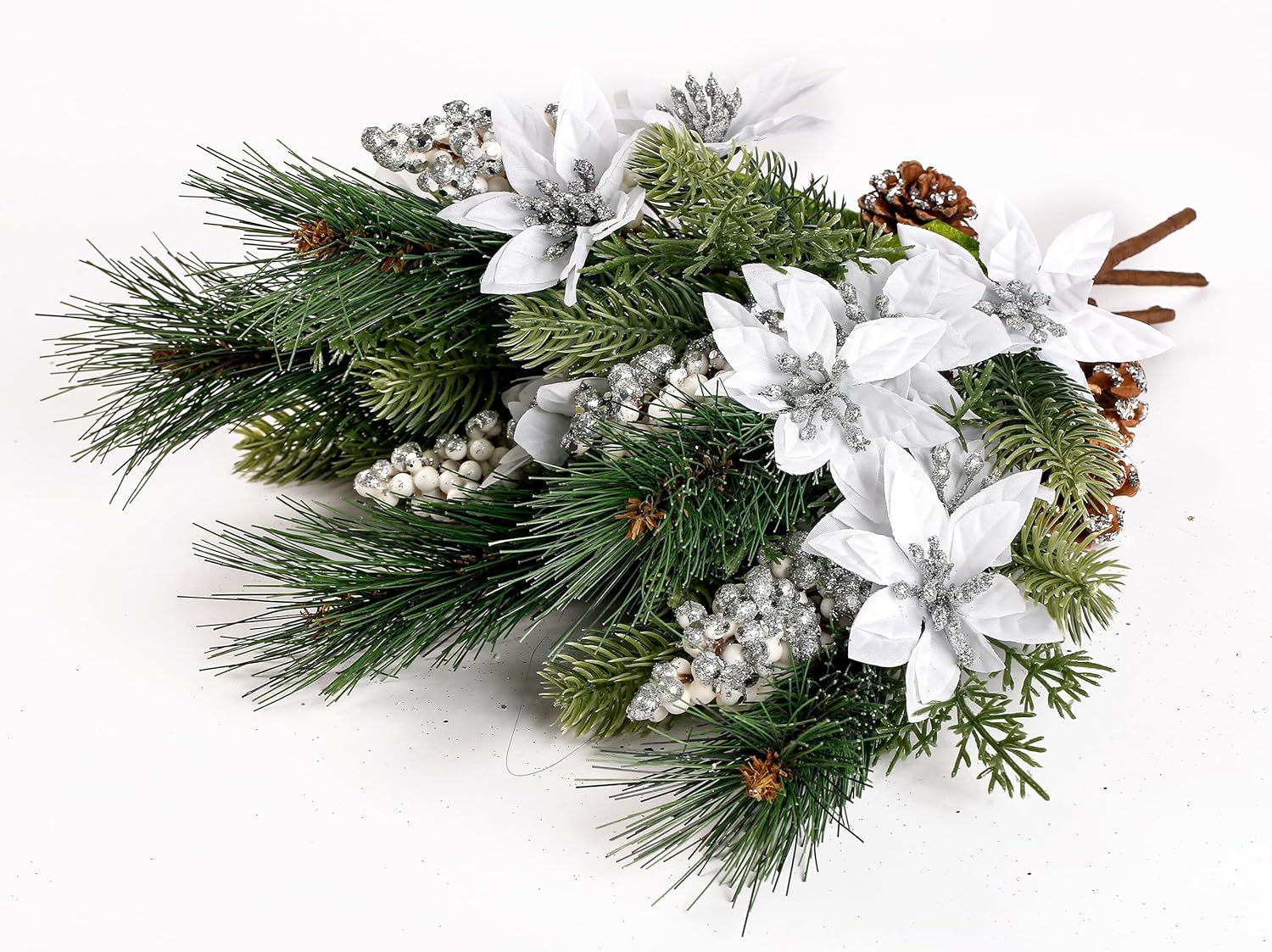 Sggvecsy 6 Pack Artificial Christmas Poinsettia Picks Faux Berries Pine Stems Berry Pine Branches with Pine Cones Poinsettia for Xmas Tree Wreath DIY Craft Floral Arrangement Holiday Decor (Silver)