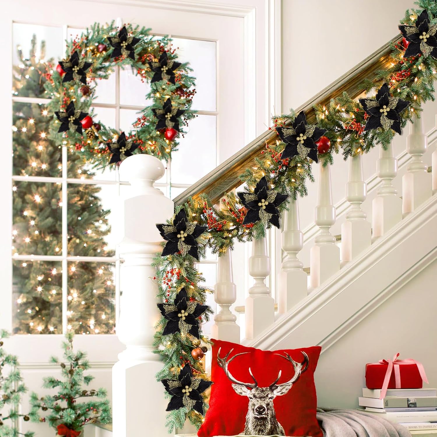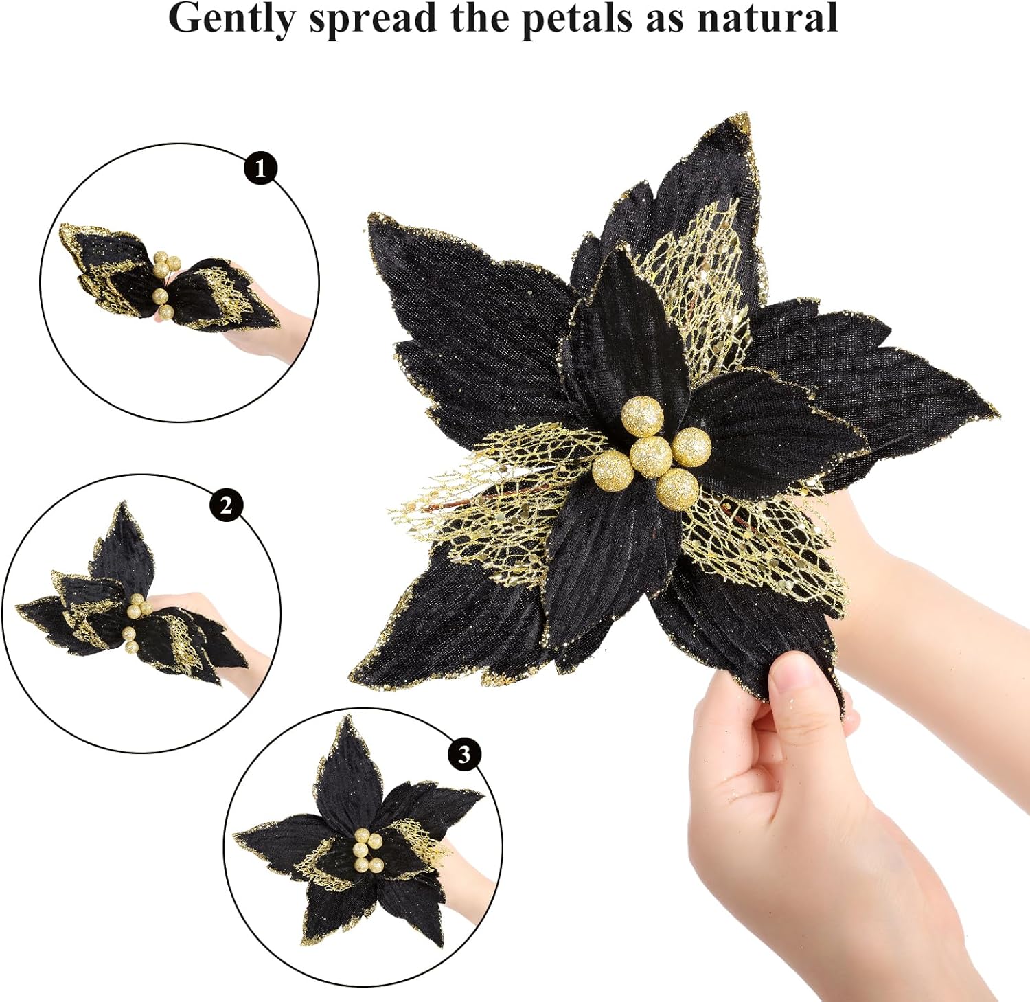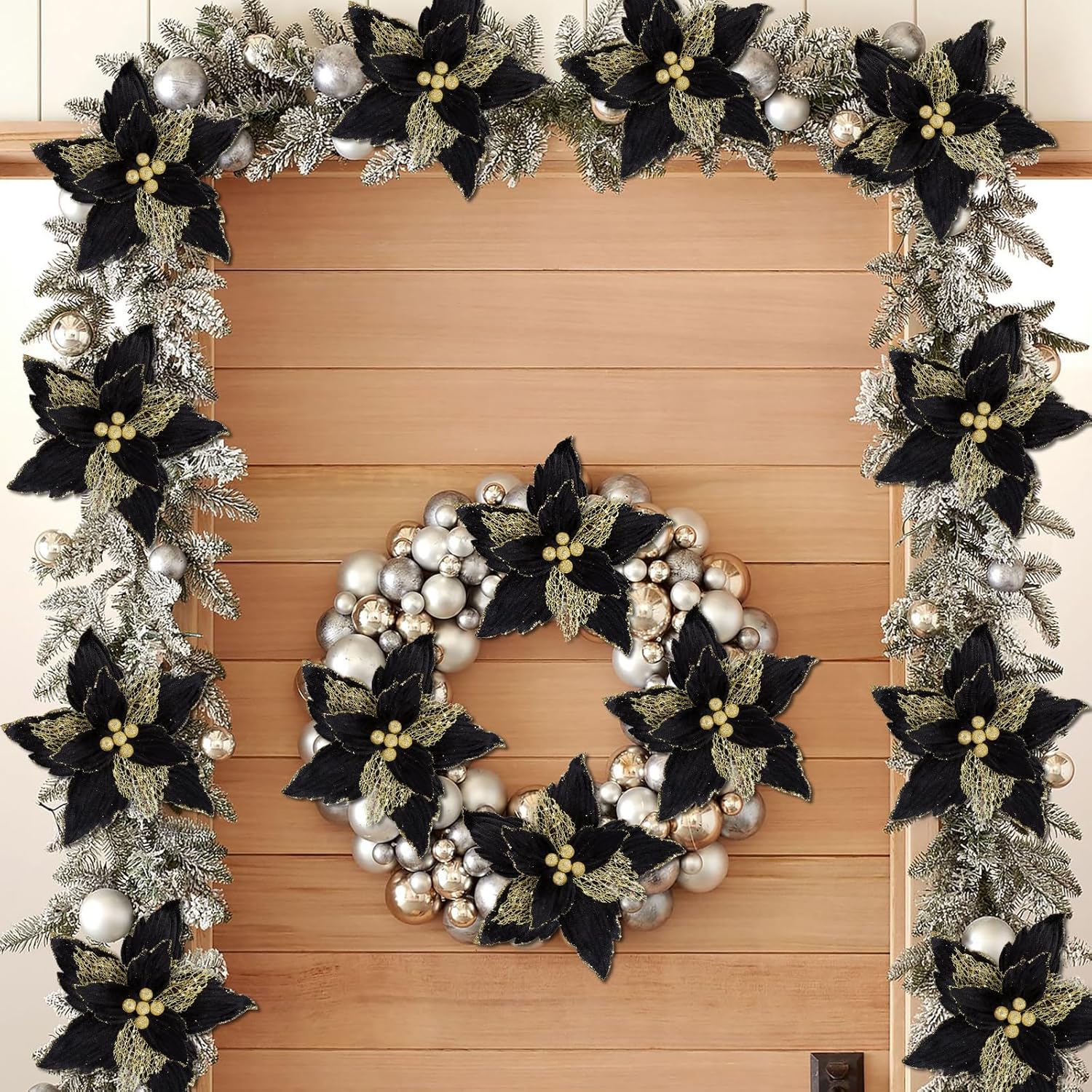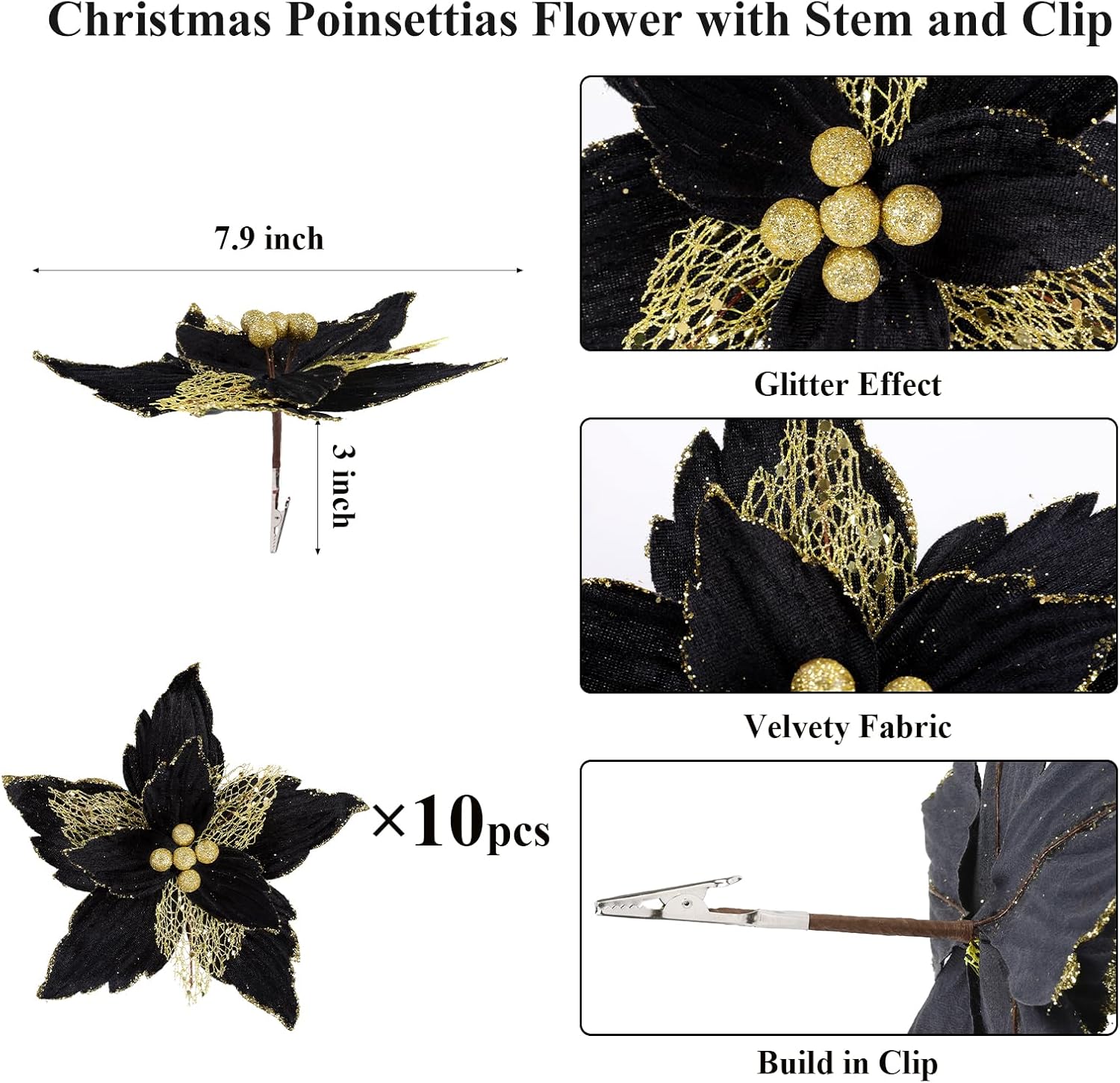 SHACOS 10 pcs 7.8" Artificial Black Gold Christmas Poinsettia Flowers Clips on Glittery Velvet Floral Picks Christmas Tree Ornaments Wreath Garland Decoration